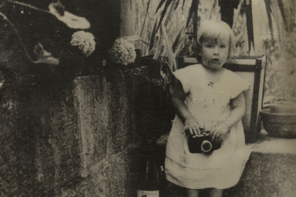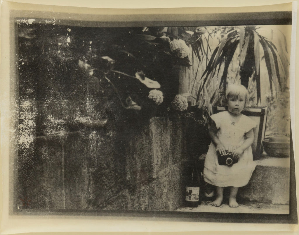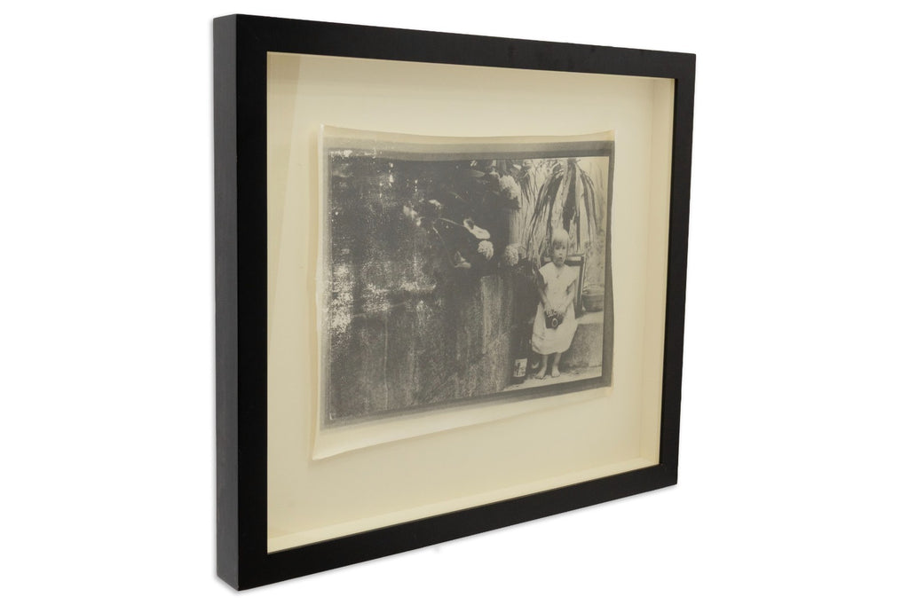 A poetic and intimate work by Swiss artist Annelies Strba (b. 1947), "Linda mit Kamera" captures a quiet domestic moment in the artist's signature dreamlike style. Executed as a heliogravure, the image presents a softly textured black-and-white portrait of a young child standing barefoot and holding a camera, surrounded by plants and diffused light. This work reflects Strba's ongoing exploration of family, memory, and time, themes that have defined her photographic oeuvre for decades. Her distinctive technique, layering personal imagery with painterly texture, positions her among the leading figures in contemporary European art photography. The print embodies the tender introspection and timeless intimacy that characterize Strba's celebrated visual language. From a private collection. Dimensions: 26"h x 29.5"w x 2.25"w (framed). In very good condition. Full condition reports available upon request.