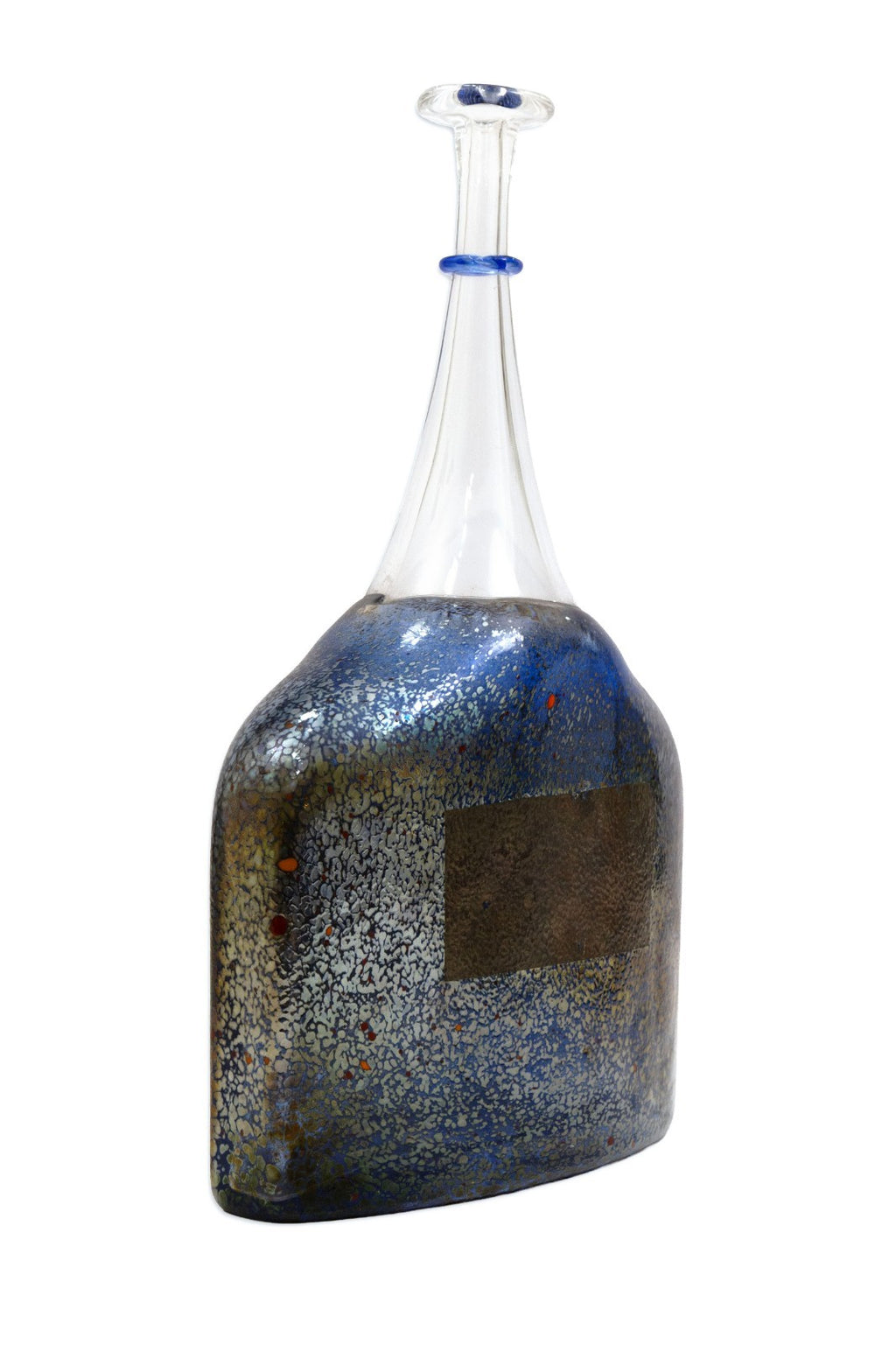 A "Blue Satellite" art glass bottle designed by acclaimed Swedish artist Bertil Vallien for Kosta Boda. Signed and numbered "Boda, B. Vallien, 89253" on the underside. This hand-blown work features a rich cobalt and iridescent surface with subtle speckles and abstract color layering, complemented by a clear elongated neck with a delicate blue glass ring accent. Exemplifying Vallien's mastery of form and texture, the piece captures his signature cosmic and ethereal aesthetic, this sculptural vessel reflects the innovative artistry of mid- to late-20th-century Scandinavian glass design. From a private collection. Dimensions: 12"h x 7"w x 3.25"d. In very good condition. Full condition reports available upon request.