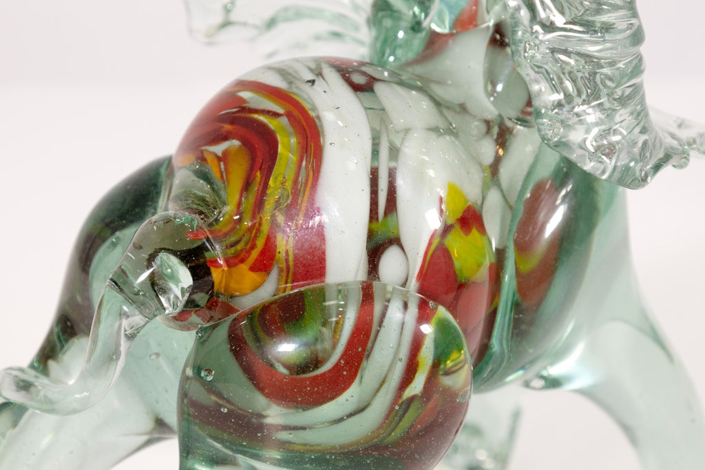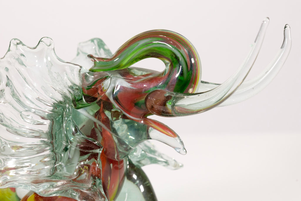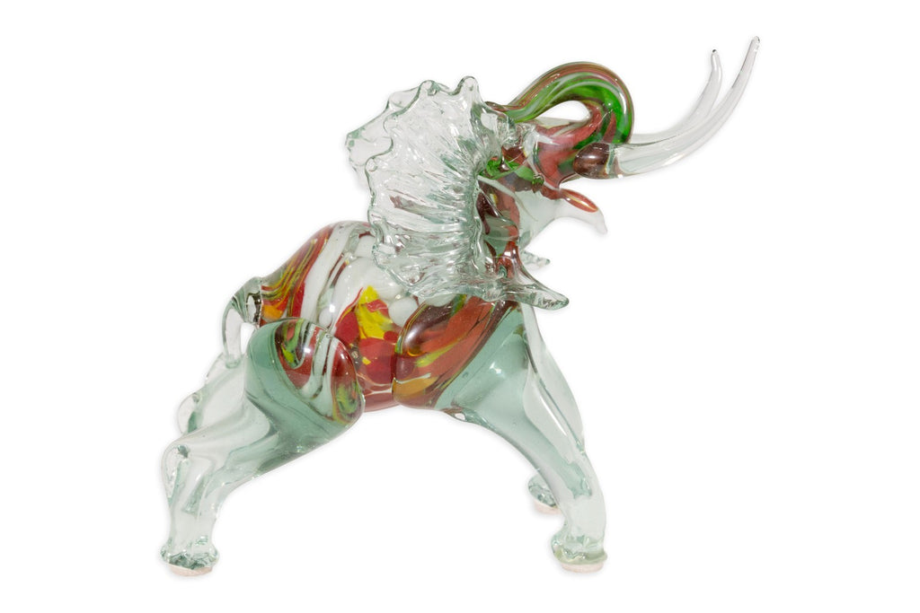 A hand-blown glass elephant sculpture from Murano, Italy, showcasing the region's celebrated artistry and technical mastery. The figure features fluid, sculptural lines and richly layered colors of red, green, yellow, and clear glass, with expressive movement captured in the raised trunk and flared ears. Exemplifying the postwar modernist style for which Murano glassmakers are renowned, this work combines playful form with refined craftsmanship. From a private collection. Dimensions: 9.5"h x 8"w x 4.5"d. In very good condition.