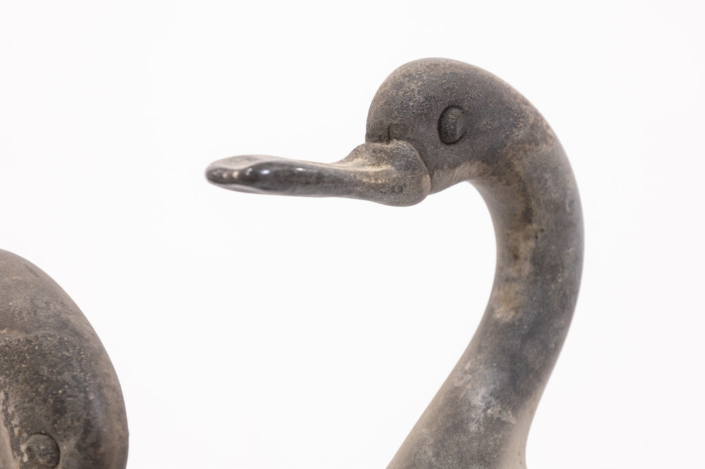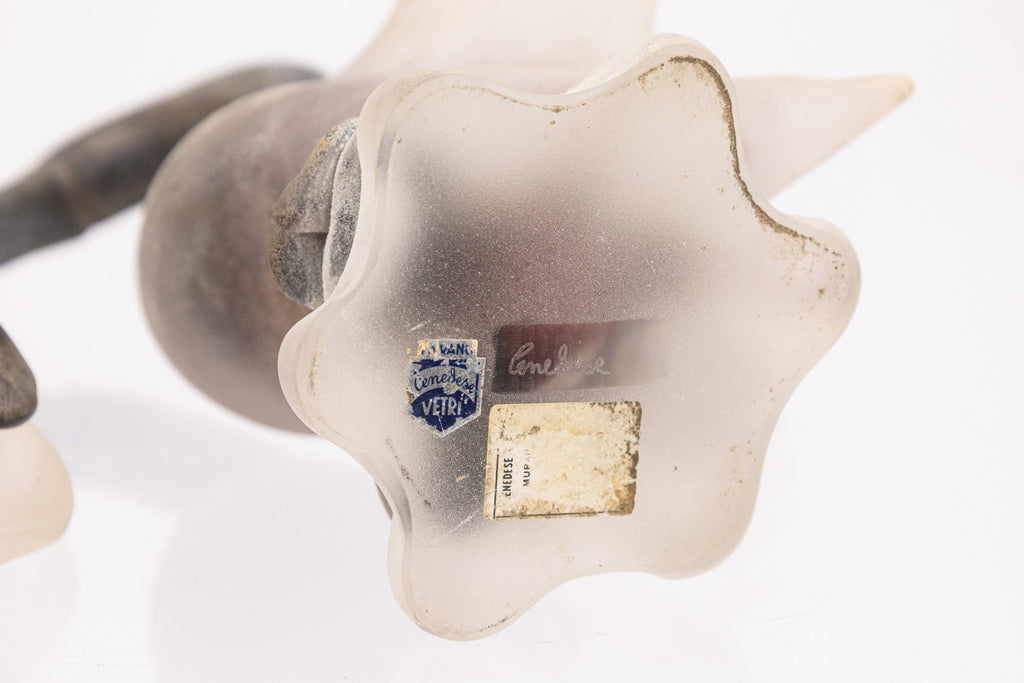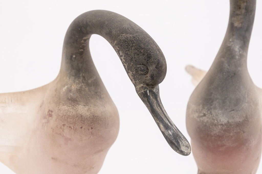A pair of vintage Gino Cenedese Vetri Murano frosted glass birds. This silly set of swans feature a lively pair of positions, one head down and the other head up. Each swan features fully extended wings, and both sit upon a stone-like base. Each swan is made with a gorgeous frosted glass with a textured finish, and smooth, soft coloration. Each piece features original tags and signatures on the underside of the base. Both birds are in good vintage condition. The tall swan measures 12 inches tall, 7.25 inches wide, and 8.5 inches deep. The shorter swan measures 9.75 inches tall, 7.5 inches wide, and 10 inches deep.
