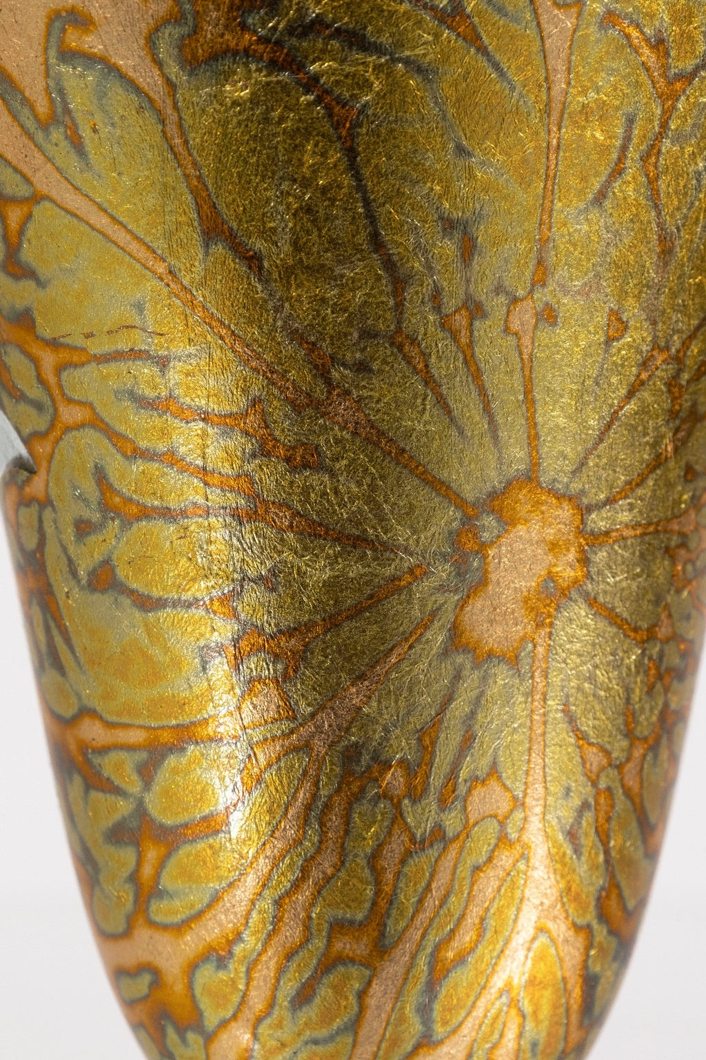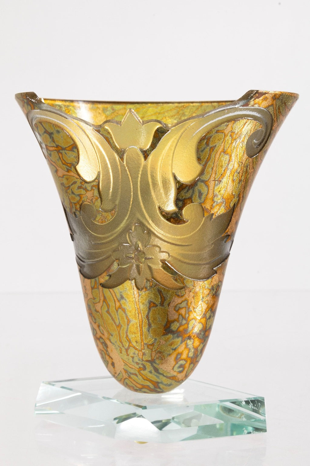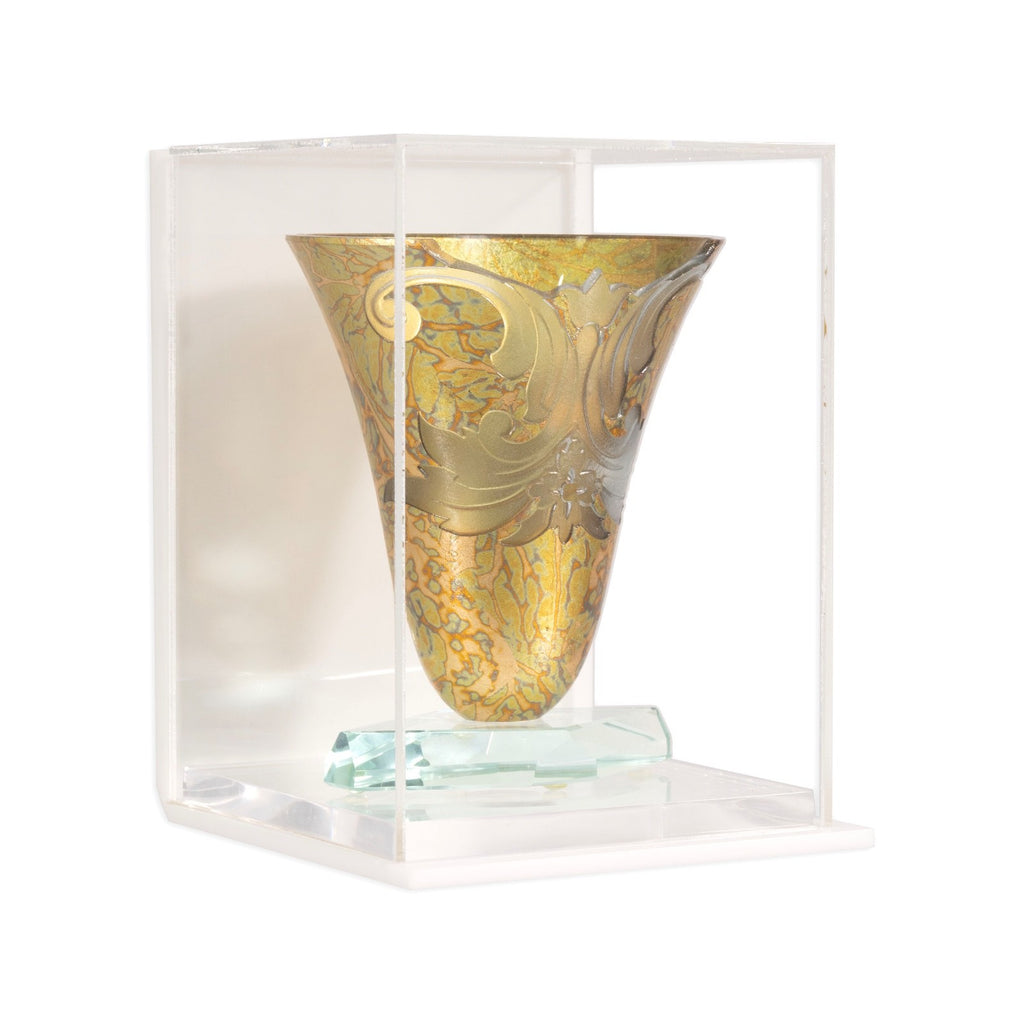 A hand-blown studio art glass vessel by Salvatore Polizzi, dating to the 1990s and signed along the base. The piece features a rich, gold iridescent surface with shifting tones of amber, bronze, and subtle green highlights, overlaid with stylized etched foliate decoration. The iridescence creates a metallic luster that changes with angle and lighting, lending the form a jewel-like presence. The vessel is presented on a stacked glass plinth within a custom clear acrylic display case, elevating it as a sculptural object and protecting the surface from handling. The tapering conical form and delicate surface etching speak to Polizzi’s technical precision and aesthetic refinement within late-20th-century American studio glass. From a private collection. Dimensions: 9"w x 7.75"w x 7"d (case) / 7"h x 5"w x 3"d (vase). In very good condition.