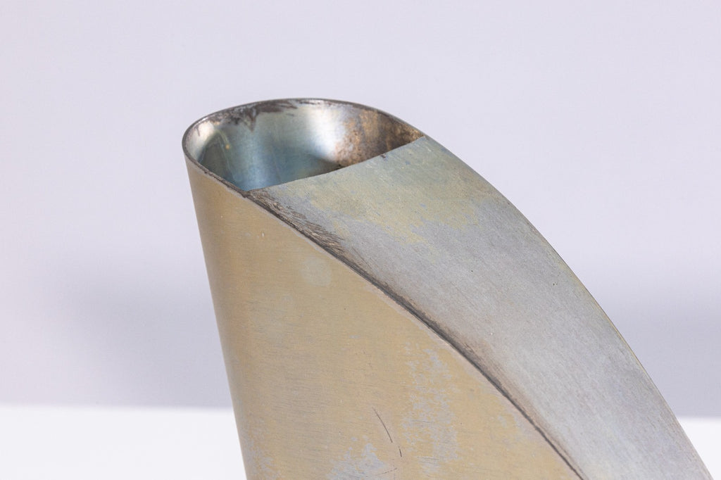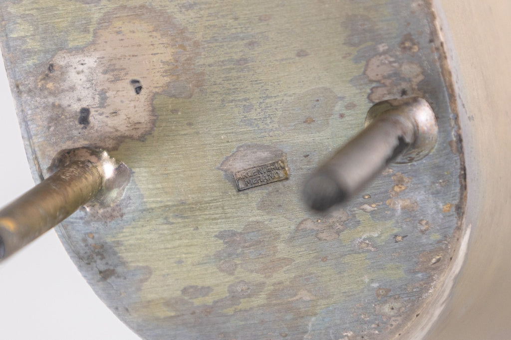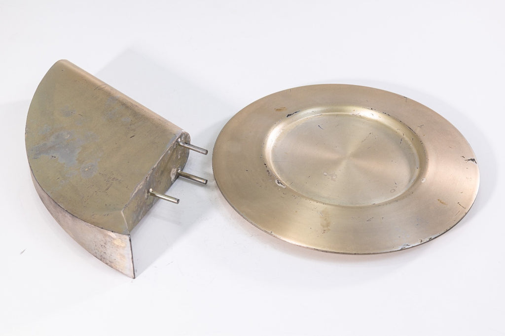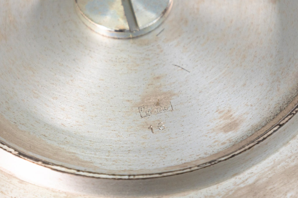 A sculptural silver-plated metal "Jug" and matching plate designed by Massimo Iosa Ghini for Argenteria Merano. Produced for Design Gallery Milan in 1989. Maker's mark on underside. A dynamic, architectural silhouette that merges fluid curvature and angular precision - hallmarks of Iosa Ghini's distinctive style. The jug's aerodynamic form evokes motion and futurism. Both functional and sculptural, this object embodies the innovative craftsmanship and conceptual sophistication that defined Milan's avant-garde design scene of the era. This object exemplifies late-1980s Italian postmodern design.