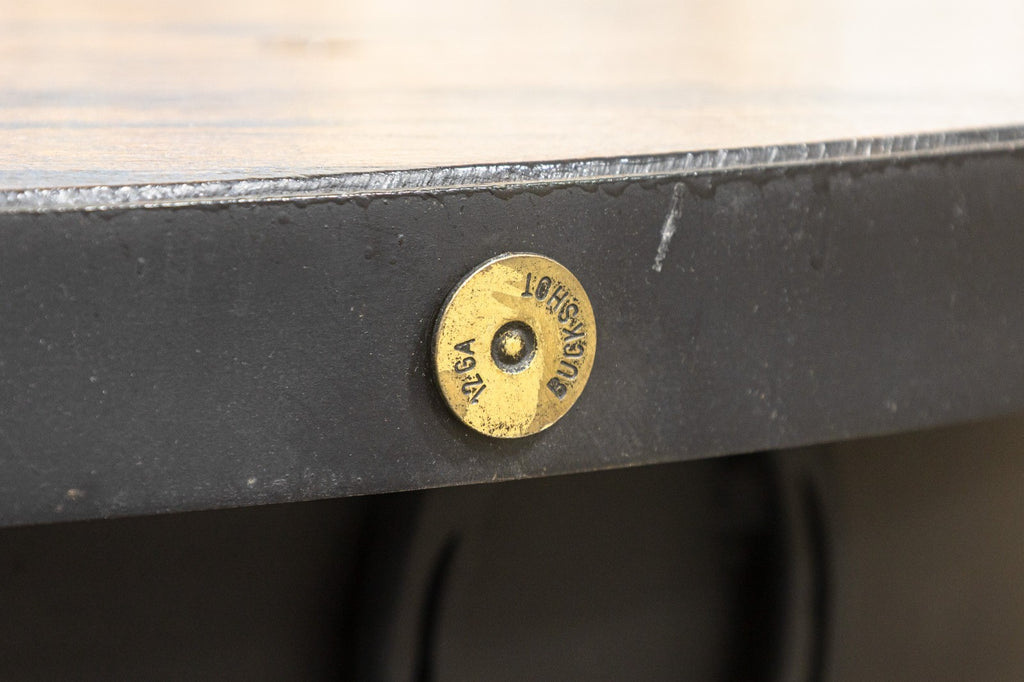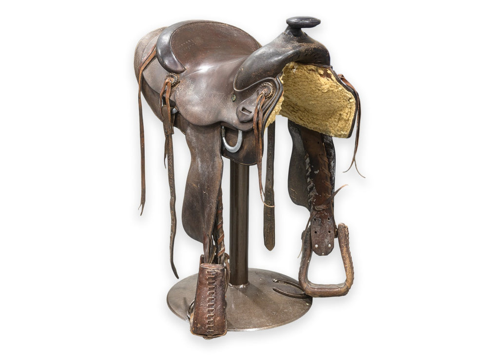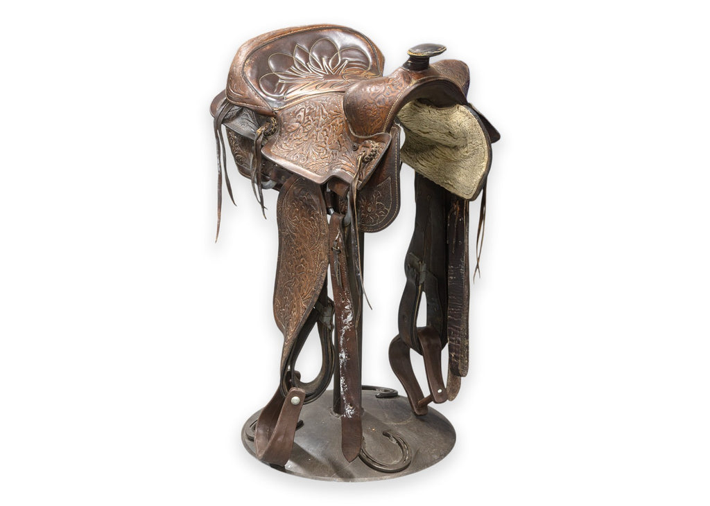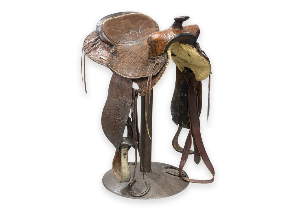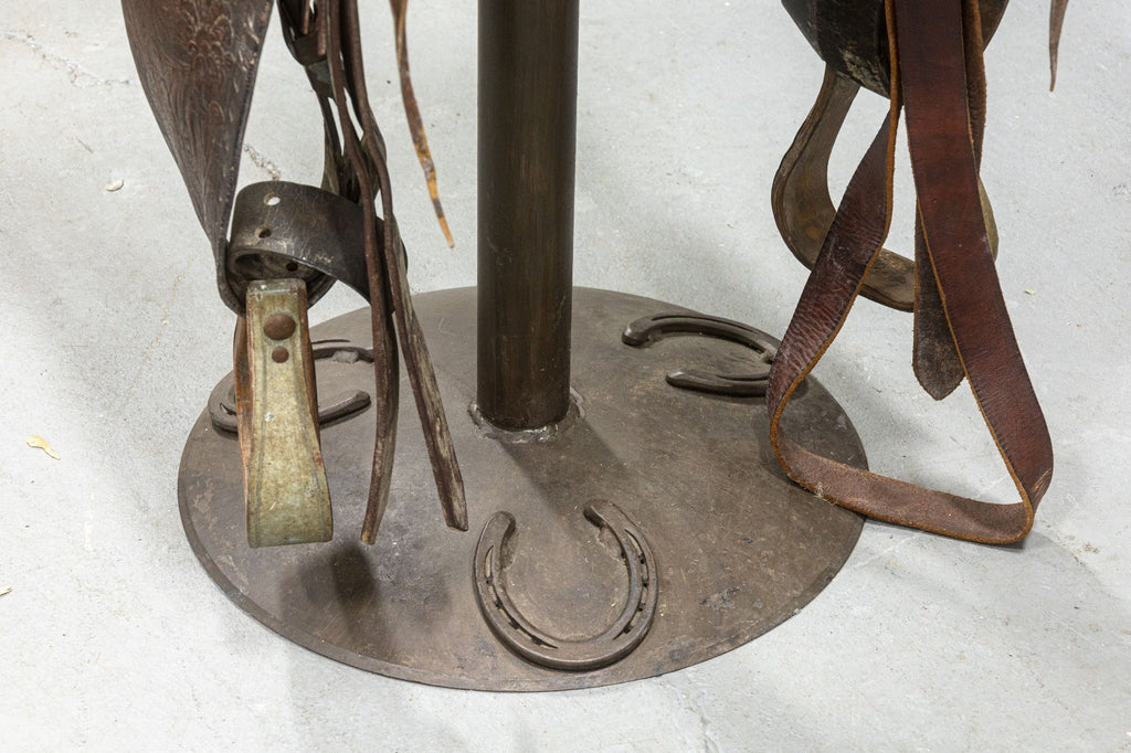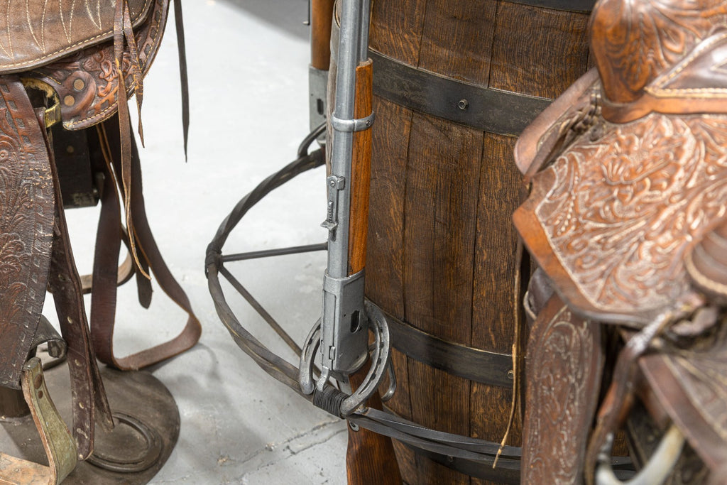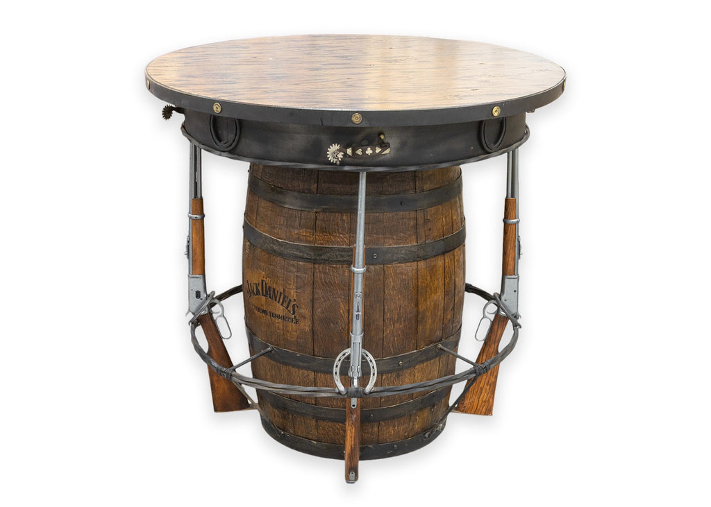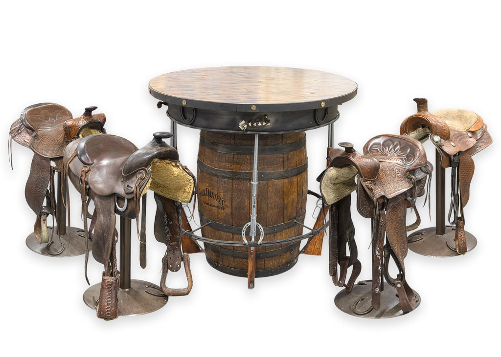 Calling all cowboys and cowgirls! We kindly welcome you to this wondrous western style pub table with matching saddle seat stools. Take a gander at this beautifully hand-crafted set, constructed with a high-quality set of materials in wood, metal, and leather. The pub table features a real deal solid oak Jack Daniels whiskey barrel base, wrought iron foot rests, 4 replica lever action rifles, horse shoes, buckshot shell caps, and a series of boot spurs. But, woah, woah, woah, hold your horses, there's more! This pub table is surrounded by 4 one of a kind stools, each boasting their own unique horse saddles. Each saddle sits on a swiveling metal frame with round bases featuring horse shoe detailing. All four of the saddles are in good condition, by hook or by crook you'll be sitting comfortable. This whole set is in good used condition, so don't sit with your spurs on, mosey on over and get this set while it lasts.