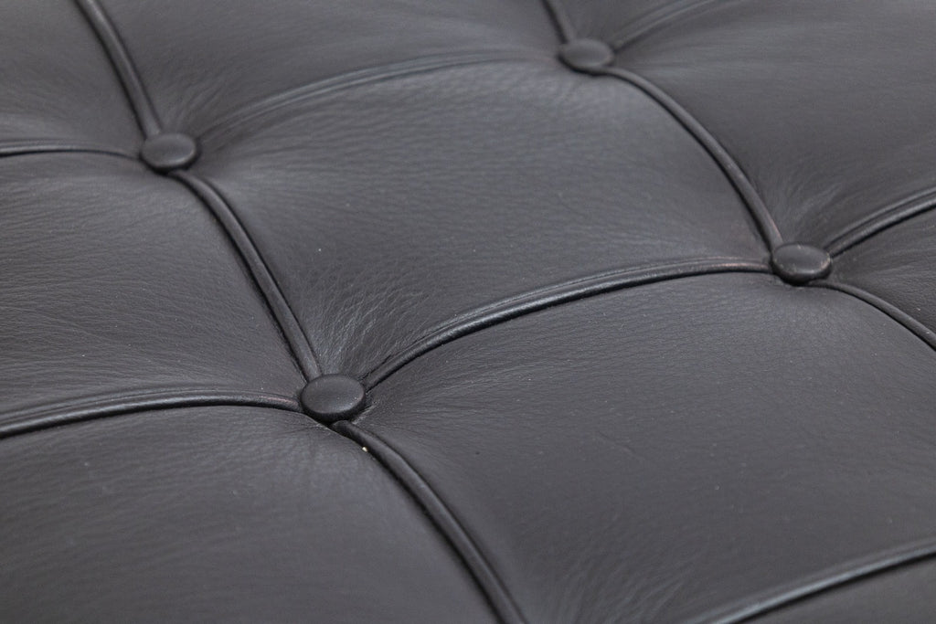 A Mies Van Der Rohe Barcelona style ottoman. This is great contemporary modern ottoman featuring a classic mid century modern design. It features a fully tufted black leather cushion, sitting on leather straps on the underside. The frame is made of flat bar stainless steel chrome, a wonderful contrast to the matte black leather. This ottoman is in very good condition. It measures 15.5 inches tall and 22.25 x 23.75 inches wide.