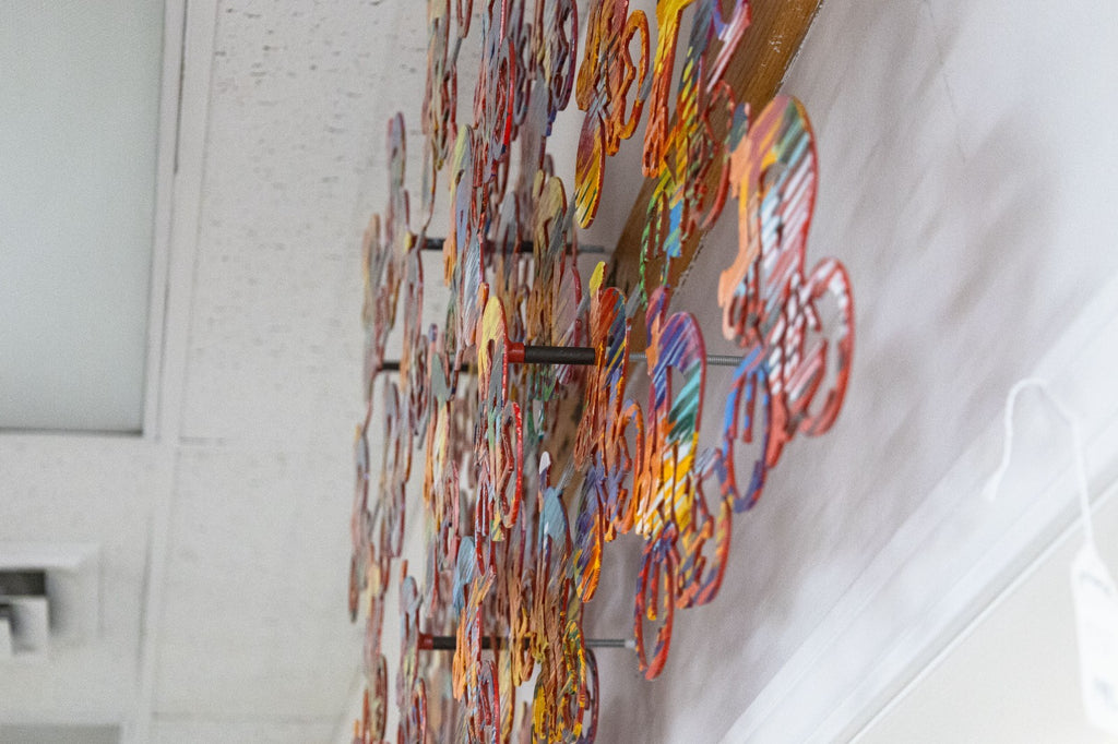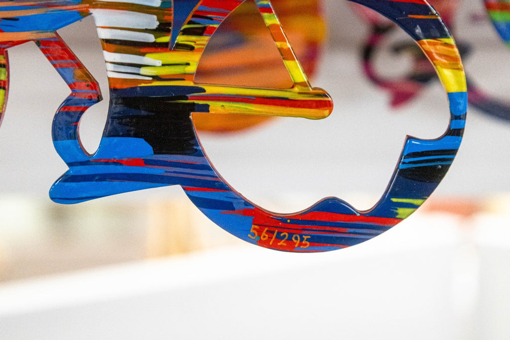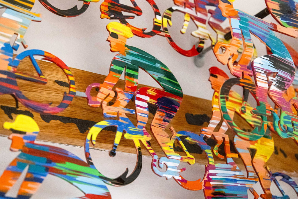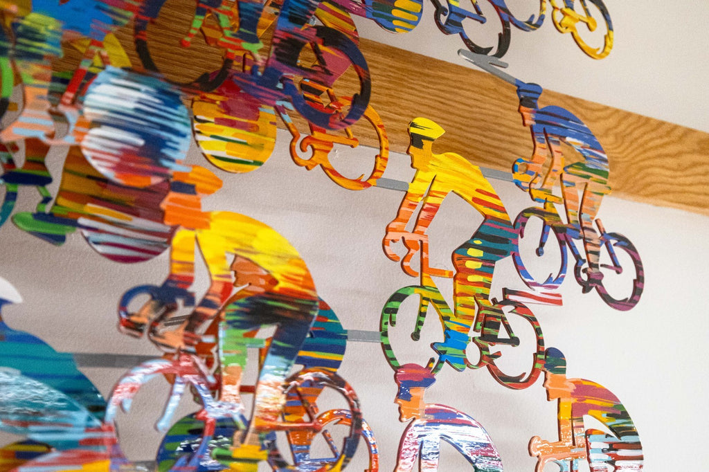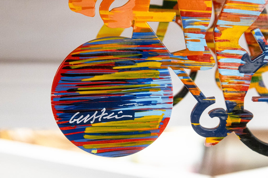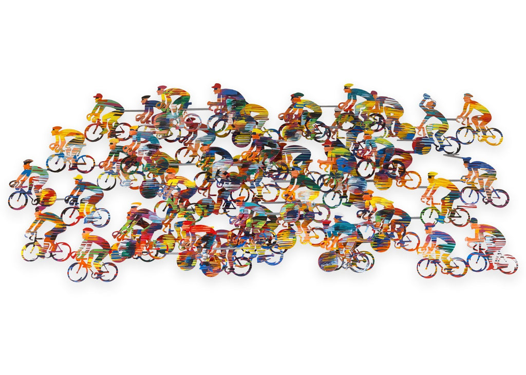 This vibrant metal wall sculpture by David Gerstein exemplifies the artist’s celebrated pop-art style and masterful use of color, movement, and repetition. Signed with an annotation of 56/295. Cyclists features a dynamic peloton of riders layered in bold, saturated hues, creating a sense of rhythm and forward momentum across the composition. The overlapping figures and cut-metal construction give the work visual depth and an animated, almost kinetic presence on the wall. This piece reflects Gerstein’s internationally recognized approach to transforming everyday subjects into joyful, energetic works of art. Crafted in painted metal and designed for wall display, Cyclists makes a striking statement and is ideal for collectors of contemporary pop art, sports-themed works, or large-scale decorative sculpture. Dimensions: 31"h x 68"w x 7"d. In very good condition.