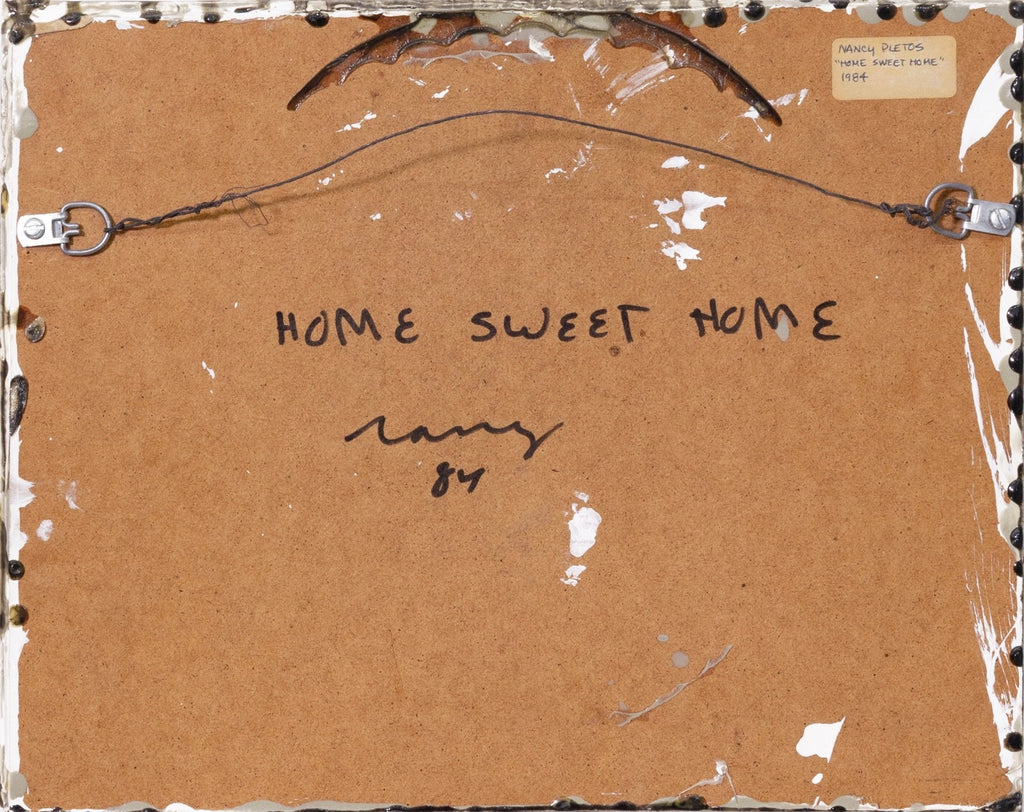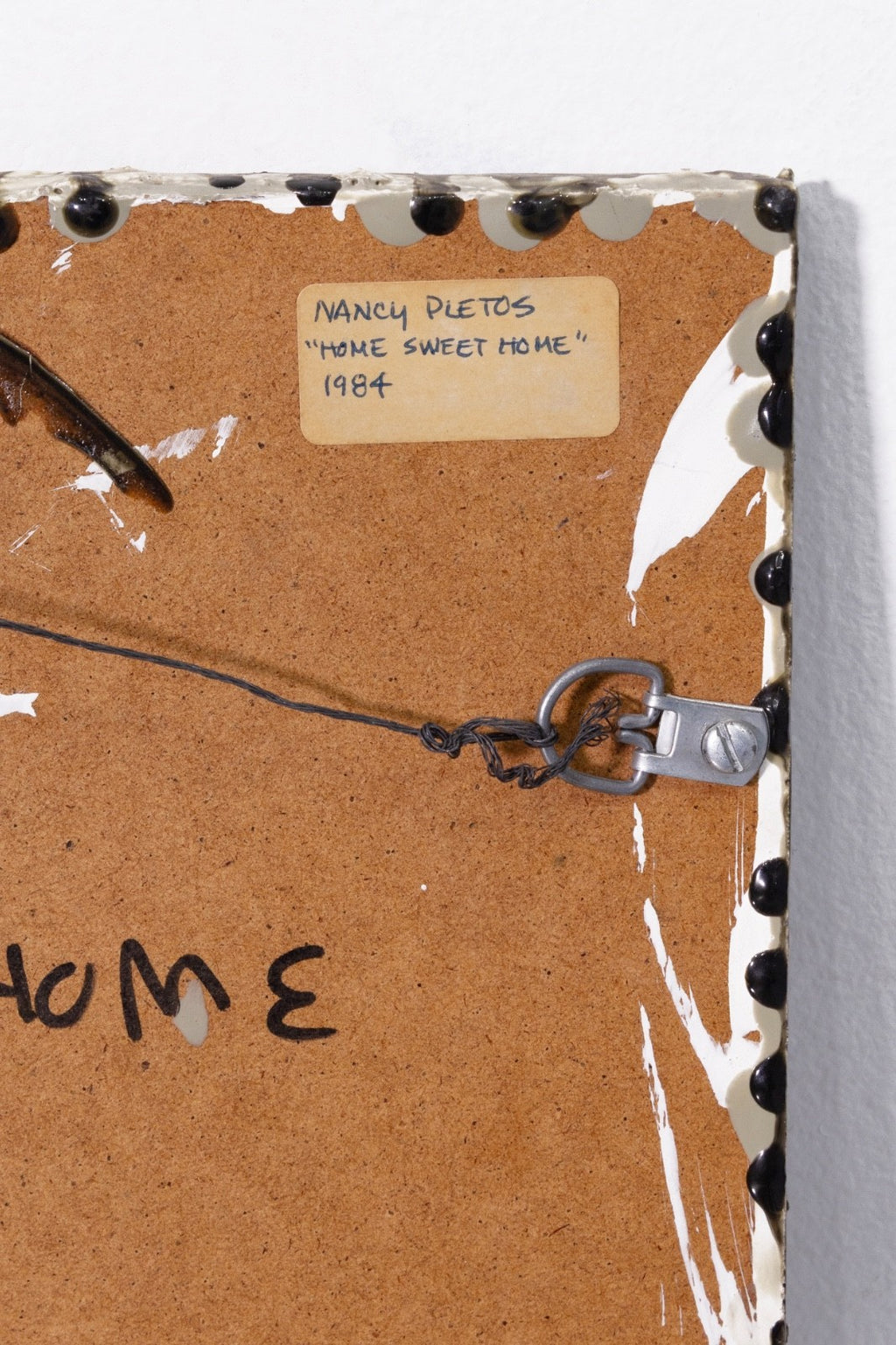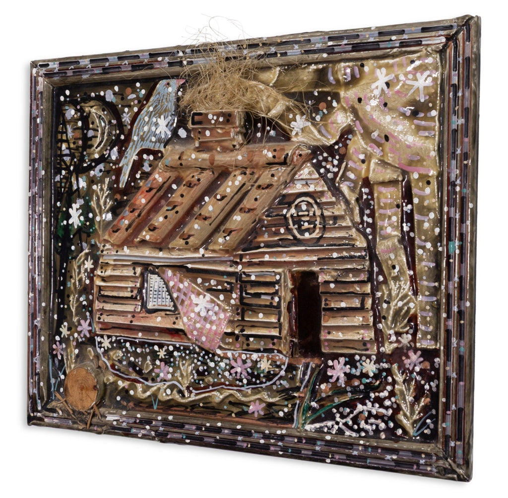 A contemporary mixed media artwork titled "Home Sweet Home (1984)" by Detroit Cass Corridor artist Nancy Pletos. Signed and titled on verso. A richly textured sculpture that merges elements of folk art with contemporary assemblage. Crafted from layered and painted materials, the work depicts a rustic log cabin surrounded by whimsical details, delicate floral motifs, a perched bird, and organic fibers suggesting straw or thatch, creating both charm and complexity. The relief-like construction gives the piece sculptural depth, while the hand-painted surface adds an intimate, storybook quality. This work reflects Pletos’ distinctive approach to blending narrative, nostalgia, and tactile craftsmanship. From a private collection. Dimensions: 10"h x 12.5"w x 1.5"d. In very good condition.