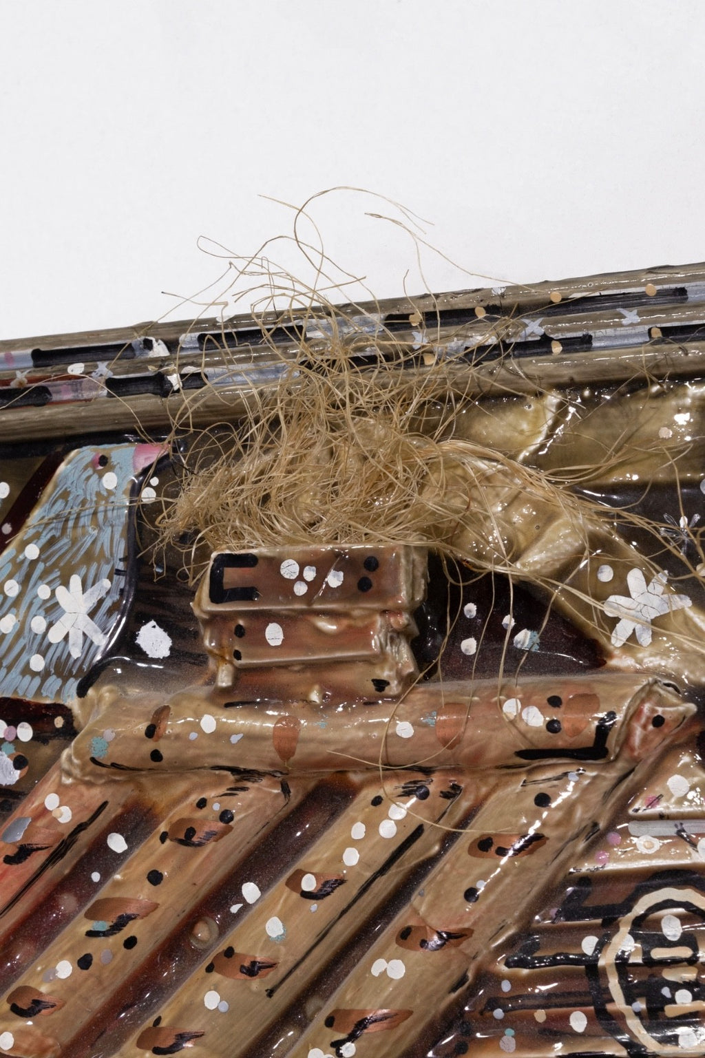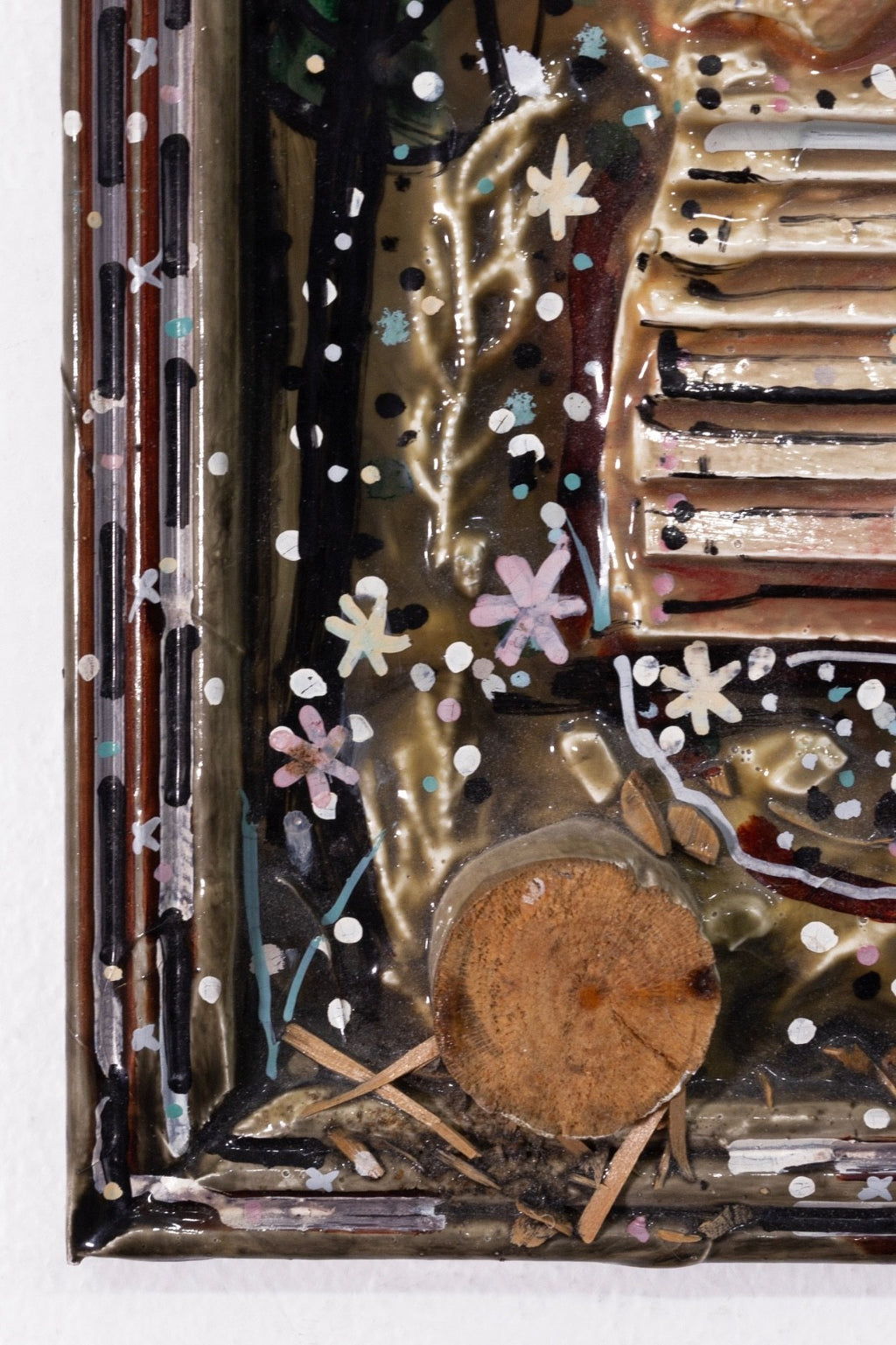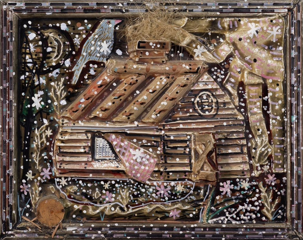 A contemporary mixed media artwork titled "Home Sweet Home (1984)" by Detroit Cass Corridor artist Nancy Pletos. Signed and titled on verso. A richly textured sculpture that merges elements of folk art with contemporary assemblage. Crafted from layered and painted materials, the work depicts a rustic log cabin surrounded by whimsical details, delicate floral motifs, a perched bird, and organic fibers suggesting straw or thatch, creating both charm and complexity. The relief-like construction gives the piece sculptural depth, while the hand-painted surface adds an intimate, storybook quality. This work reflects Pletos’ distinctive approach to blending narrative, nostalgia, and tactile craftsmanship. From a private collection. Dimensions: 10"h x 12.5"w x 1.5"d. In very good condition.