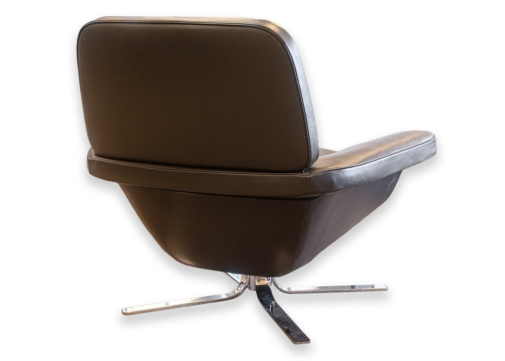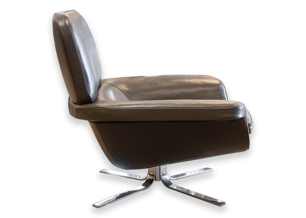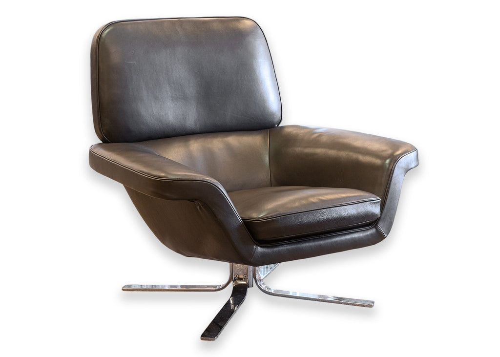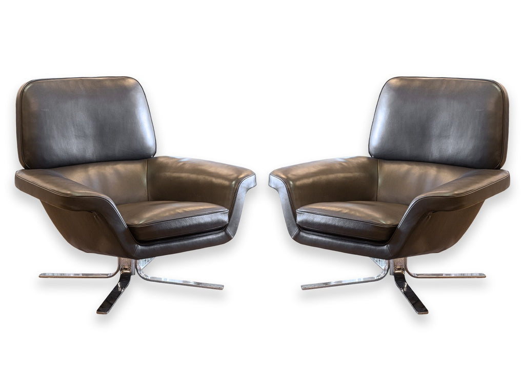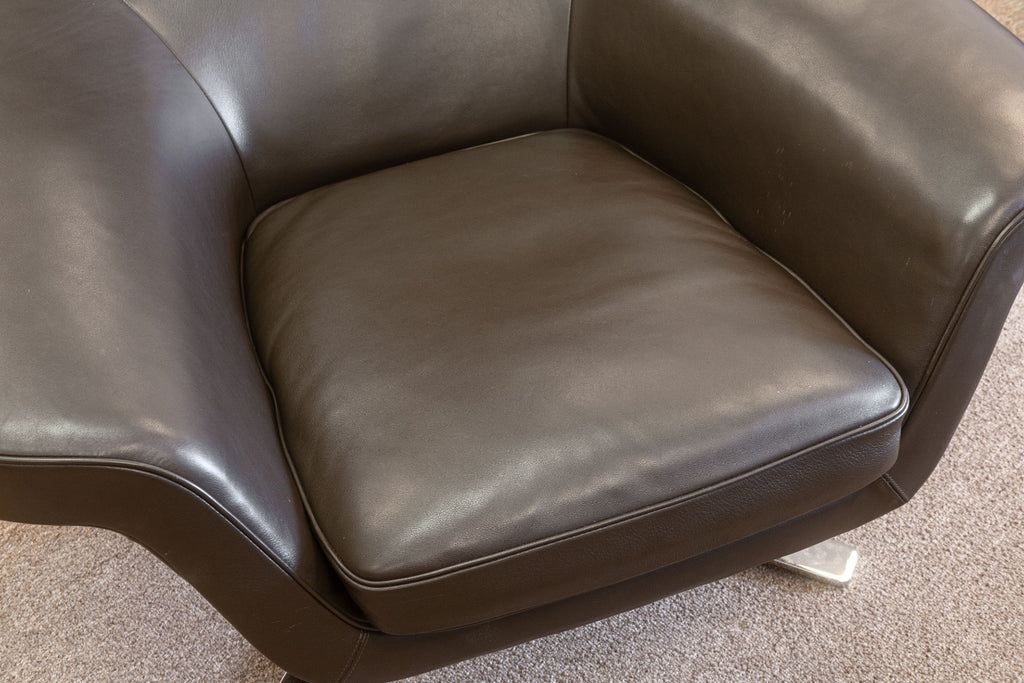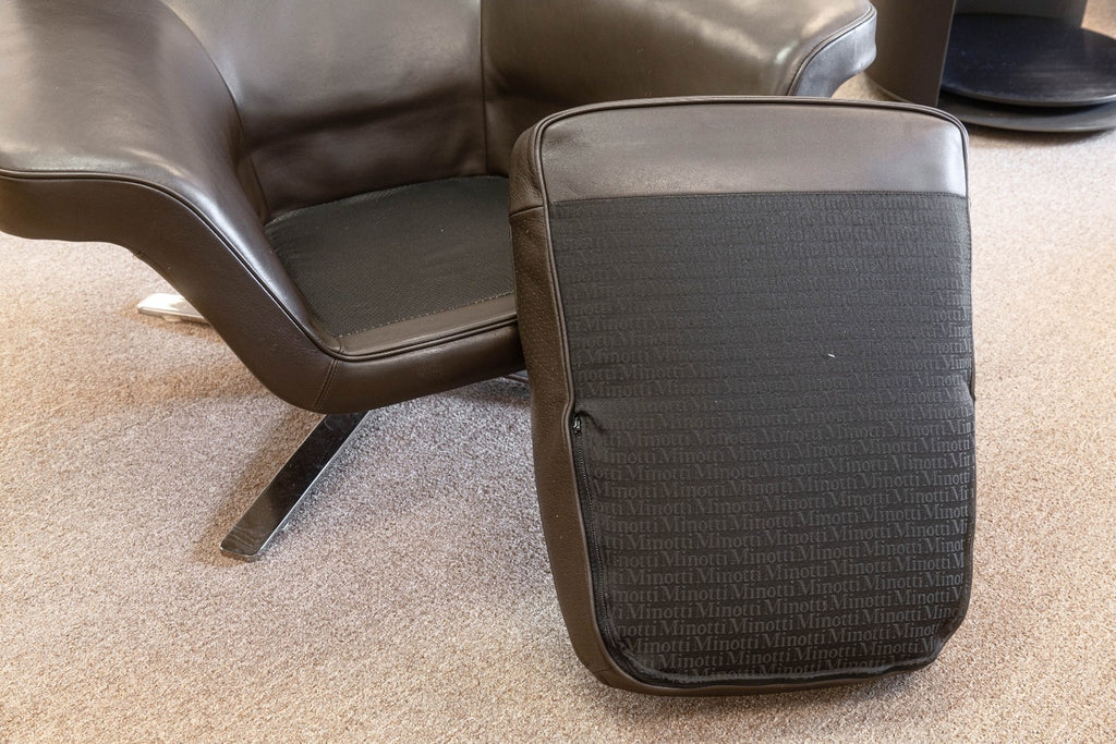 A pair of Minotti Blake Soft armchairs by Rodolfo Dordoni. This beautiful set of Italian armchairs feature a stunning contemporary design. Each chair has a soft contouring shape, with curving backs and arms. Each chair is upholstered in ultra soft leather upholstery with a down filling for a very comfortable lounging experience. Both chairs also include fully removable seat cushions with Minotti tagging across the bottoms. The swiveling chairs sit upon a chrome base with four flat bar legs. Both of these lounge chairs are in very good condition. They measure 35 inches tall, 36 inches wide, and 32 inches deep. They have a seat height of 16 inches, a seat width of 18 inches, an arm height of 6 inches, and a back height of 24 inches.