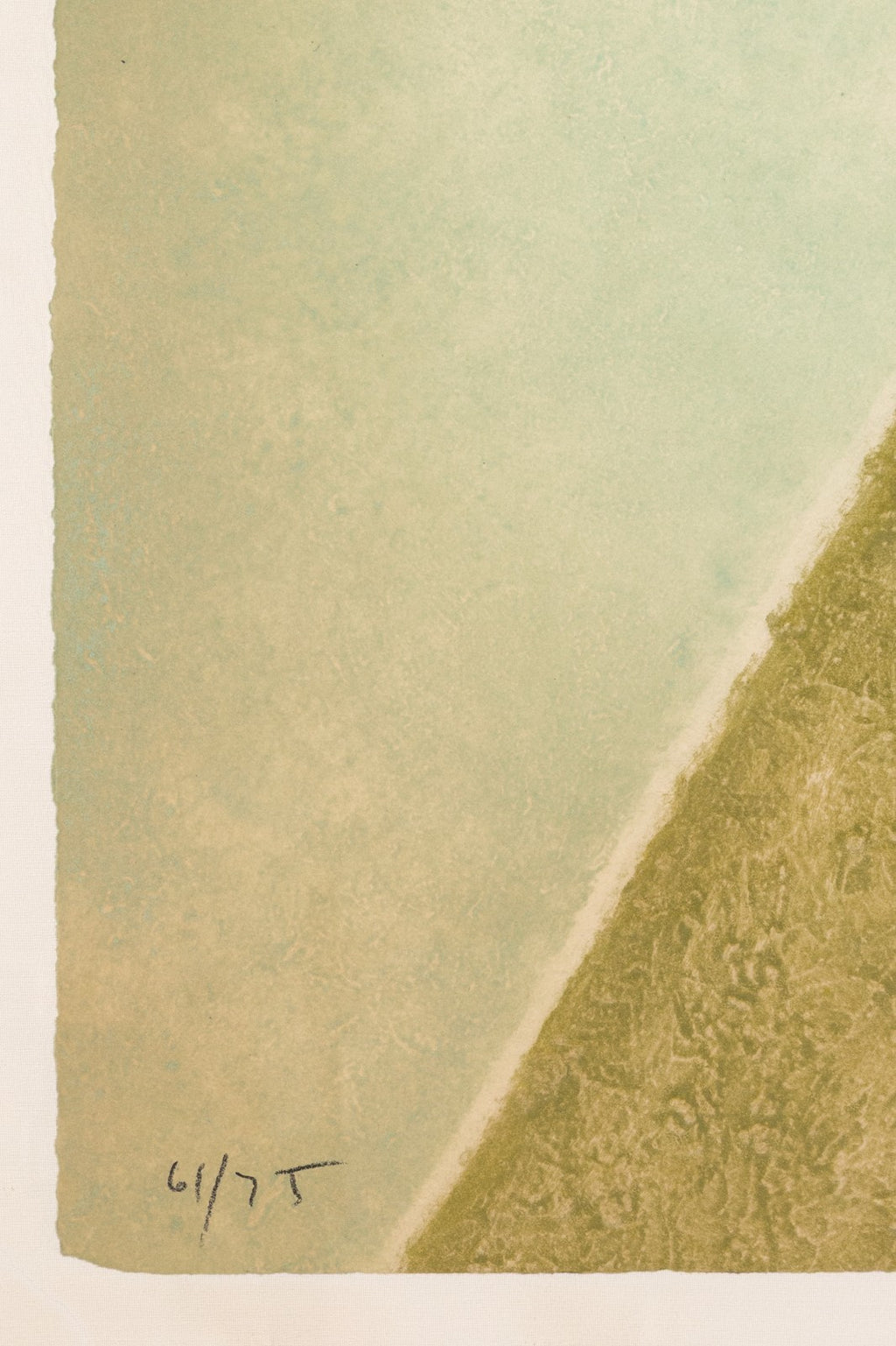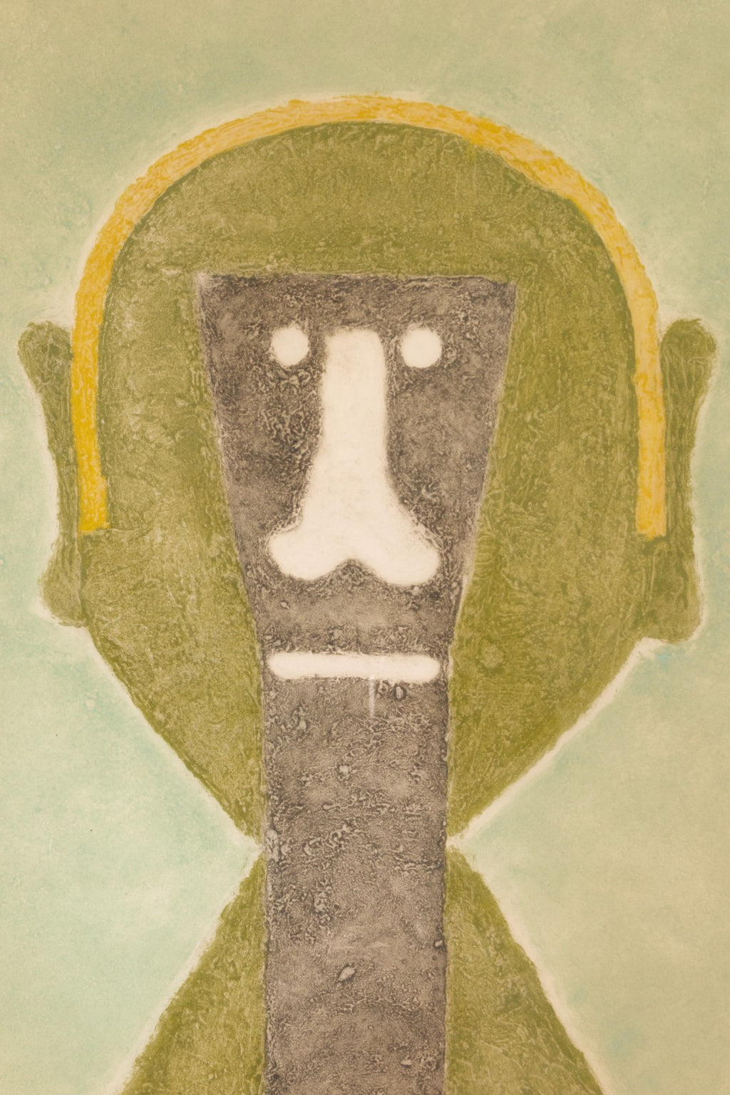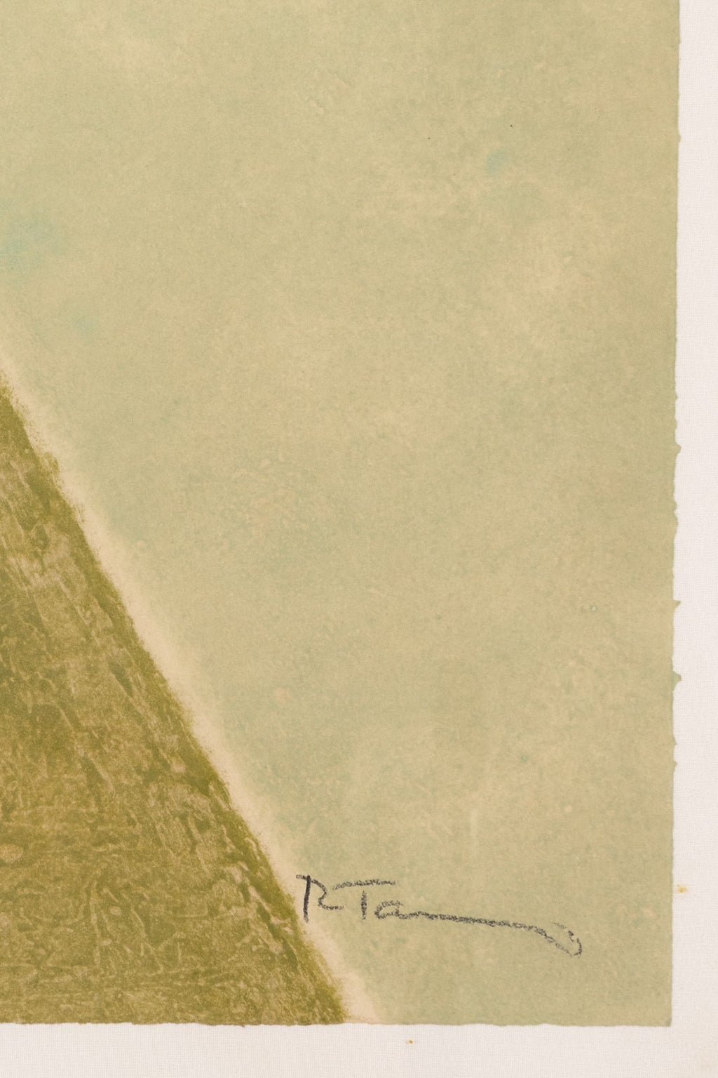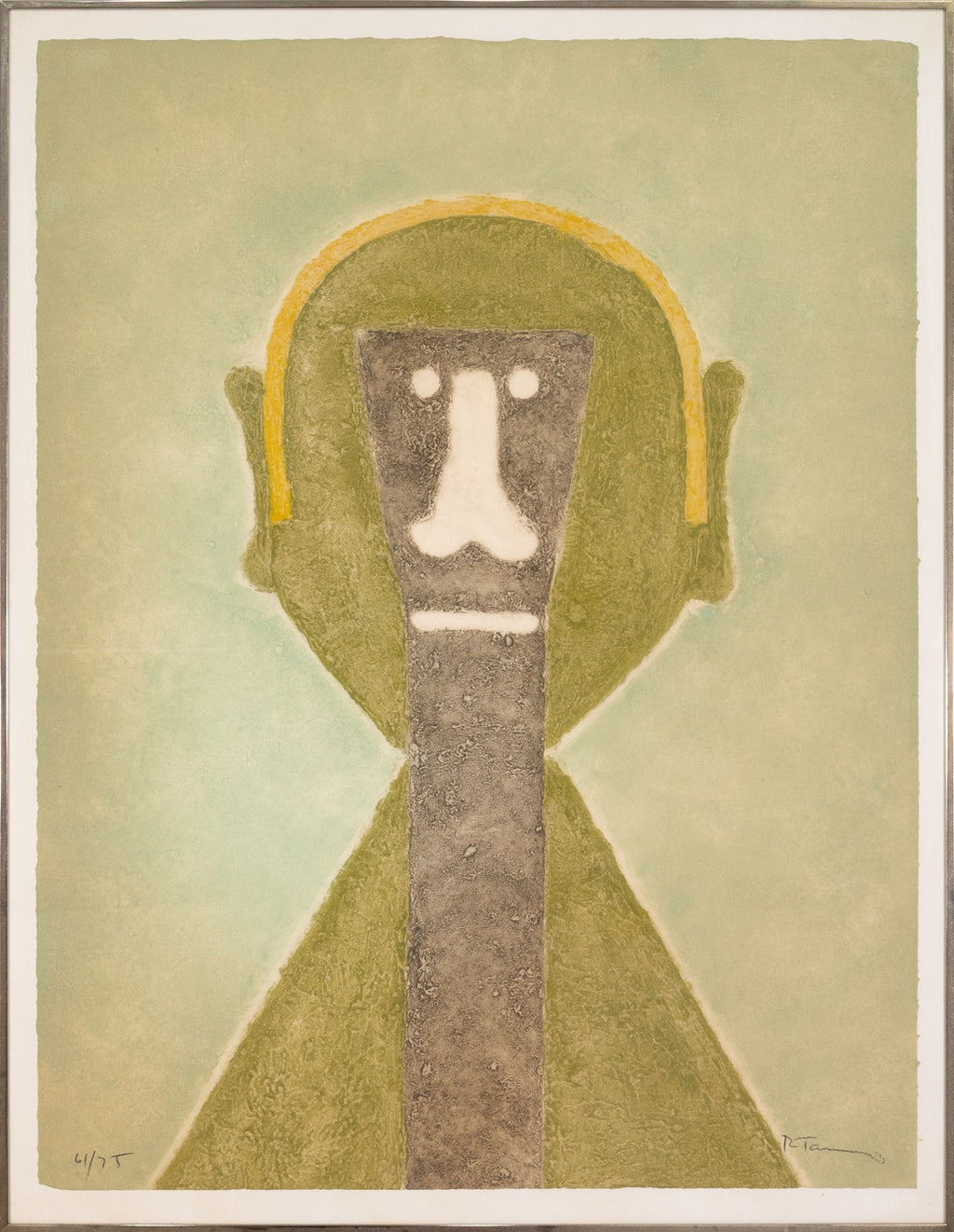 A modern aquatint etching print on Arches paper titled "Cabeza en Amarillo (Head in Yellow)" by Rufino Tamayo. Hand signed in pencil on the lower right with an annotation of 61/75 on the lower left. Published in 1976. The composition distills the human face into bold, geometric planes, merging pre-Columbian influence with modern abstraction. The textured surface brings sculptural depth to the flat plane, emphasizing the earthy green form against a soft, luminous background. The stylized head is framed by a golden yellow arc, suggesting both a halo and ceremonial adornment, while the mask-like facial features evoke timeless archetypes. It exemplifies Tamayo's mastery in blending cultural heritage with 20th-century modernism, offering a striking and contemplative portrait that is at once ancient and contemporary. From a private collection. Dimensions: 31"h x 24.25"w x 1"d (framed). In very good vintage condition. Full condition reports are available upon request.