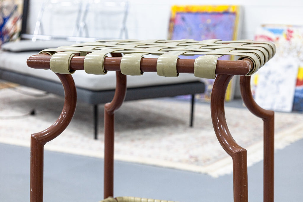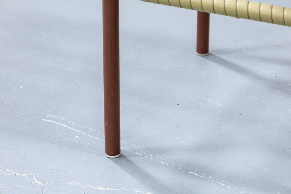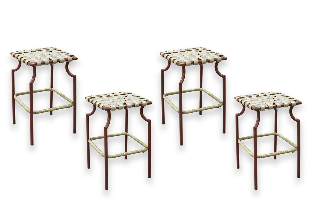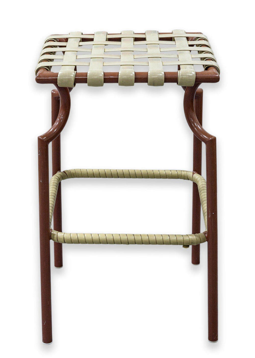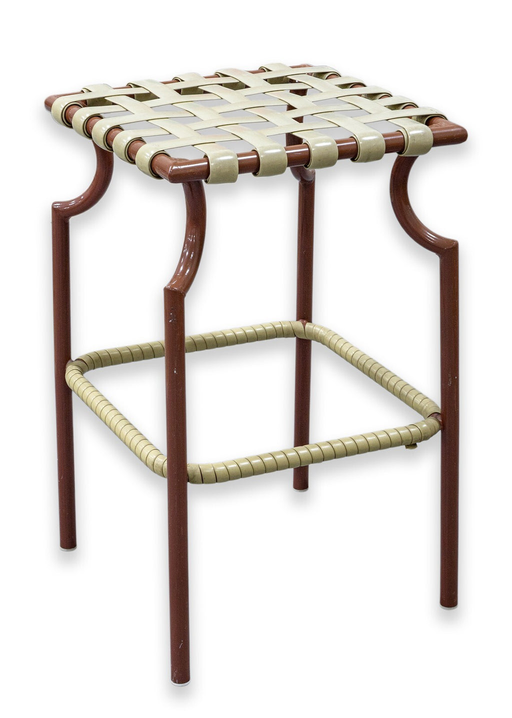 A vintage set of 4 Tropitone woven seat patio stools. A lovely set of patio stools from Tropitone. These stools feature a tubular metal frame finished in a brown color, and a woven vinyl seat in a beige color. There is also additional vinyl accenting on the footrests. Also to note, these pieces are incredibly lightweight. These stools are in good vintage condition, but there are some scuff and scratches around the legs. These stools measure 28 inches tall, and 17 x 17 inches wide.