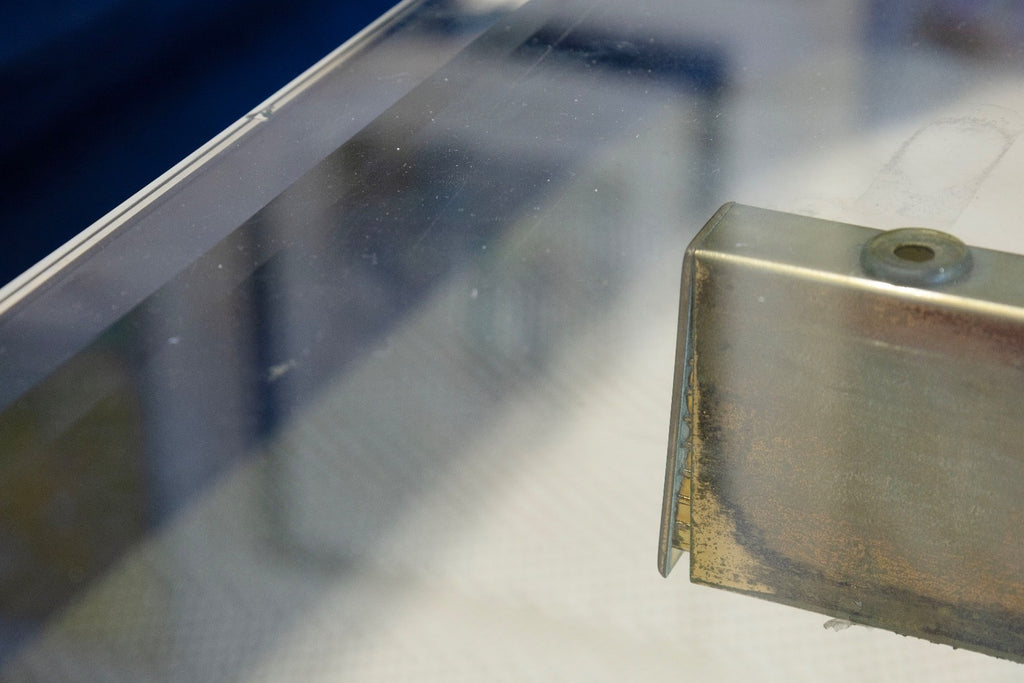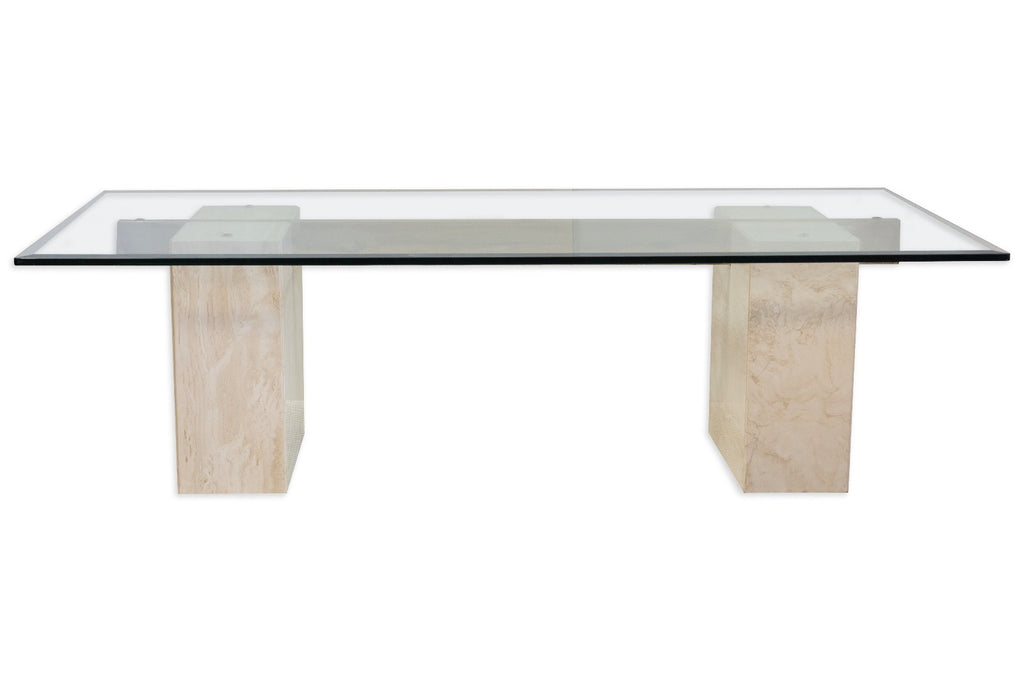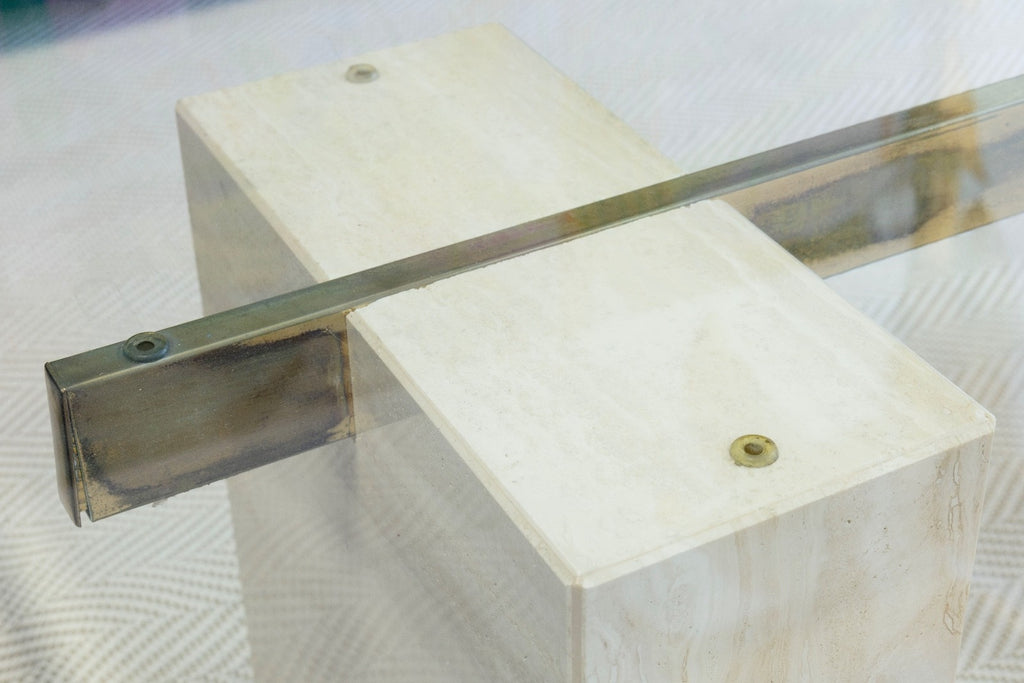 This vintage Artedi coffee table showcases the brand’s iconic balance of sculptural form and refined materials. A thick, beveled glass top rests elegantly on two substantial stone block bases, each featuring natural veining that adds organic texture and visual depth. Connecting the bases is a sleek brass crossbar, introducing a warm metallic contrast that elevates the clean, architectural design. The table is in good condition except one end of the bar is slightly out as shown above. The table measures at 15.5 inches in height, 54 inches in width and 28 inches in depth.