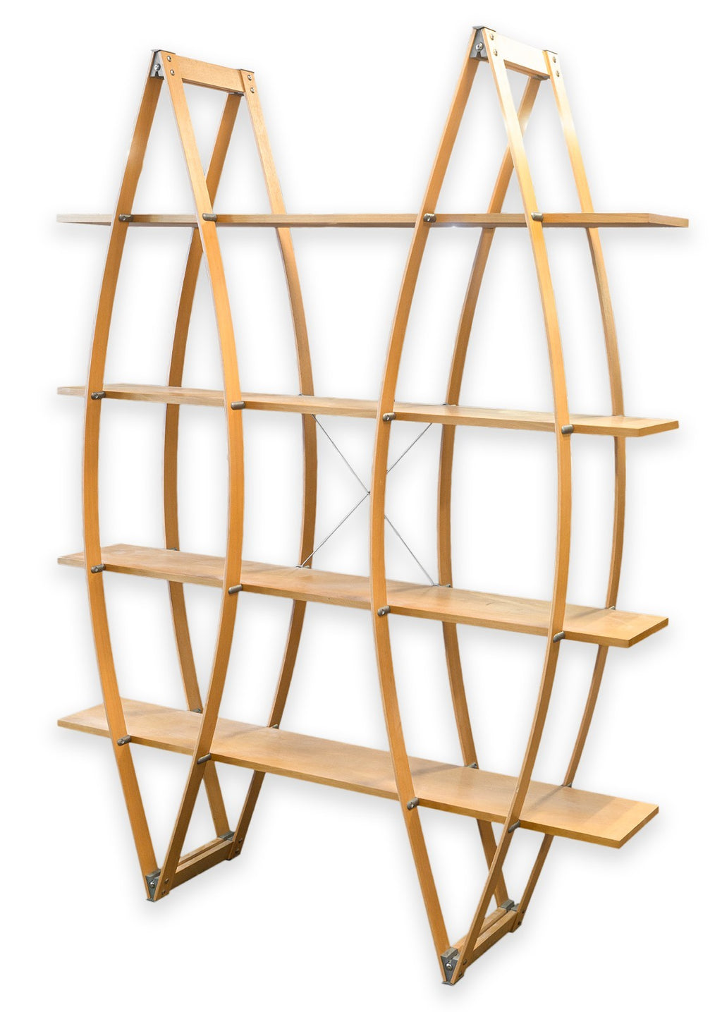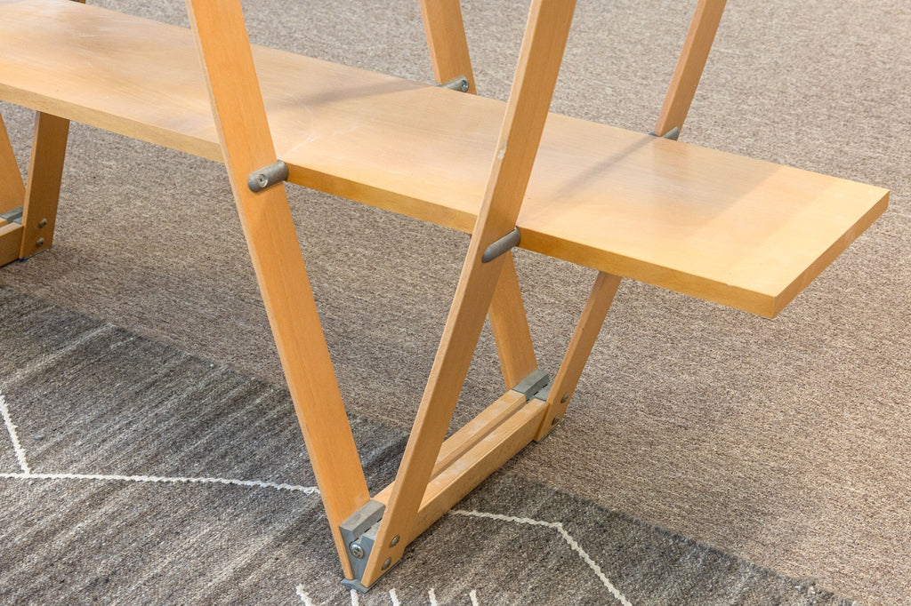 A vintage 1998 Marcello Ziliani "Mondo" wall unit for Sintesi. This is a stunning example of Italian postmodern design. This free standing shelf features a wood and aluminum construction with lacquered faces and brushed aluminum finishes. This shelf has a truly tension filled design, with bentwood beams running up and down supporting the entire design of the shelving. This piece is in very good vintage condition. It measures 79 inches tall, 59 inches long, and 14.75 inches wide.