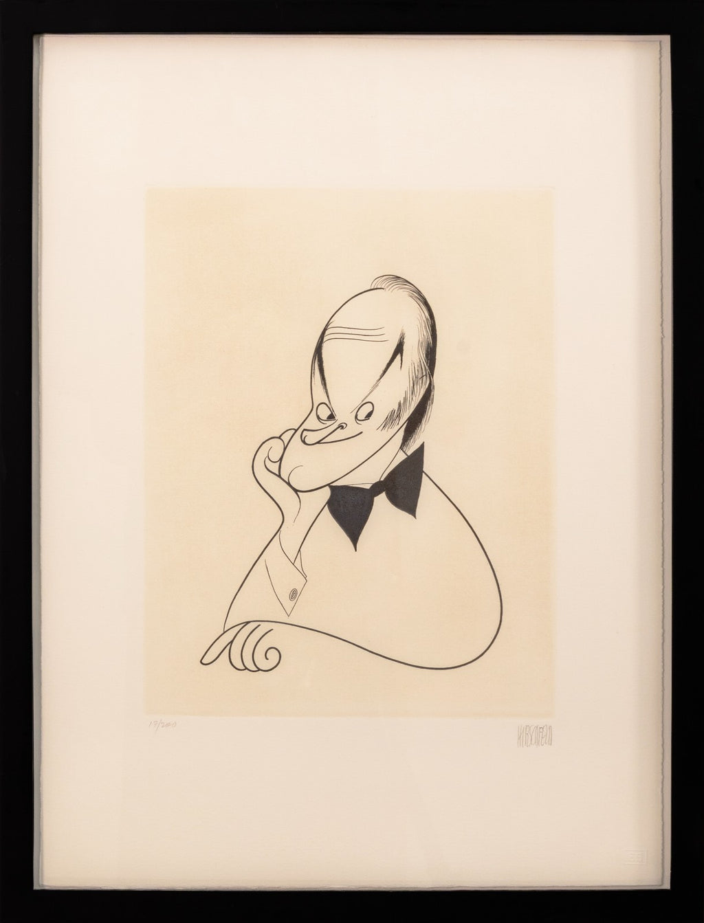 Al Hirschfeld (1903-2003) was an American caricaturist best known for his black and white portraits of celebrities and Broadway stars. Permanent collections of Hirschfeld's work can be found at a variety of institutions including the Metropolitan Museum of Art, the Museum of Modern Art, and the New York Public Library in New York, Harvard University in Cambridge, and the Harry Ransom Center in Austin, Texas. Hirschfeld was the recipient of two lifetime achievement Tony Awards. On June 21, 2003, the Martin Beck Theatre on Broadway was renamed the Al Hirschfeld Theatre. Hirschfeld was also honored with a star on the St. Louis Walk of Fame. In 2002, Al Hirschfeld was awarded the National Medal of Arts. He was an Honorary Member of the Salmagundi Club. In 2012, Hirschfeld was added to the Jewish American Hall of Fame.