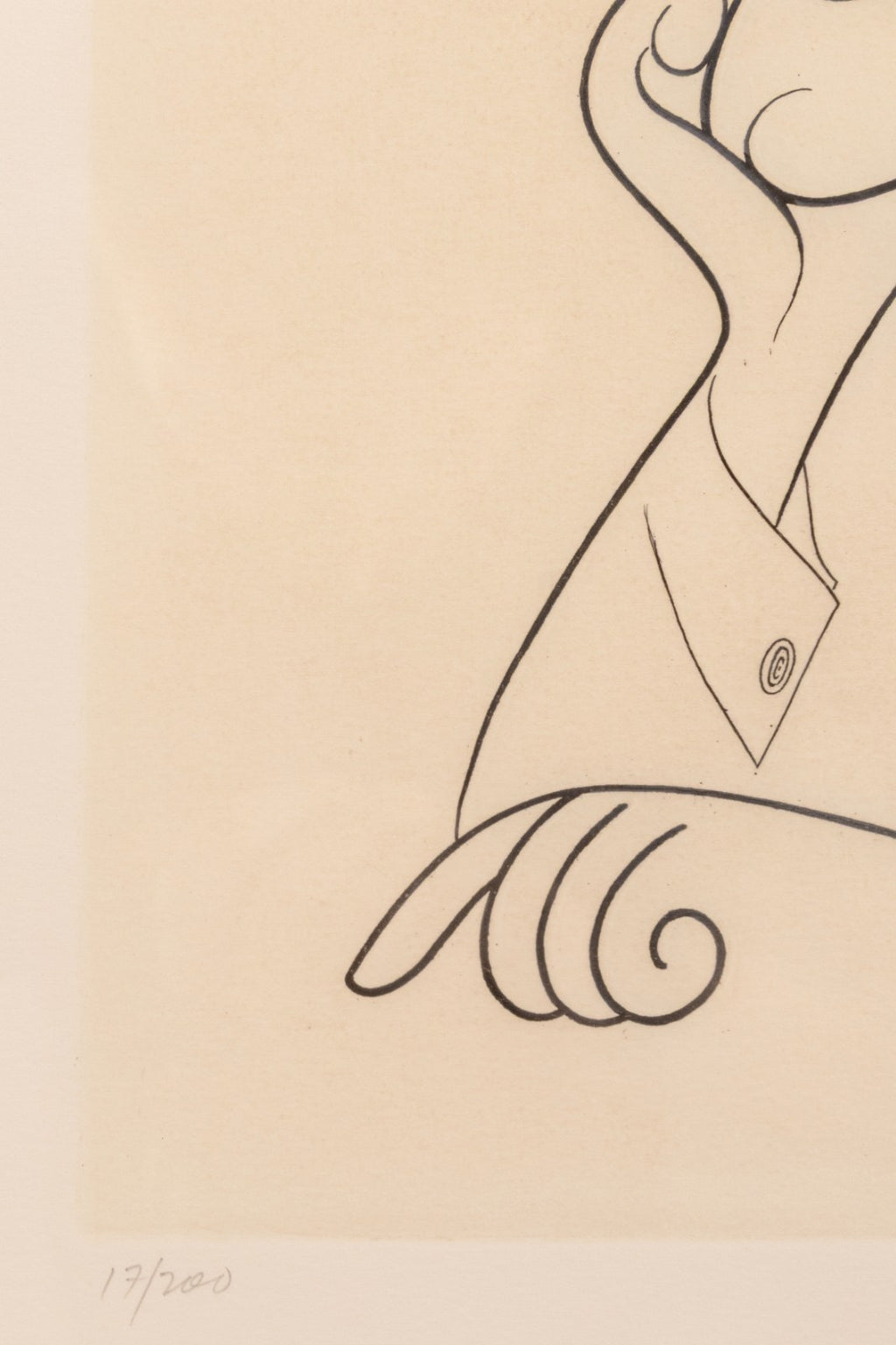 A contemporary lithograph on paper titled "Bob Hope" by famed American caricaturist Al Hirschfeld. Hand signed in pencil lower right with an annotation of 17/200 on the lower left. Published in 1983. This illustration depicts legendary comedian and Hollywood star Bob Hope with his trademark mischievous expression and sharp elegance. Executed in Hirschfeld's signature fluid line style, the portrait distills Hope's wit and charisma into a minimalist yet instantly recognizable form. Renowned as the "line king" and celebrated for his theater and Hollywood caricatures, Hirschfeld's works are considered enduring treasures of American popular culture. From a private collection. Dimensions: 22"h x 17"w x 1"d (framed). In very good condition. Full condition reports are available upon request.