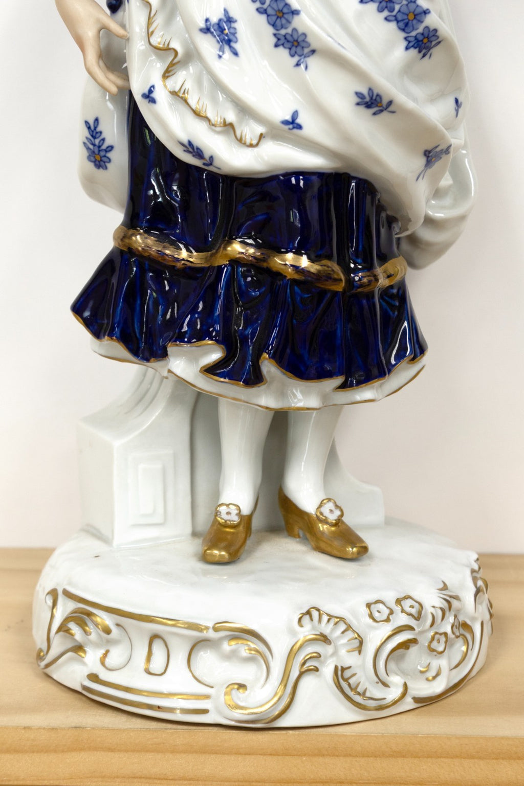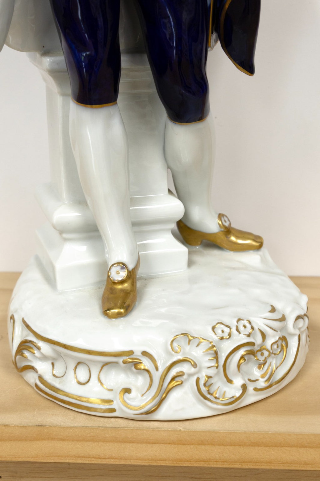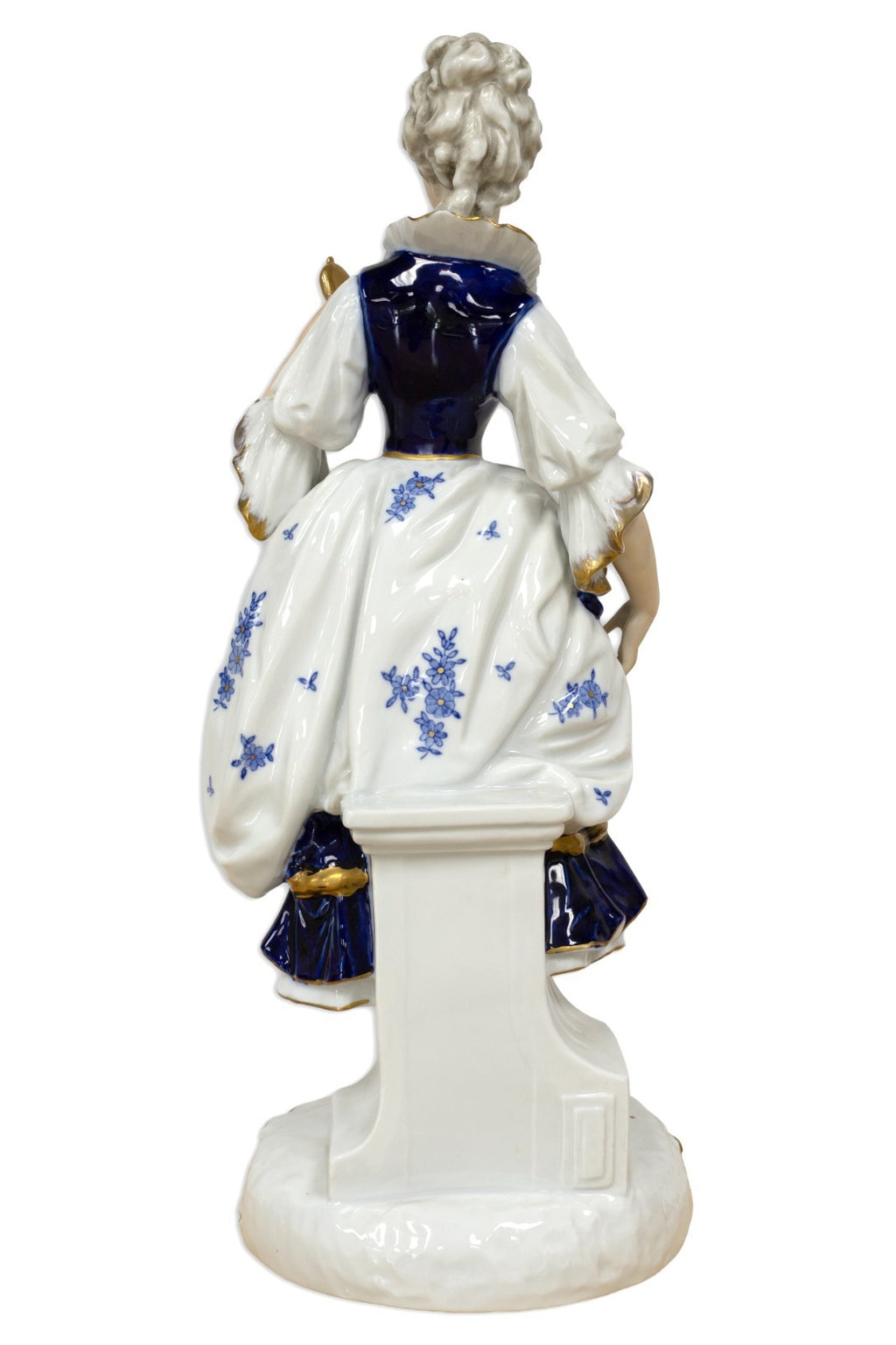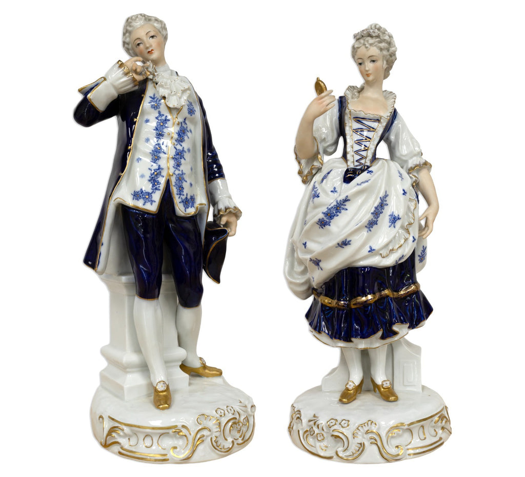 An elegant pair of German Rococo style painted porcelain figurines finely modeled as aristocratic man and woman in 18th-century court attire. The gentleman is depicted in a cobalt blue and white suit richly accented with floral motifs and gilt trim, posed with a flower in hand and tricorne hat at his side. The lady is shown in a matching gown with a corseted bodice, also adorned with delicate blue floral decoration and gold highlights, holding a bird perched gracefully in her hand. Each figure stands atop a scrolled Rococo base detailed with raised gilt ornamentation. Exemplifying the refinement and charm of Continental porcelain artistry, this pair reflects the elegance and romanticism of aristocratic life during the Rococo period. From a private collection. Dimensions: 16"h x 6.5"w x 6.5"d. In very good vintage condition. Full condition reports are available upon request.