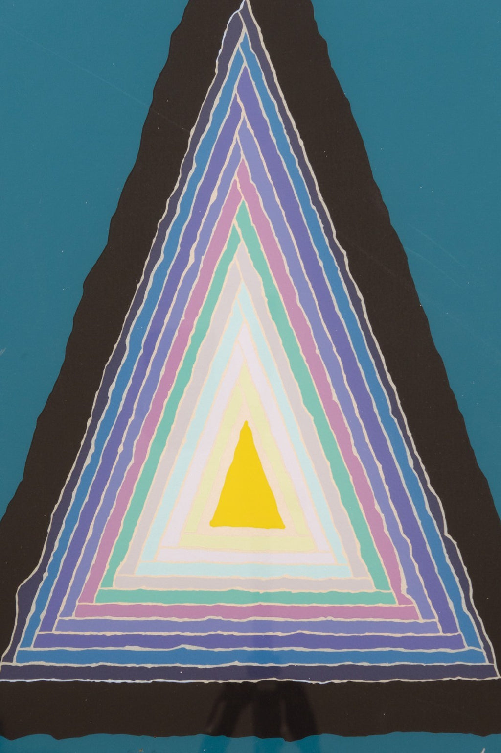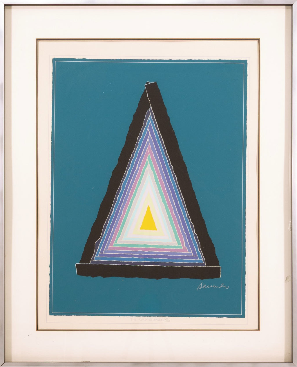 A contemporary titled "The Road to Arles (1977)" by Arthur Secunda. Hand signed on the lower right with an annotation of 24/125 lower margin. The composition showcases his signature use of bold color gradients and abstracted landscapes through luminous transitions of blue, red, and orange. A striking piece for collectors of lyrical abstraction and contemporary color field works. From a private collection. Dimensions: 32"h x 26"w x 1.5"d (framed). In very good vintage condition. Full condition reports are available upon request.