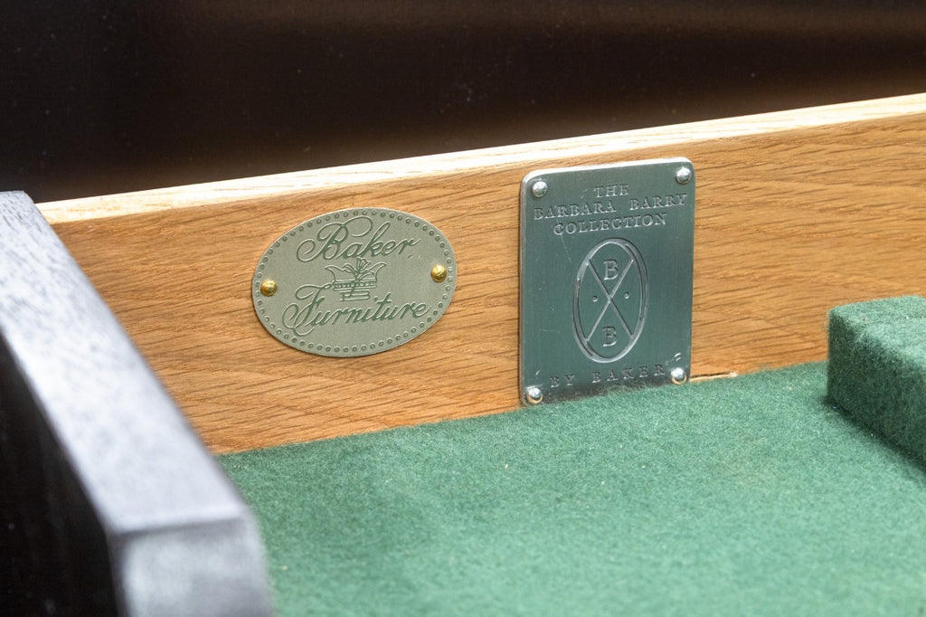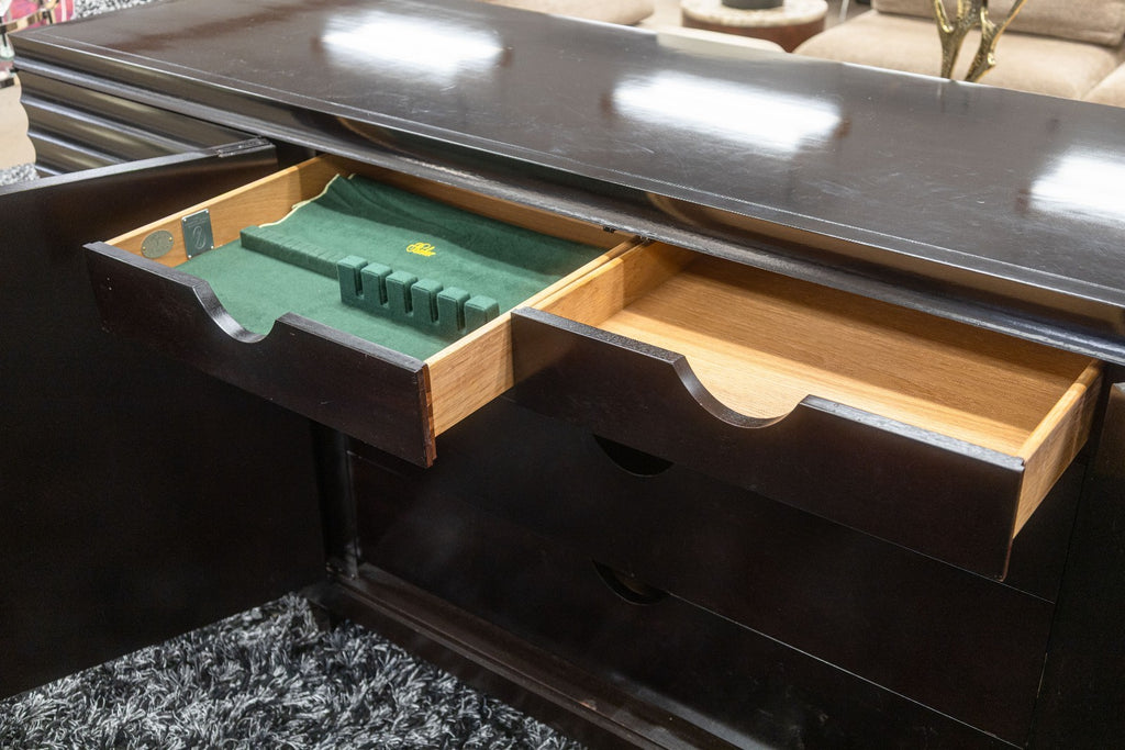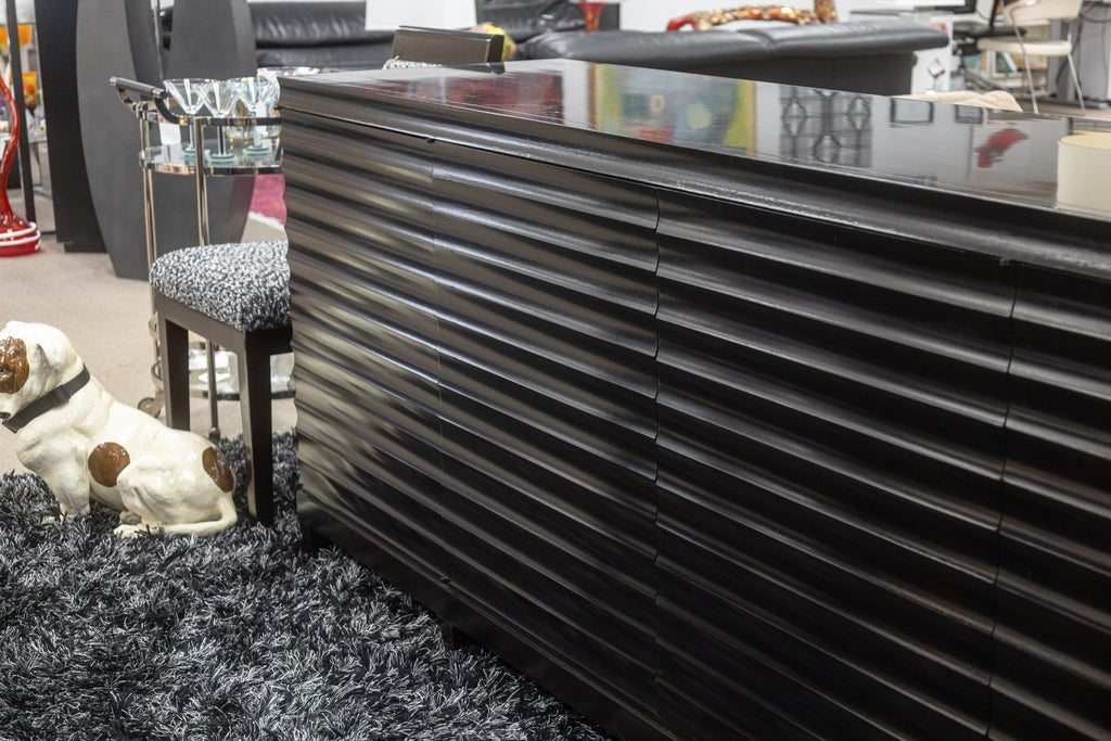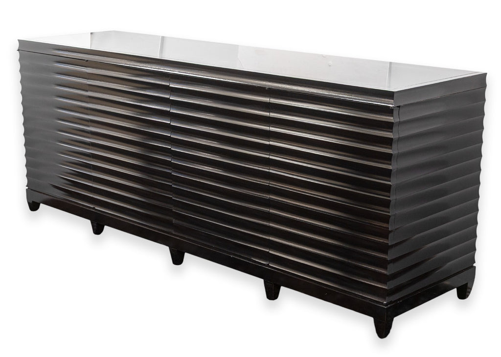 A Barbara Barry for Baker fluted sideboard credenza. This lovely modern cabinet features a wonderful fluted exterior design. The fluted design combined with the flush, handle-less doors makes for a very clean, modern design. The face features four push to open doors. The outer two doors open to reveal shelving, the the inner two doors reveal drawers. The center has three large drawers on the bottom, and two small drawers on the top. The top right drawer features a silverware display, and the Barbara Barry for Baker Plaques as pictured. This cabinet is in good condition overall, but there is some scratching to the outer finish on the top and sides. This cabinet measures 34 inches tall, 84 inches long, and 22 inches deep.