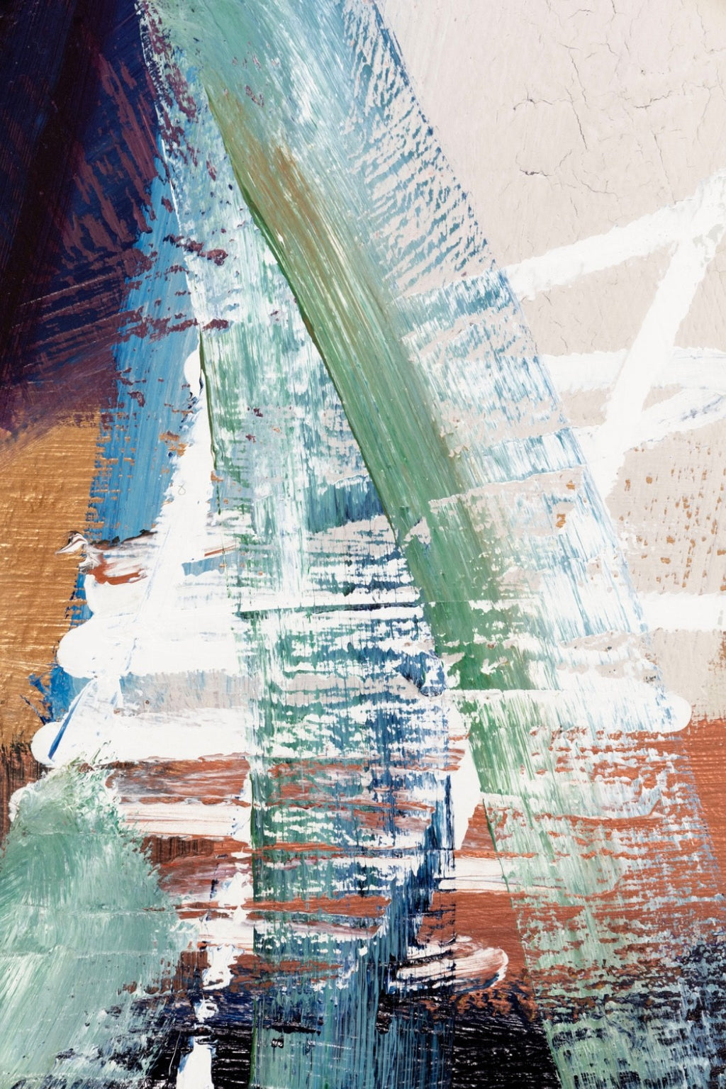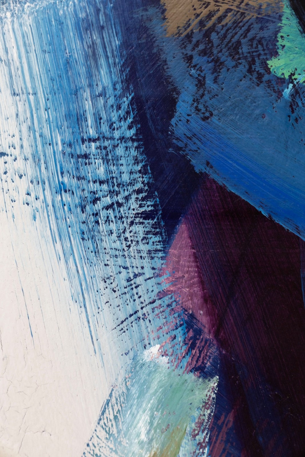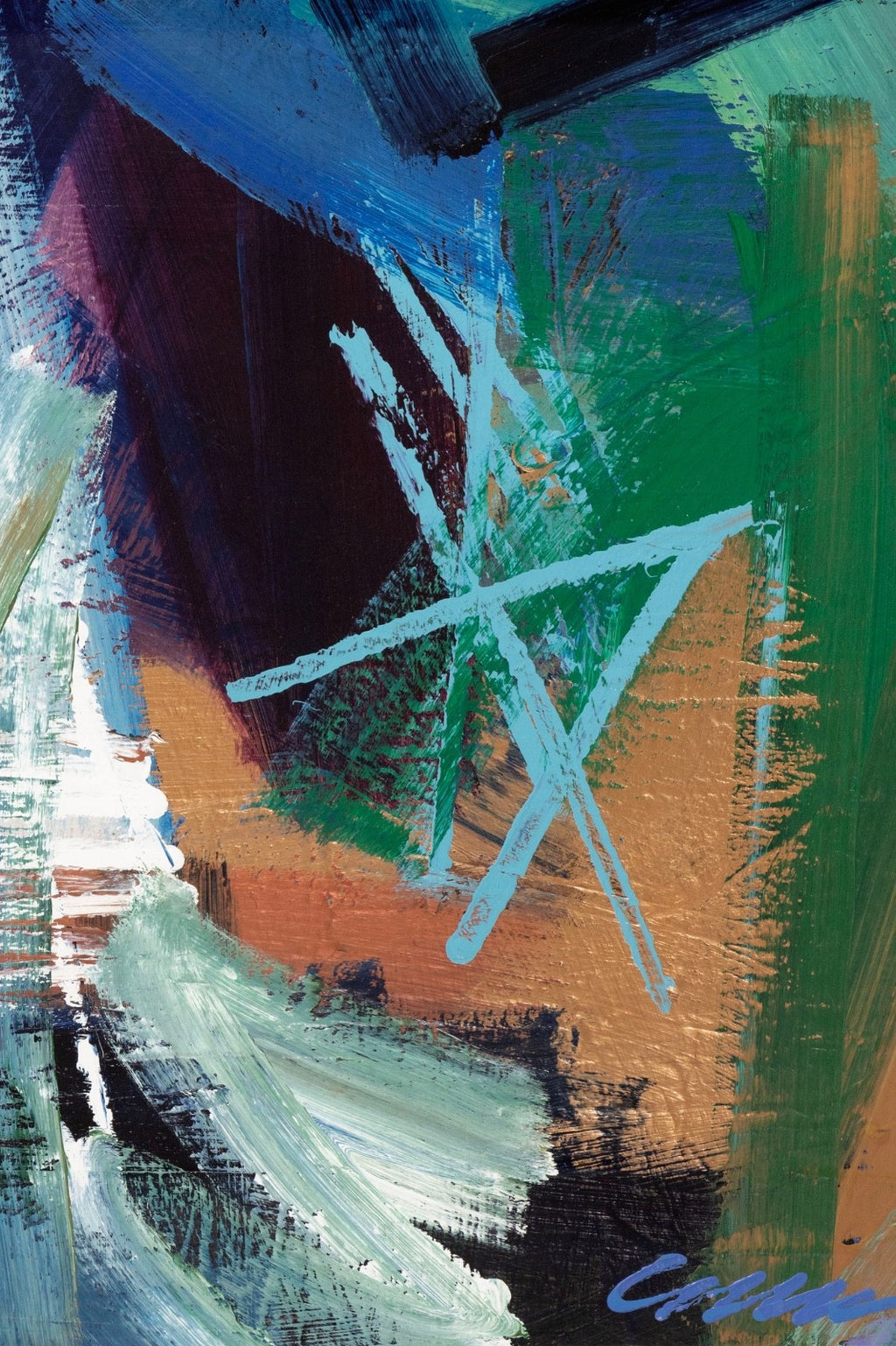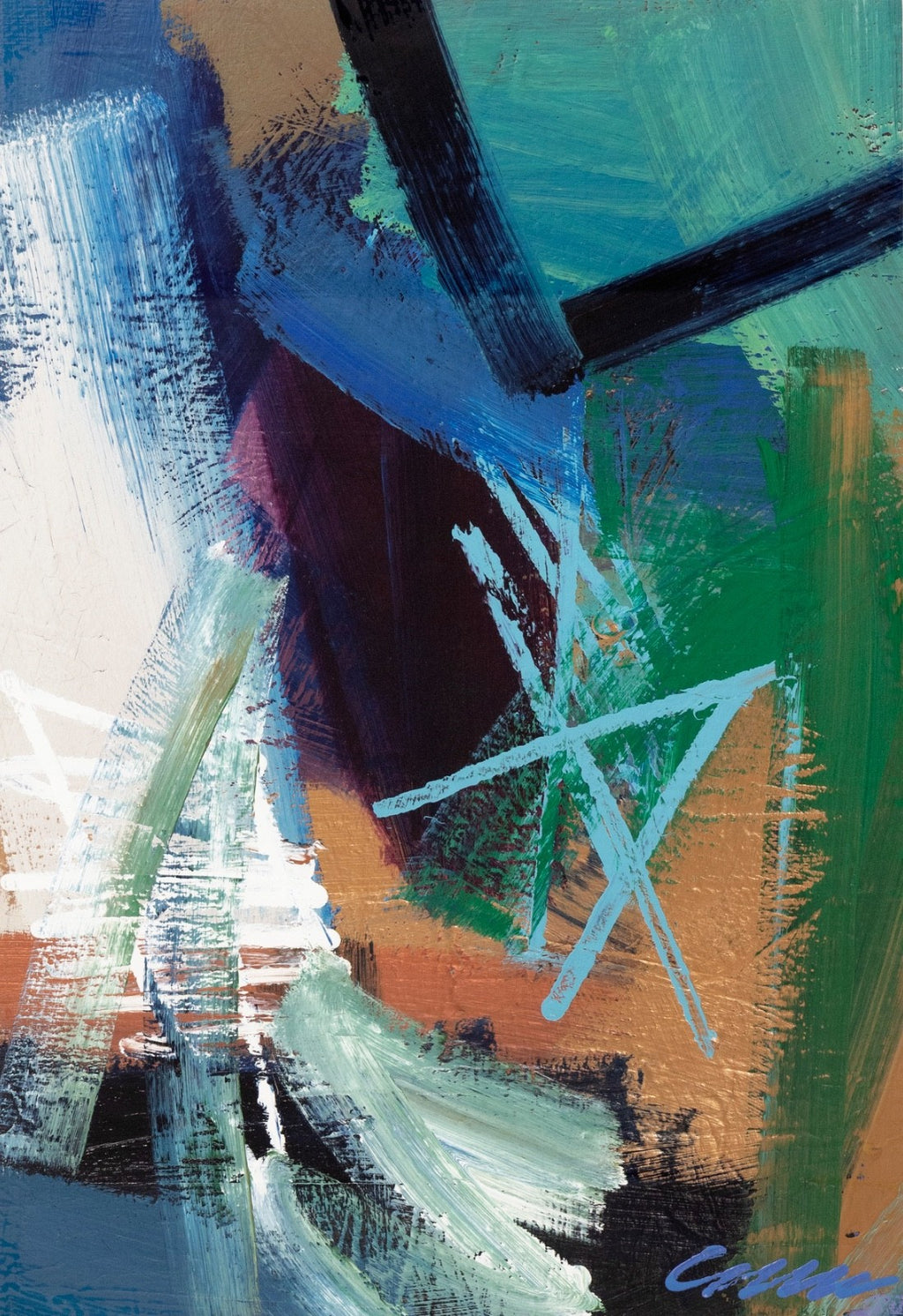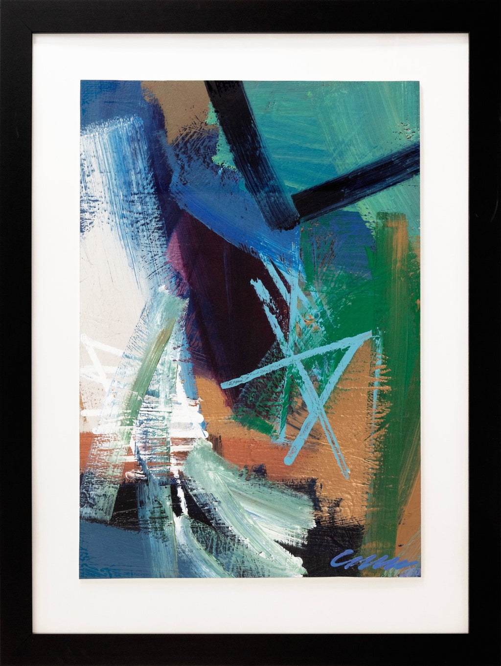 Executed in bold, gestural strokes of teal, indigo, white, and umber, the composition conveys dynamic energy and movement through layered brushwork and intersecting linear forms. The work exemplifies Conforti’s contemporary approach to abstraction—balancing color, rhythm, and expressive spontaneity. Professionally framed and presented under glass.