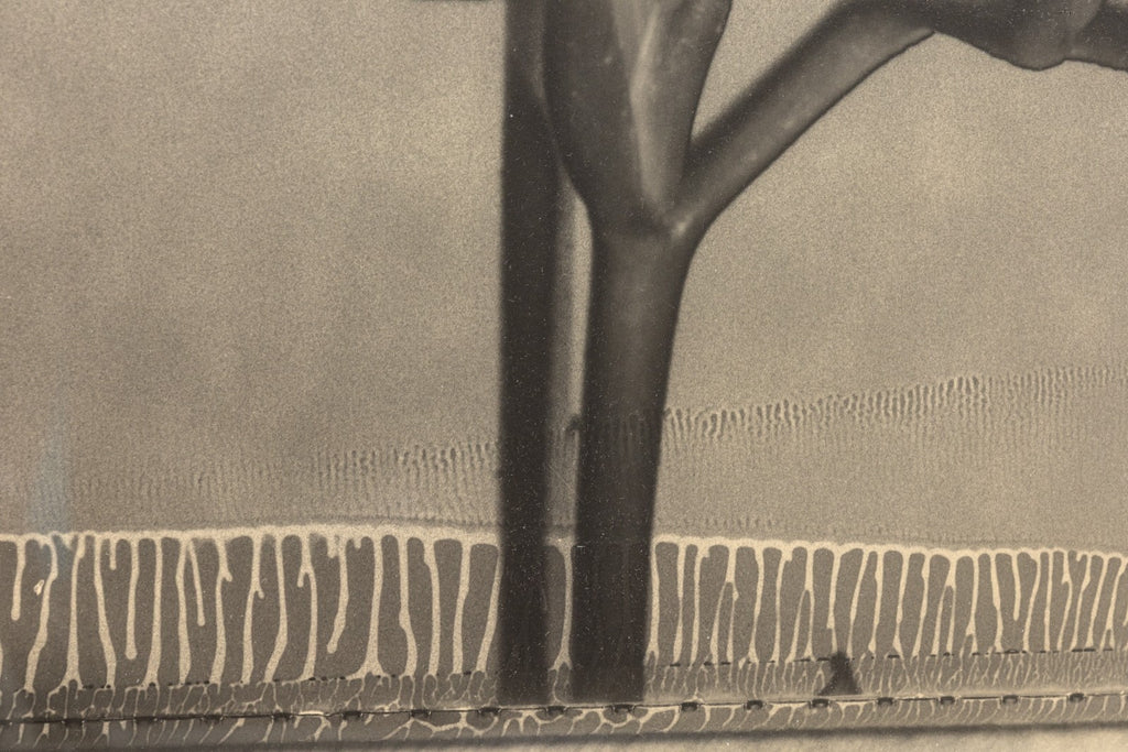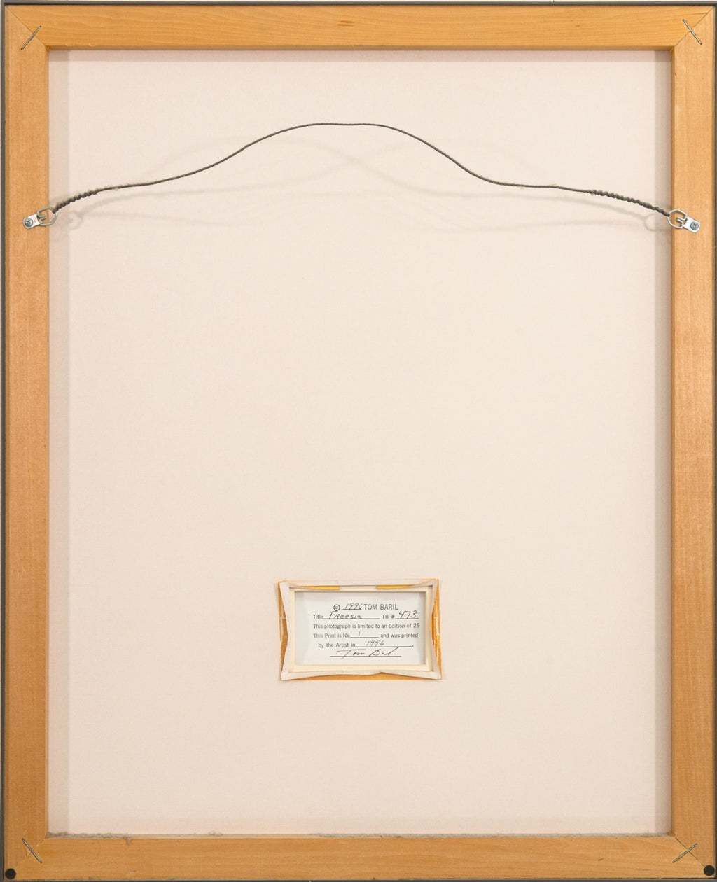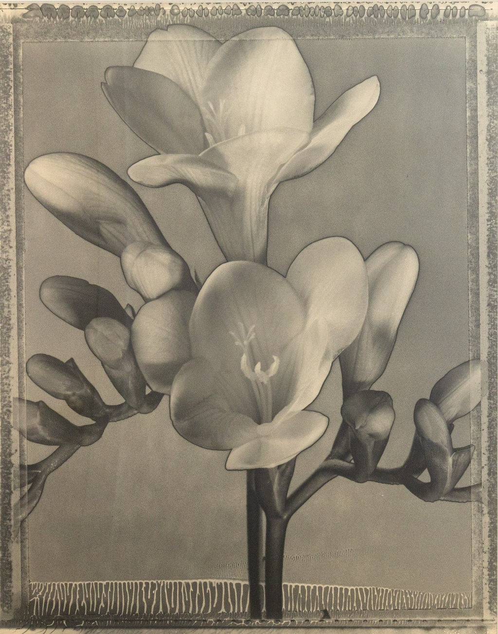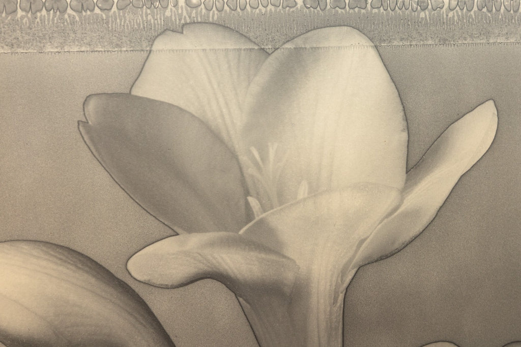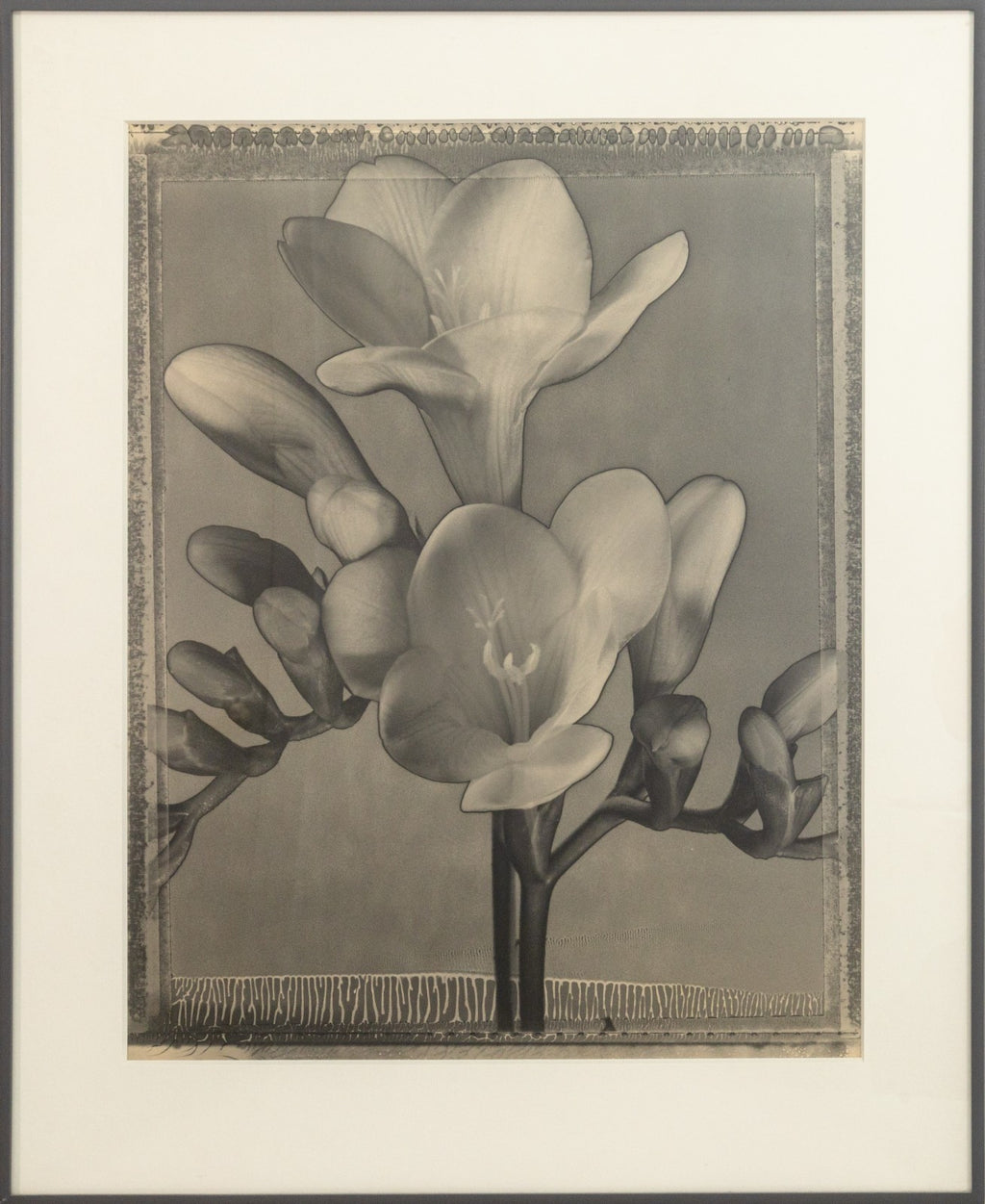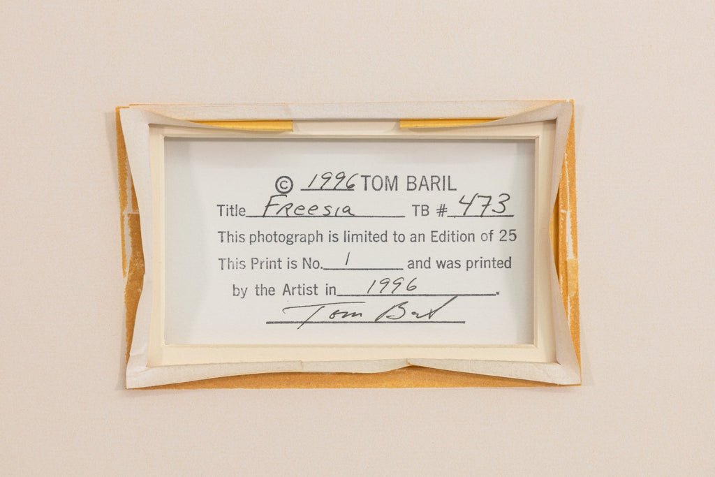 A contemporary silver gelatin print titled "Freesia #473" by Tom Baril. Signed and annotated 1/25 on the verso. Printed by the artist in 1996. A striking example of the photographer's celebrated floral studies - the natural form of a flower transforms into an almost sculptural presence. The work highlights Baril's technical mastery and his ability to blend sharp detail with soft tonal gradations. Known for elevating botanical subjects into timeless icons of modern photography, Baril captures the freesia with quiet elegance, evoking both delicacy and monumentality. This print embodies the precision and refinement that place Baril among the most acclaimed contemporary fine art photographers. From a private collection. Dimensions: 29.75"h x 24.25"w x 1.5"d (framed). In very good condition. Full condition reports are available upon request.