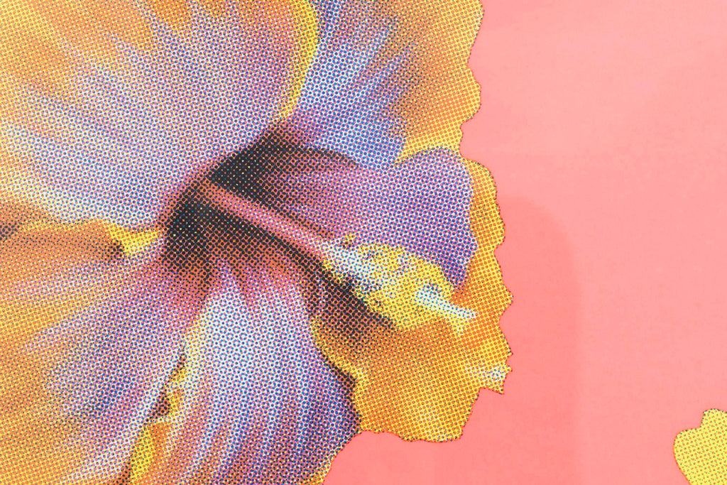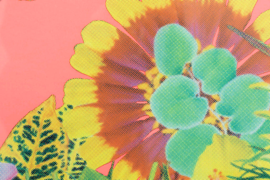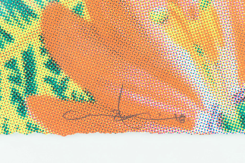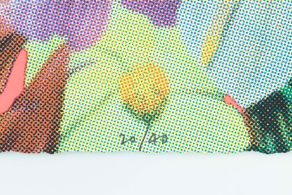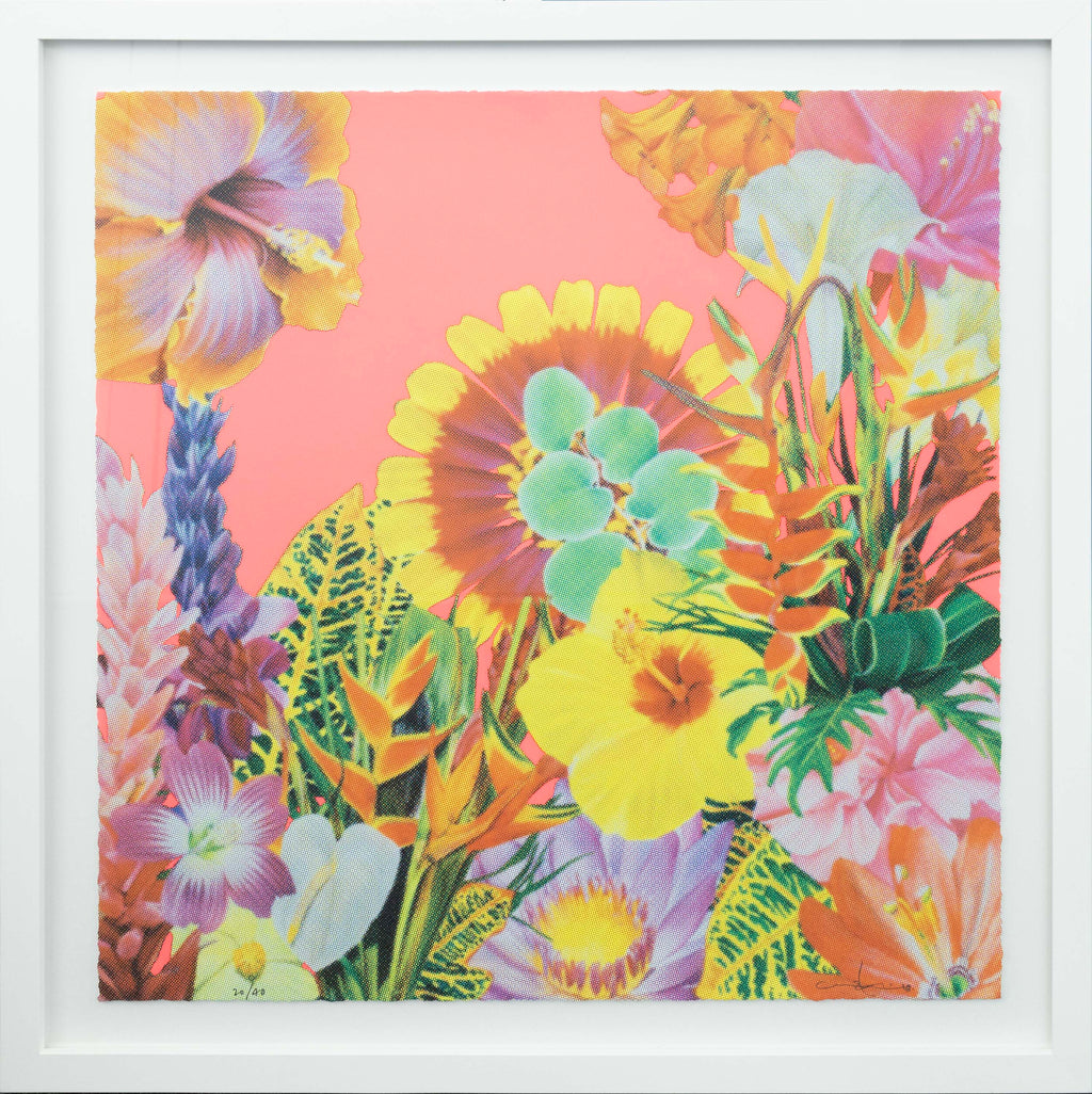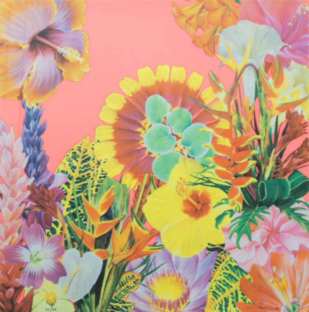 A vibrant screen print on archival paper titled “Fountain of Youth” by Carlos Rolon. Hand signed and dated 2018 on the lower right with an annotation of 20/40 on the lower left. This richly layered print bursts with lush tropical florals rendered in vivid hues of yellow, pink, orange, and green, set against a striking coral backdrop. The composition radiates energy and nostalgia, evoking themes of beauty, abundance, and imagined paradises. Executed with meticulous detail across multiple color layers, the print highlights Rolon’s mastery of surface, pattern, and visual rhythm. This work exemplifies the artist’s ability to blend contemporary pop sensibilities with references to botanical illustration and cultural symbolism. Dimensions: 24”w x 24”h.