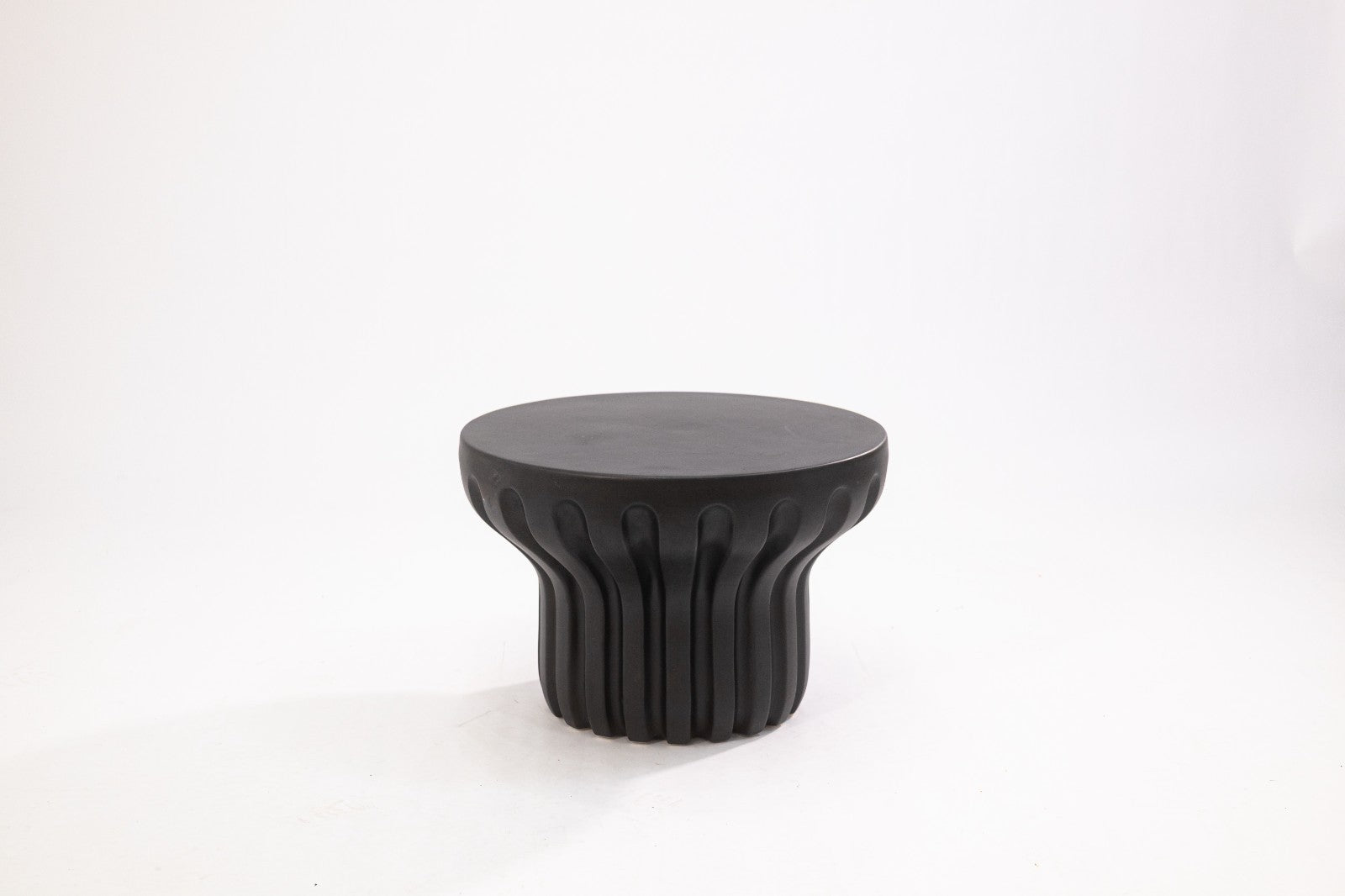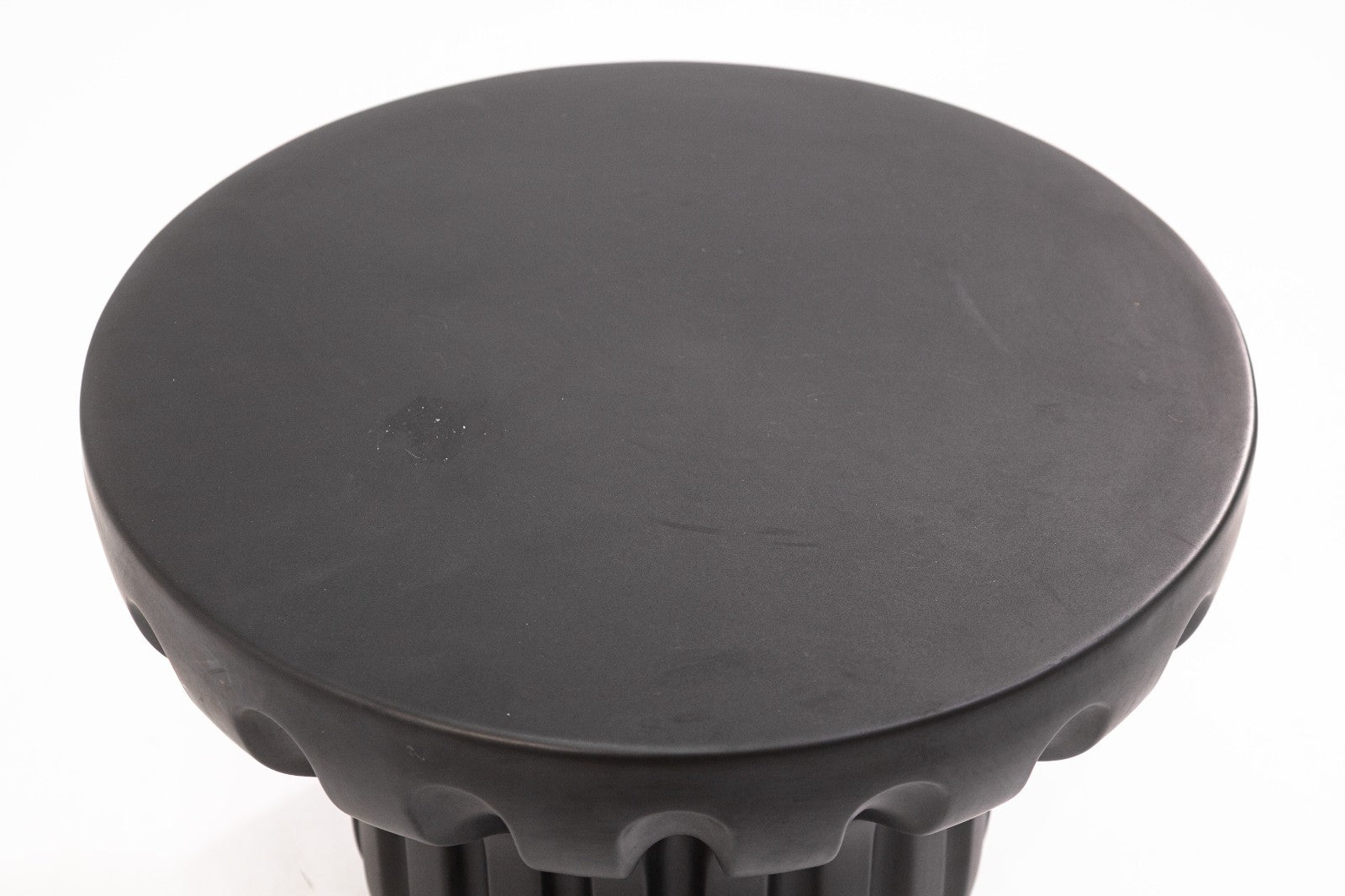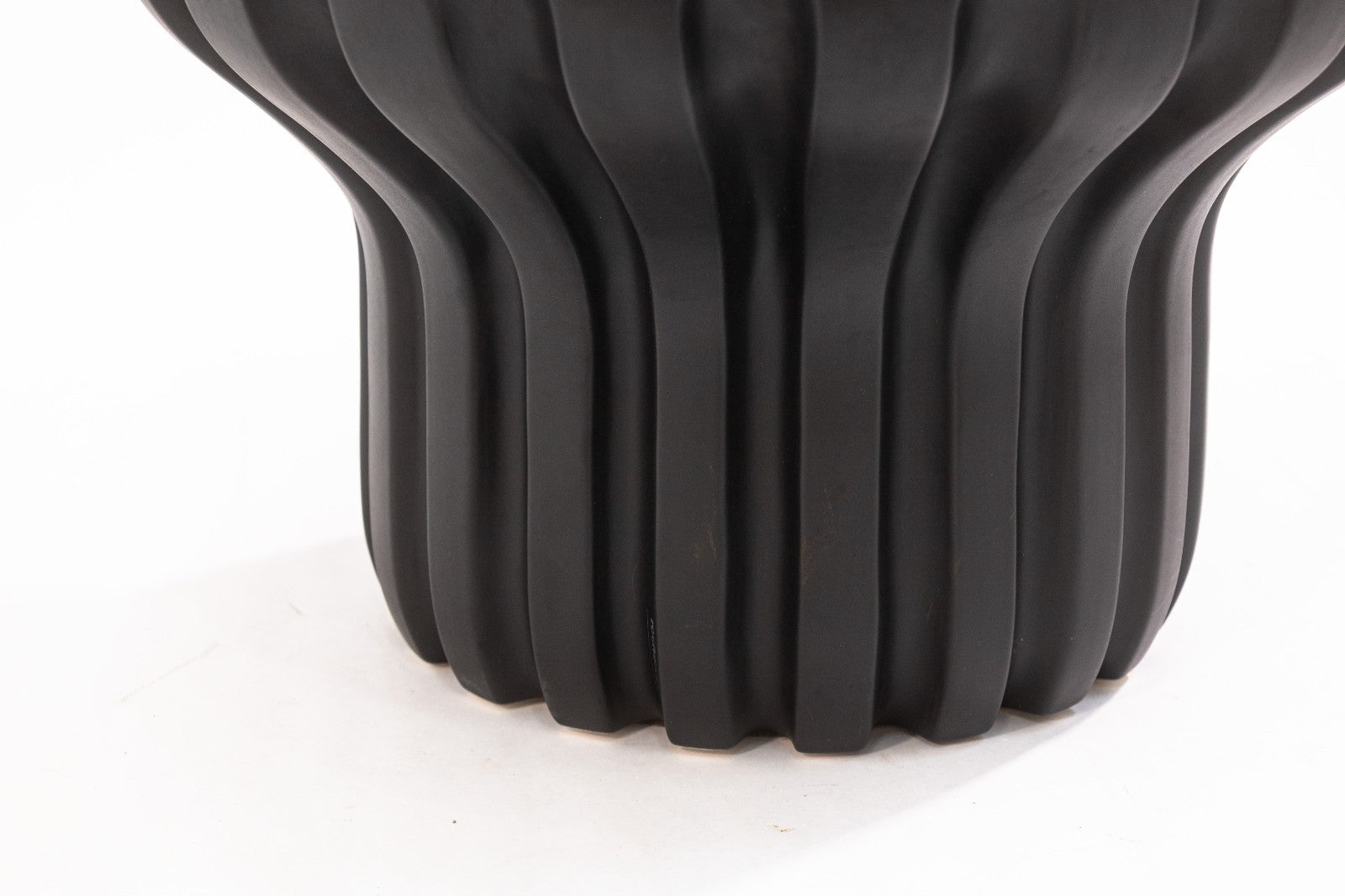 A contemporary low occasional table designed by Cedric Ragot for Roche Bobois. Model “Radian,” executed in ceramic with a noir brilliant finish. The table features a round top supported by a sculptural fluted base with vertical ribbing throughout. A functional sculptural form, this example represents Ragot’s collaboration with Roche Bobois.