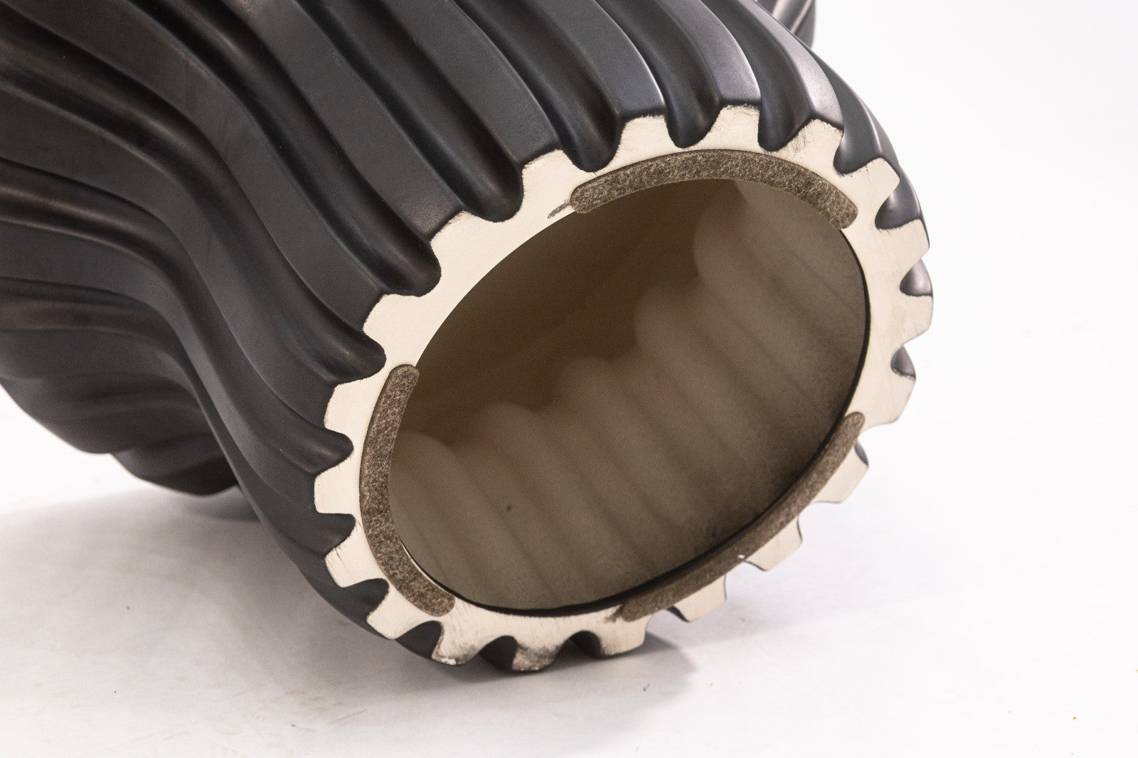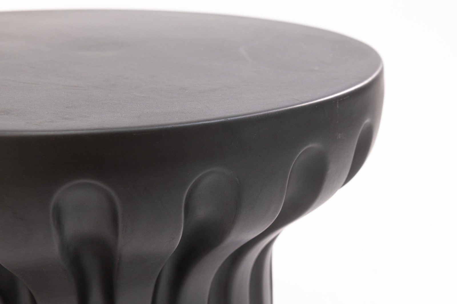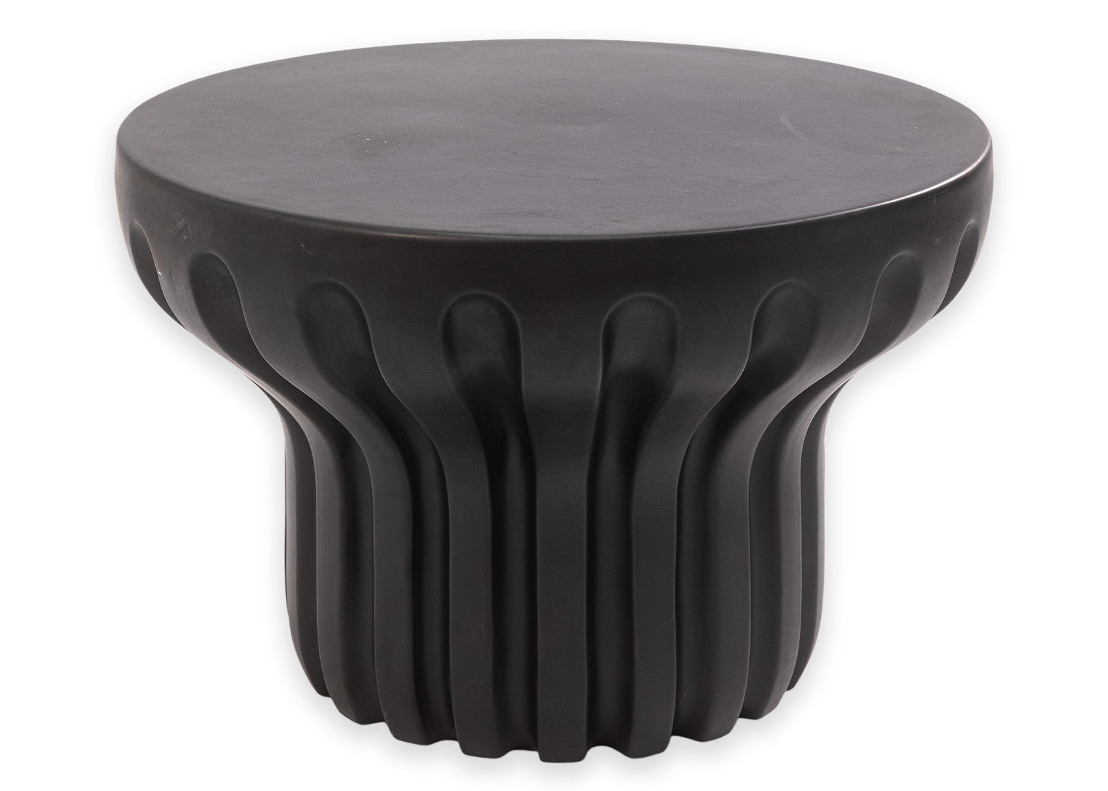 A contemporary low occasional table designed by Cedric Ragot for Roche Bobois. Model “Radian,” executed in ceramic with a noir brilliant finish. The table features a round top supported by a sculptural fluted base with vertical ribbing throughout. A functional sculptural form, this example represents Ragot’s collaboration with Roche Bobois.