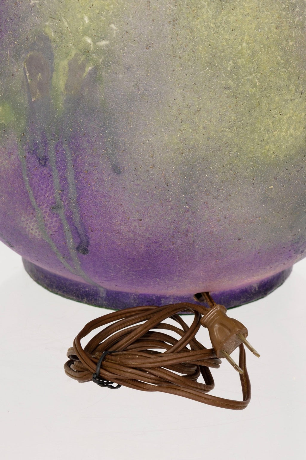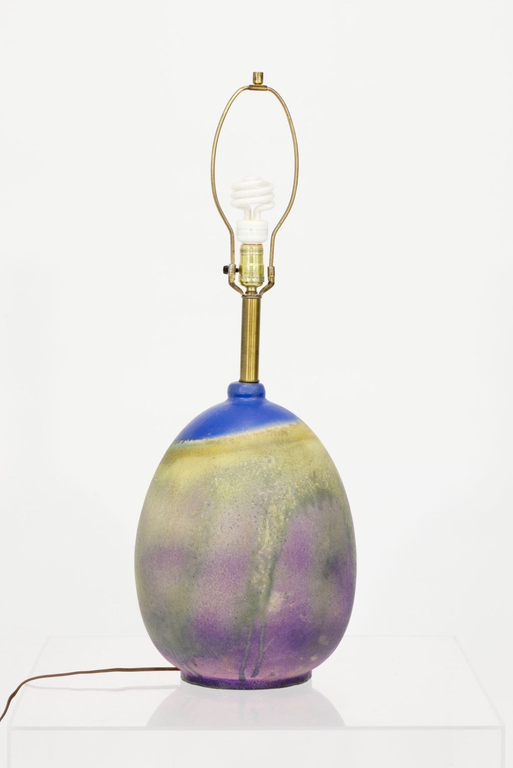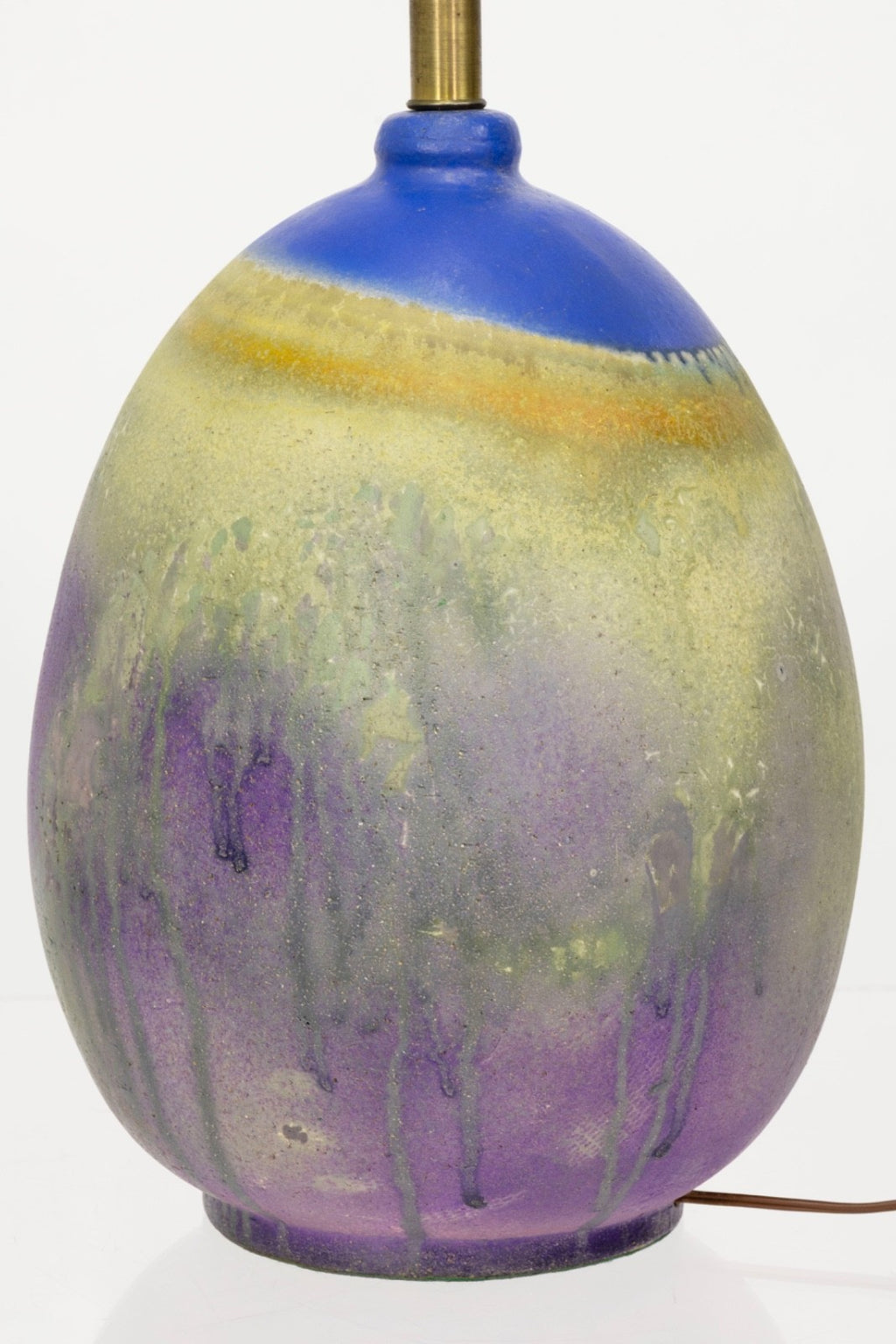 A sculptural ceramic table lamp designed by Marcello Fantoni for Raymor, showcasing the artist’s distinctive mid-century glazing techniques. The ceramic body features a beautifully atmospheric dripped glaze finish, blending soft tones of lavender, sage green, golden yellow, and cobalt blue. The layered glazing creates organic vertical runs and subtle textural variations that highlight Fantoni’s expressive studio pottery aesthetic. The lamp is topped with its original fabric shade, which complements the warm tones of the ceramic base while maintaining the lamp’s authentic mid-century presentation. A simple brass neck fitting provides a clean transition between the base and shade. The Lamp is in good condition and measures 34.5 inches in height and has a diameter of 15.5 inches.