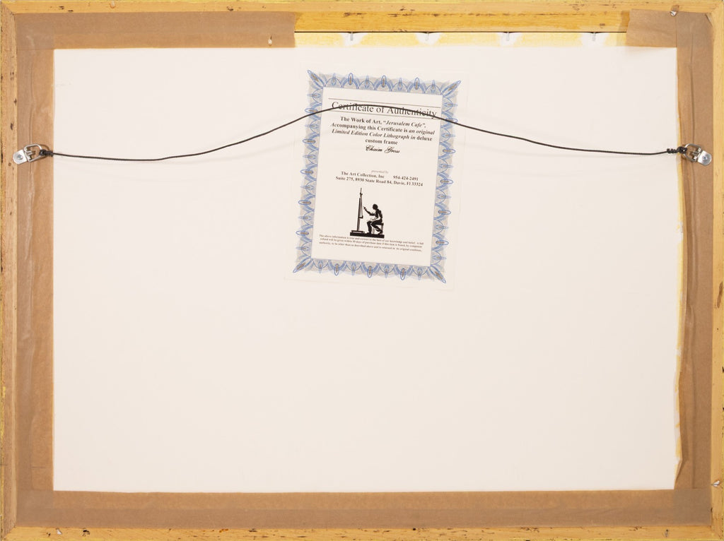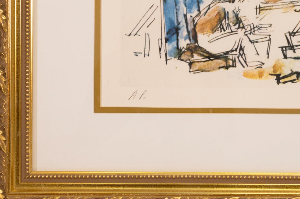 An expressive color lithograph on paper titled "Jerusalem Cafe" by Chaim Gross. Hand signed in pencil on the lower right with an AP annotation on the lower left. The composition depicts an animated street scene with open cafe doors revealing patrons in conversation, framed by vibrant architectural details in rich reds and blues. Loose, gestural linework combined with washes of color evoke the warmth and vitality of everyday life in Jerusalem. From a private collection. Dimensions: 27"h x 36"w x 1.5"d (framed). In very good vintage condition. Full condition reports are available upon request.