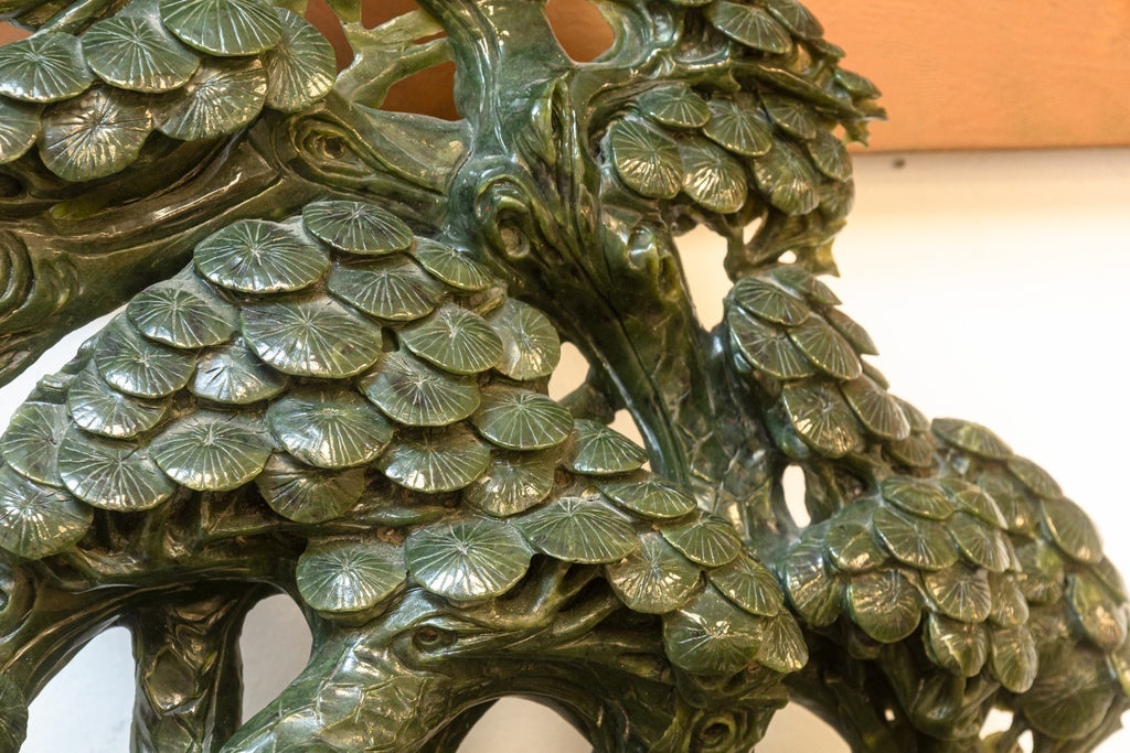 A vintage Chinese sculpture intricately carved from rich green jade, featuring the Taoist deity Shou Lao (symbol of longevity), a deer (representing prosperity), peaches (symbols of immortality), and a finely detailed pine tree canopy. The deity stands beneath a sweeping arch of foliage and gnarled branches, rendered in exquisite relief with overlapping stylized leaves. The entire scene is dramatically supported by a coiled dragon-like base with scaled details, set on a carved wood pedestal. A stunning example of traditional Chinese craftsmanship, symbolizing harmony, long life, and auspicious fortune.