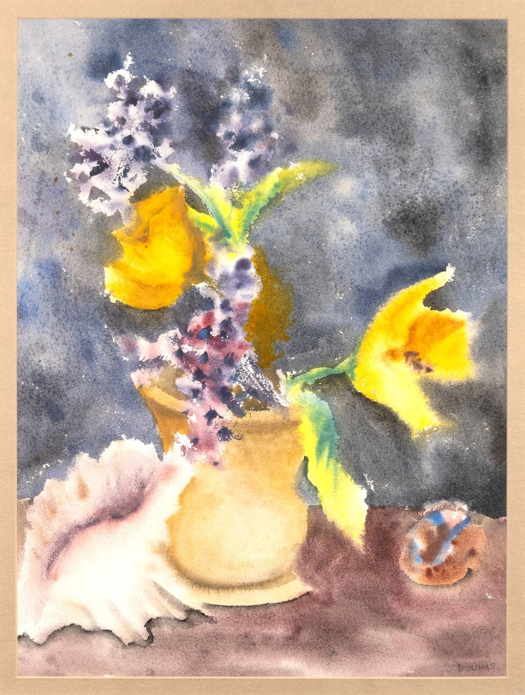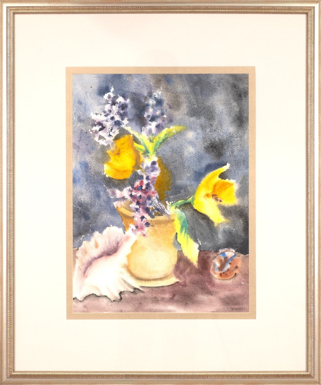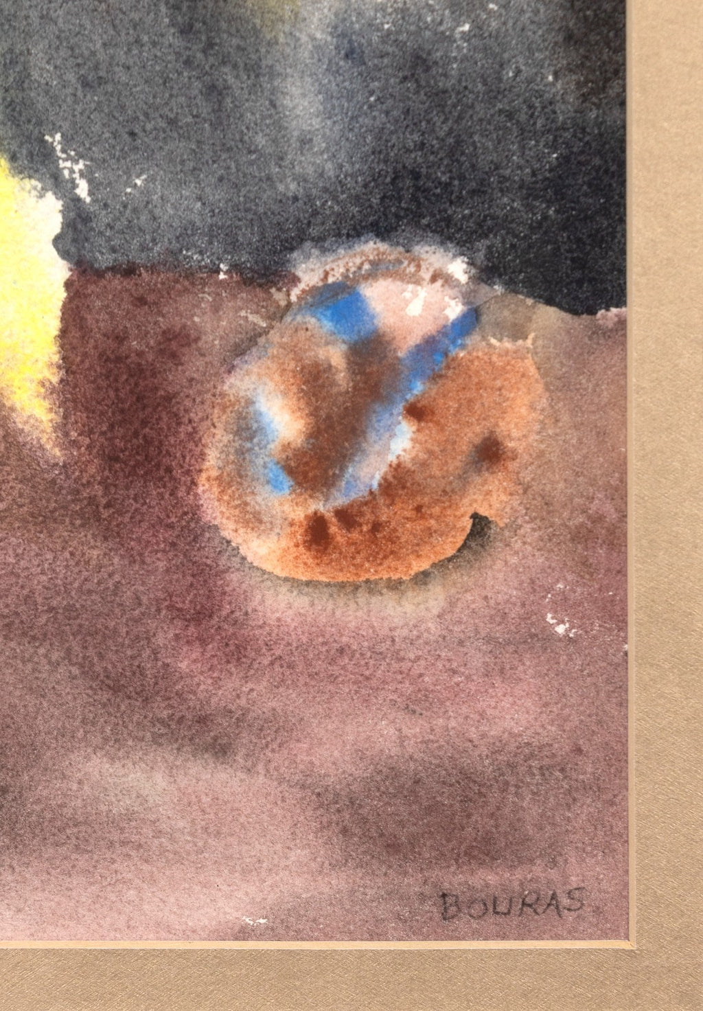 A contemporary impressionist watercolor on paper by Chuck Bouras. Signed lower right. The composition features a loosely rendered tabletop arrangement. The artist employs fluid brushwork, soft edges, and a harmonious palette to evoke the fleeting quality of light and form. The composition's painterly spontaneity and layered transparency showcase the expressive possibilities of watercolor within the impressionist tradition. From a private collection. Dimensions: 21.5"h x 17.5"w x 1.5"d (framed). In very good vintage condition. Full condition reports are available upon request.