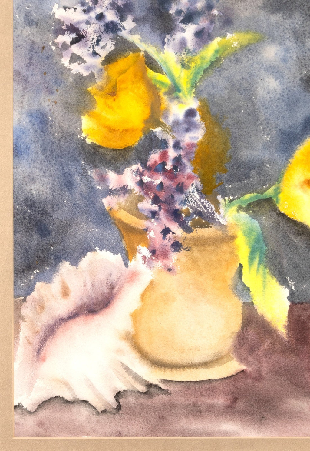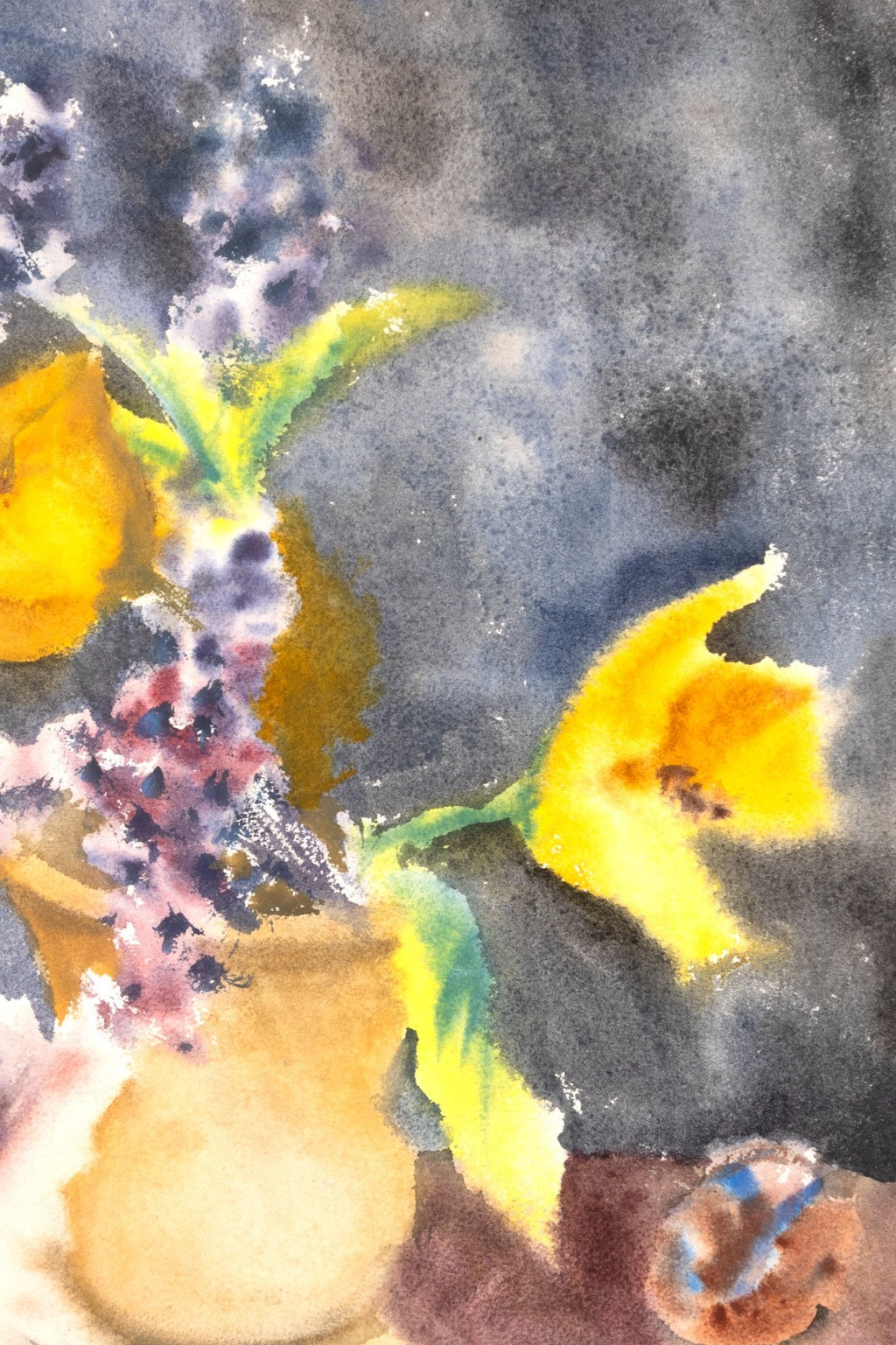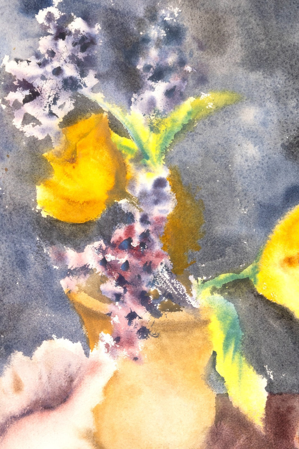 A contemporary impressionist watercolor on paper by Chuck Bouras. Signed lower right. The composition features a loosely rendered tabletop arrangement. The artist employs fluid brushwork, soft edges, and a harmonious palette to evoke the fleeting quality of light and form. The composition's painterly spontaneity and layered transparency showcase the expressive possibilities of watercolor within the impressionist tradition. From a private collection. Dimensions: 21.5"h x 17.5"w x 1.5"d (framed). In very good vintage condition. Full condition reports are available upon request.