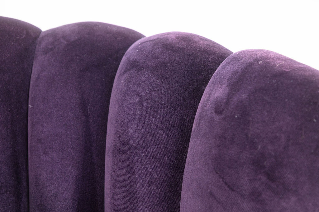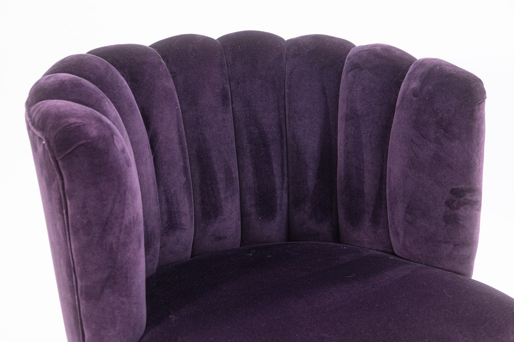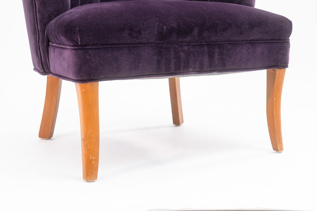 An art deco style contemporary modern channel back accent chair. This lovely lounge chair features a deep purple velvet fabric, upholstered beautifully across the rounded channel back and through the seat cushion. The chair sits on four blonde wooden legs. Overall, this chair is in very good condition. It measures 27.5 inches tall, 27 inches wide, and 23 inches deep. It has a seat height of 15 inches, a seat width of 24 inches, a seat depth of 17 inches, and a back height of 12 inches.