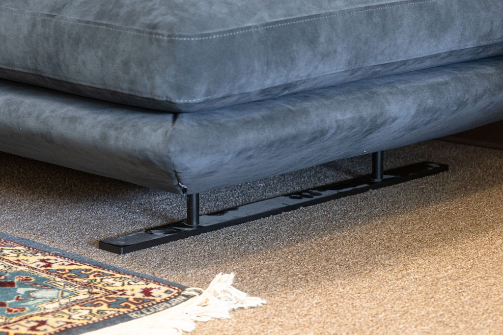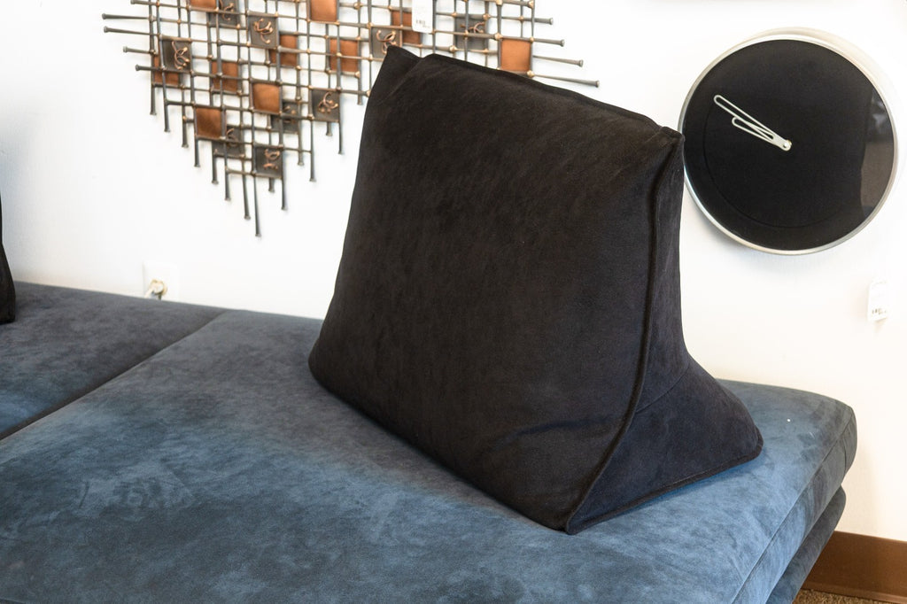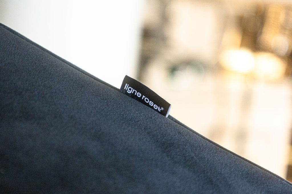 A Prado sofa by Christian Werner for Ligne Roset. This is a beautiful contemporary sofa with a unique adjustable seat design. The Prado consists of a large rectangular platform seat, and two fully moveable, removable backrests. The backrests feature a special non-slip bottom surface which lets them be picked up and moved around the sofa while still maintaining their stability. They can even be fully removed from the sofa and used elsewhere on the ground. Both the cushions and the sofa are covered in a gorgeous, soft alcantara fabric upholstery; blue on the sofa, and black for the backrests. The whole sofa is supported by a very sturdy metal frame, with a pair of accenting flat black metal legs. The Ligne Roset tagging can be found on the seam below the sofa as pictured. This sofa is in very good condition. It measures 34 inches tall, 80 inches long, and 40 inches wide. It has a seat height of 16 inches, a back height of 18 inches, and the cushions measure 25 x 16 inches wide.