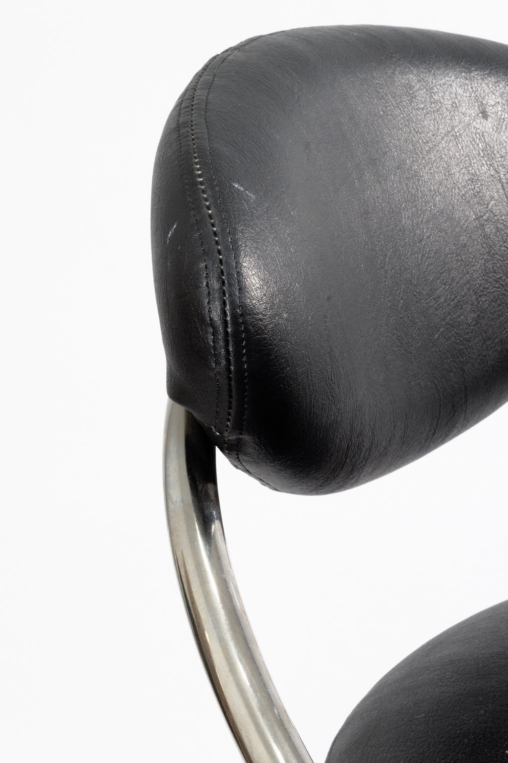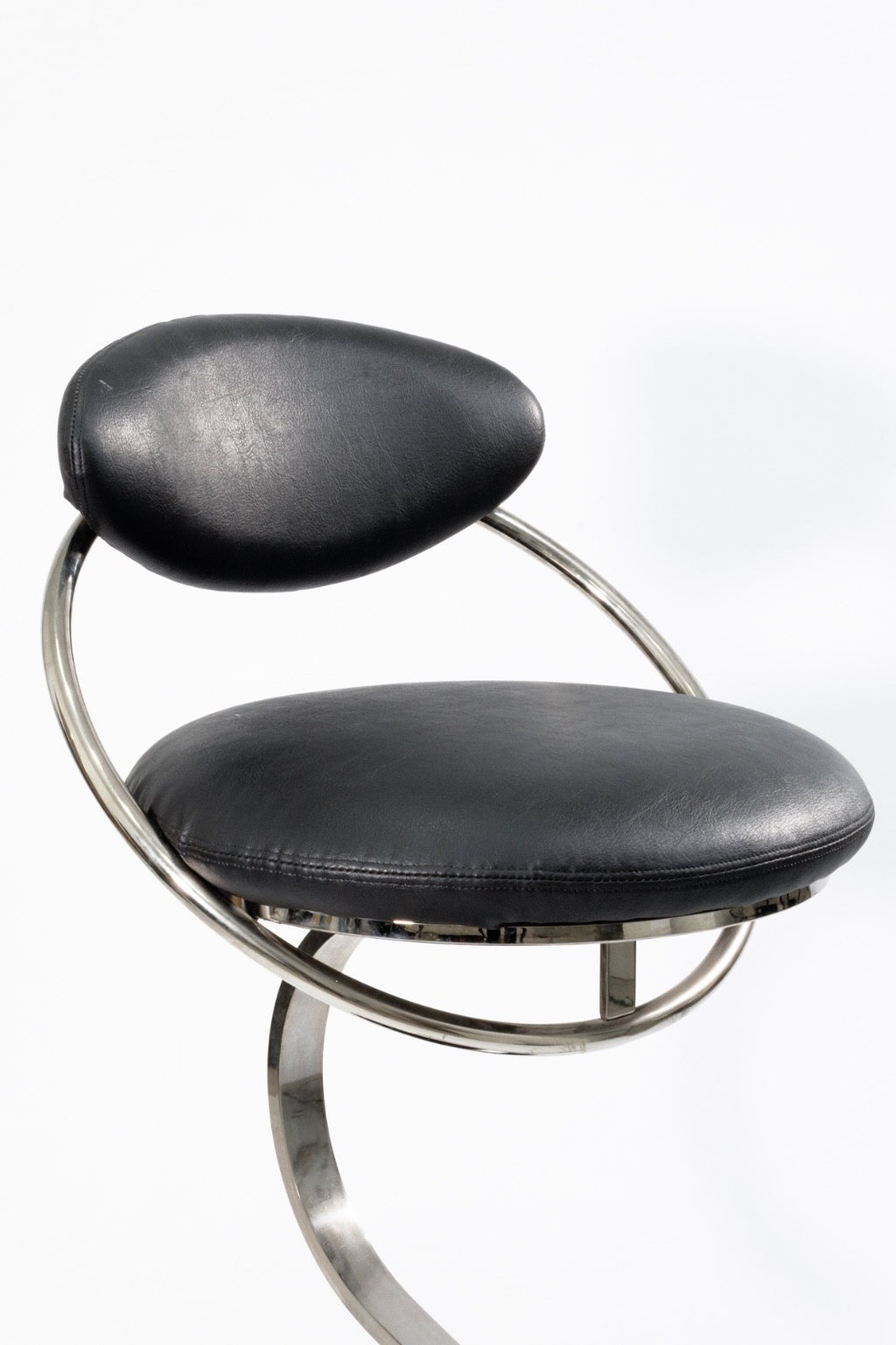 Sleek and sculptural, these high-top barstools by the Design Institute of America embody modern sophistication. Featuring polished chrome frames with bold curves, circular bases, and integrated footrests, they balance style with stability. The seats and backs are upholstered in smooth black leather, providing both comfort and a refined contrast to the gleaming chrome. The barstools are in good condition and measure 39 inches in height (adjustable), 19.5 inches in width, and 20 inches in depth. The seat height is 31 inches, the seat width is 19.5 inches, and the seat depth is 17 inches. There are seven chairs available.