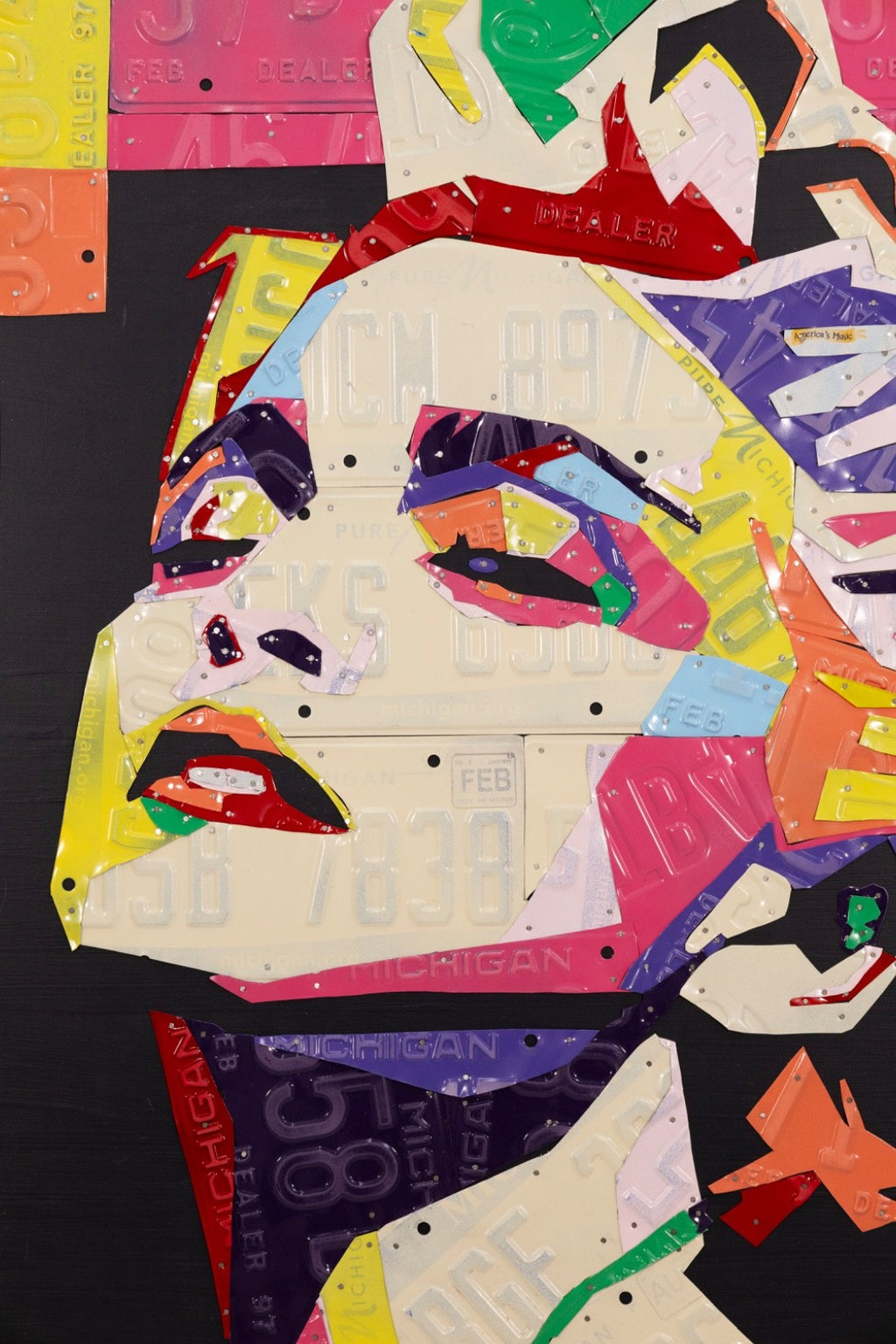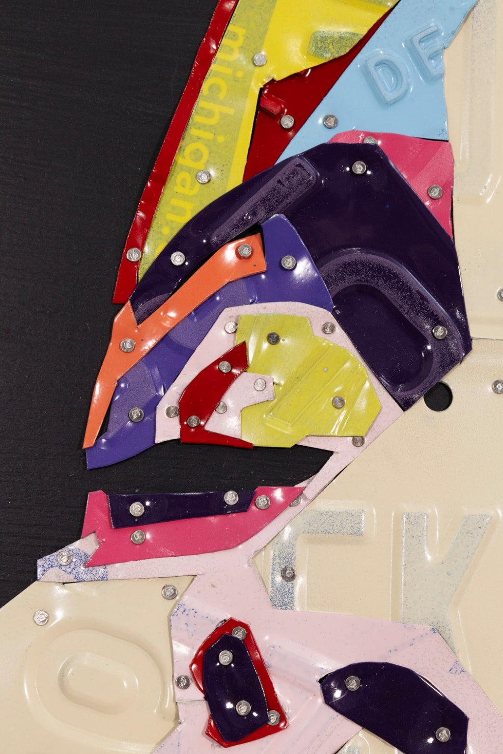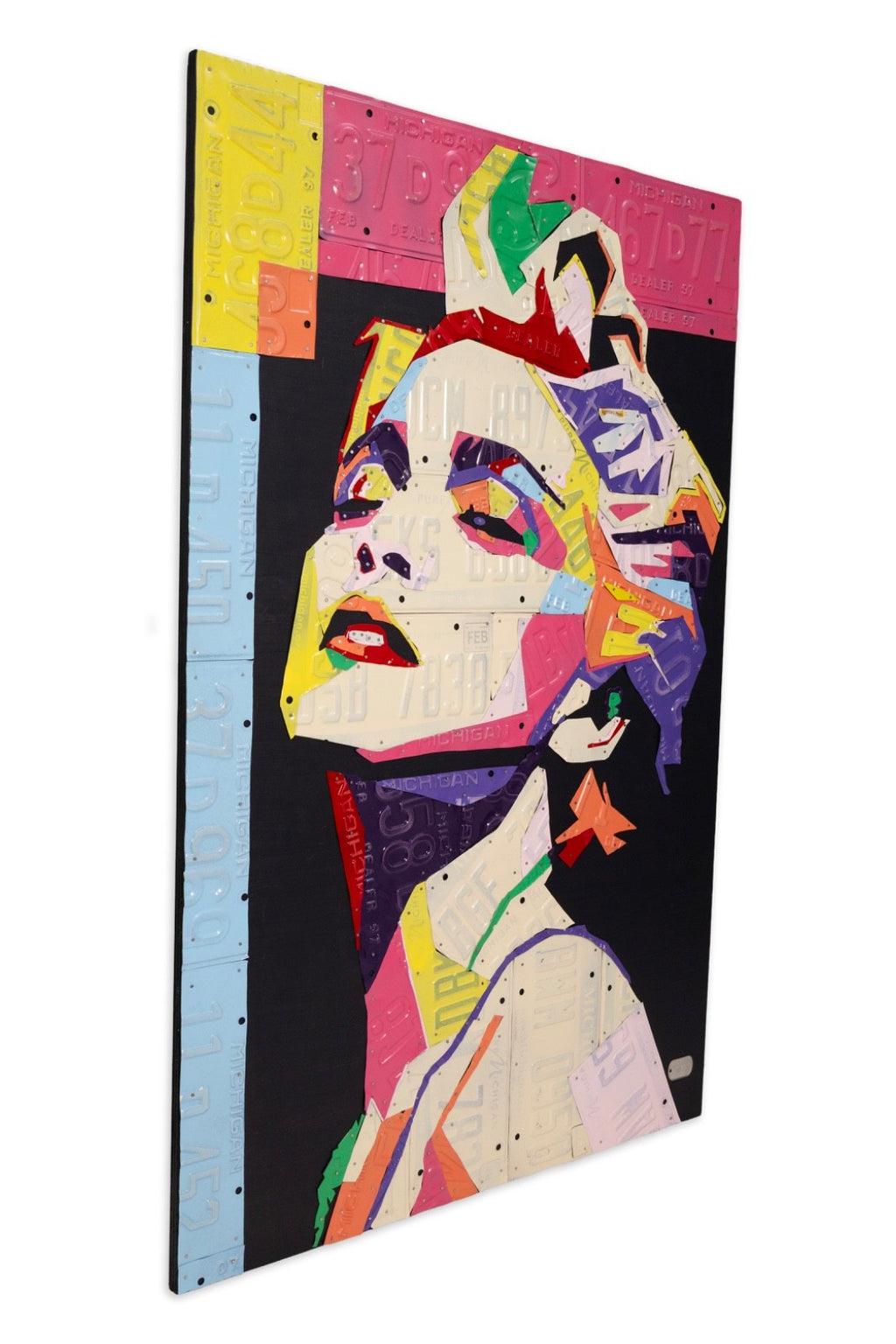 A vibrant and meticulously crafted portrait of pop artist icon Madonna composed entirely of reclaimed vintage American license plates. This striking assemblage by Design Turnpike transforms salvaged automotive relics into a dynamic mosaic of color and texture. The artist’s signature technique—layering cut metal pieces to form expressive, faceted compositions—celebrates both pop culture and Americana. A standout contemporary tribute to Madonna’s electric legacy and the art of creative reuse. Dimensions: 48"h x 32"w x 1"d. In very good condition.