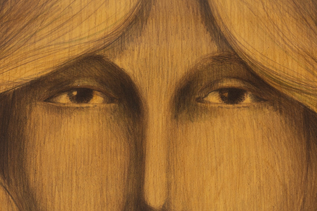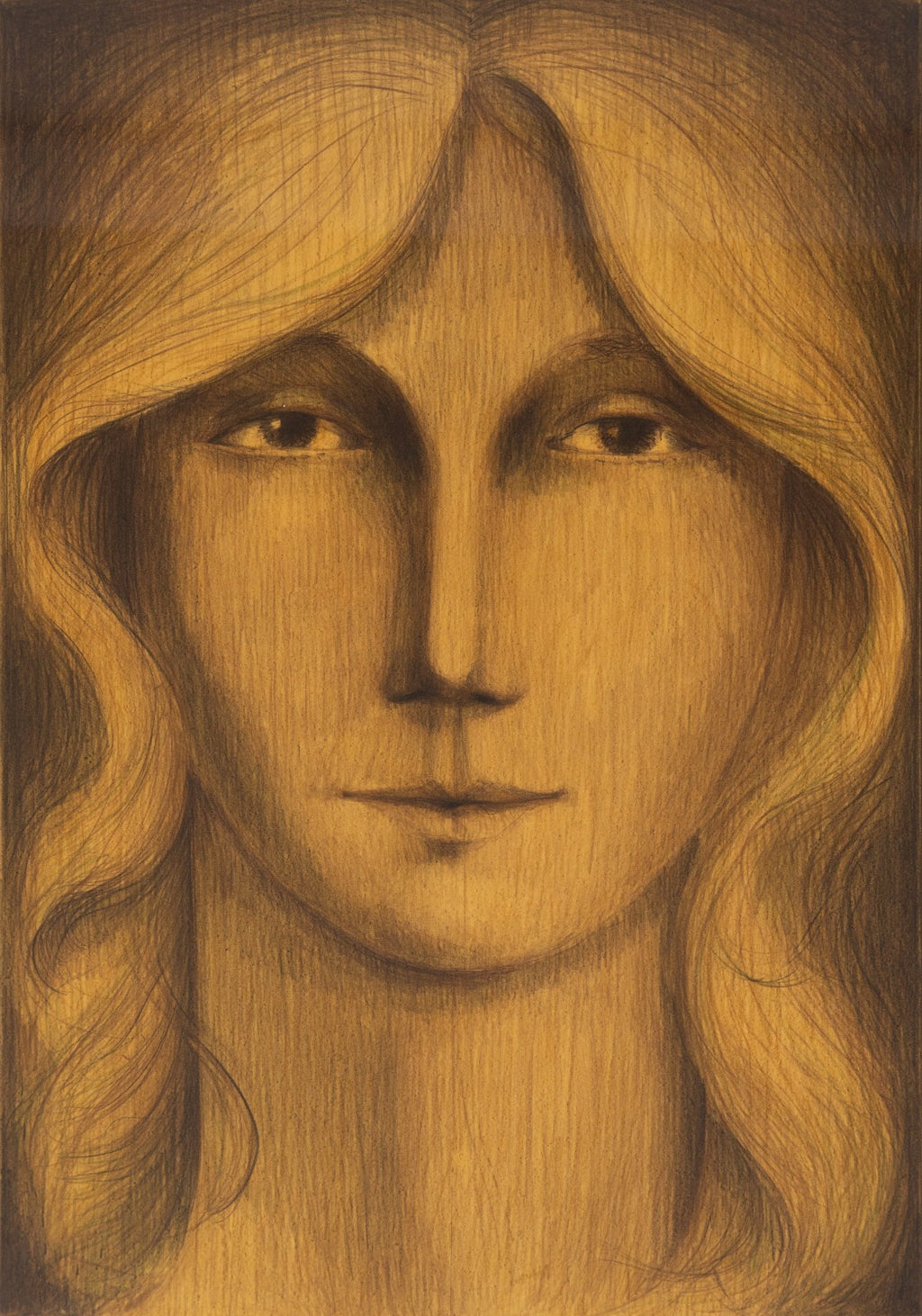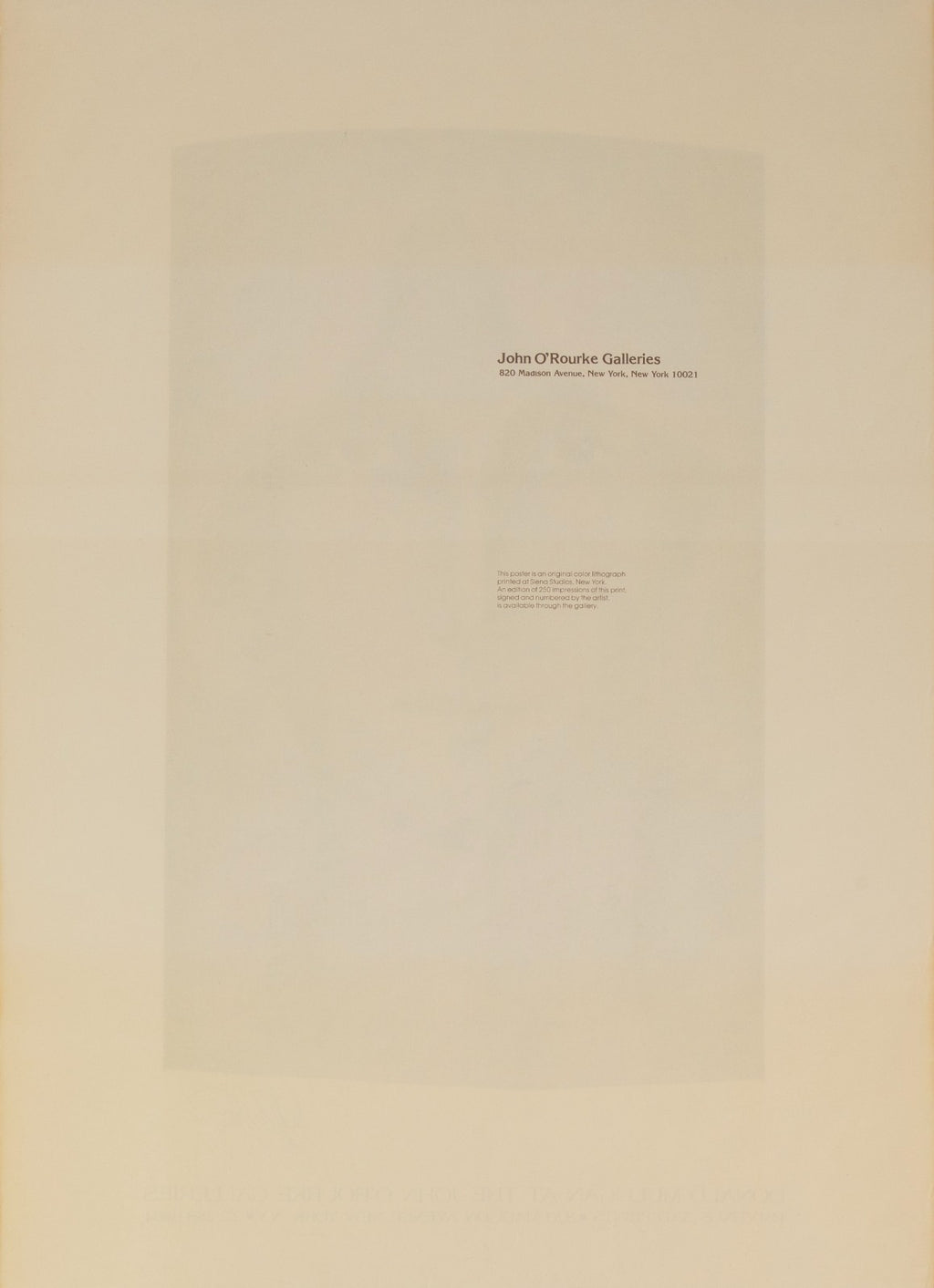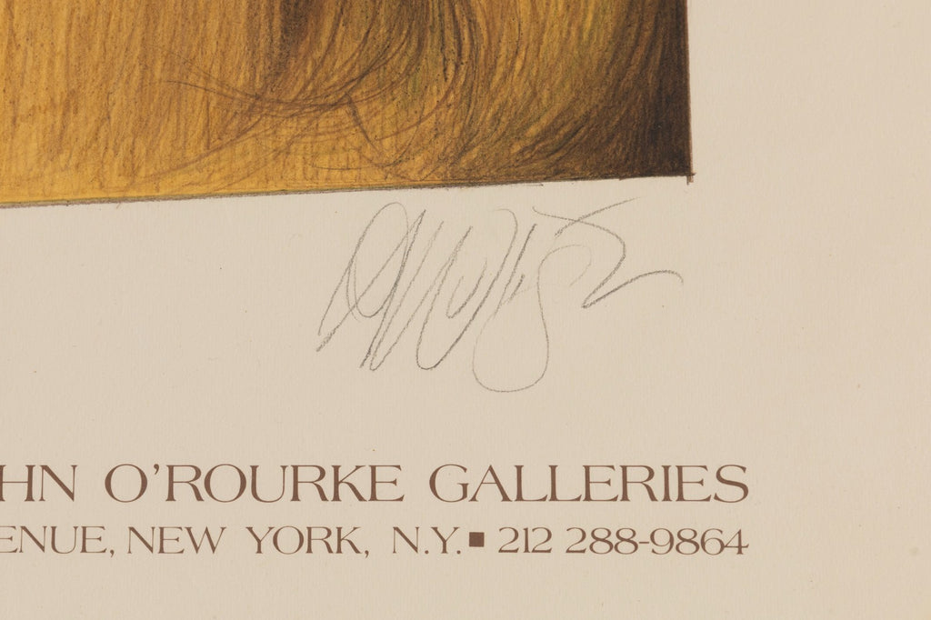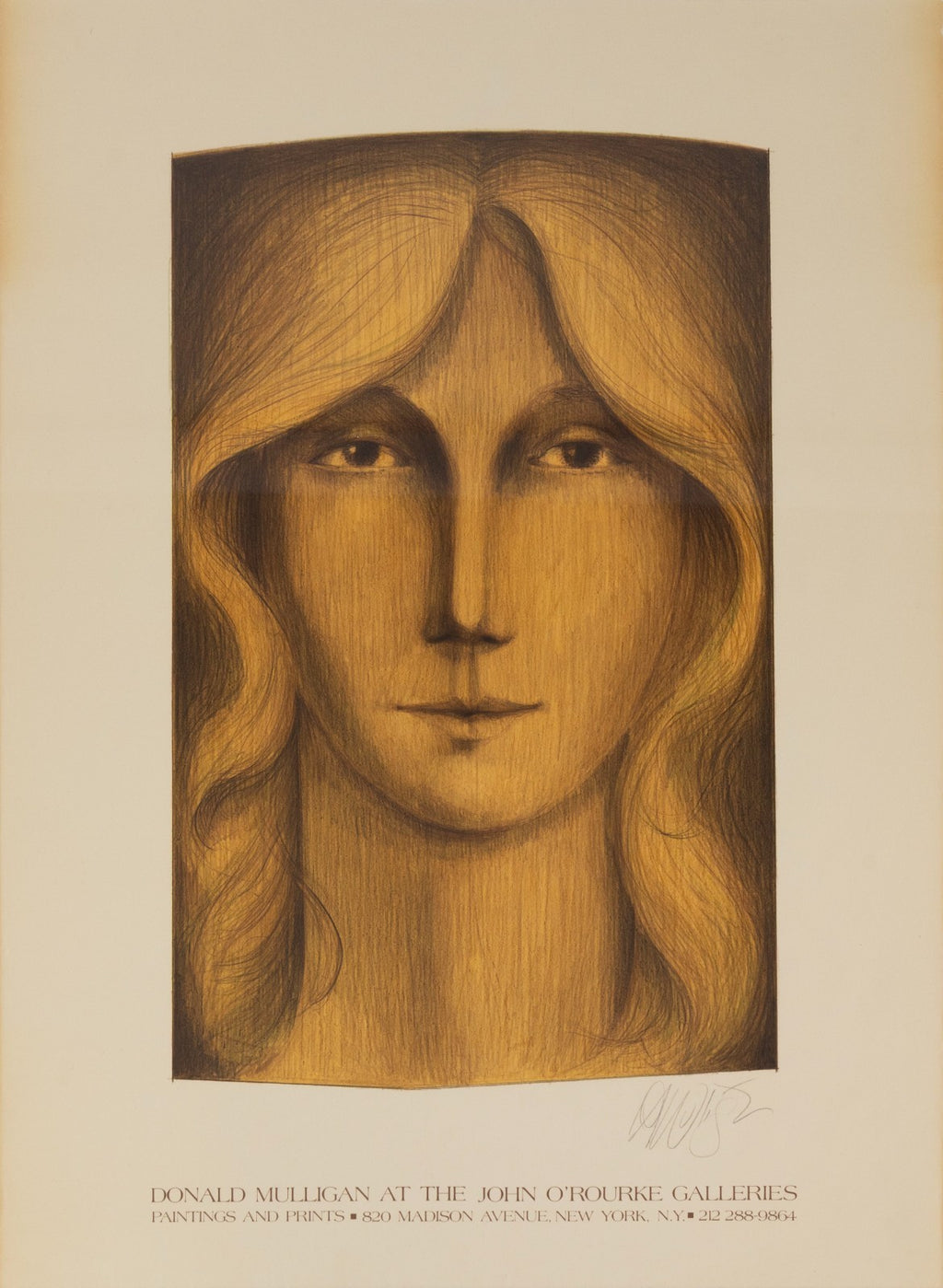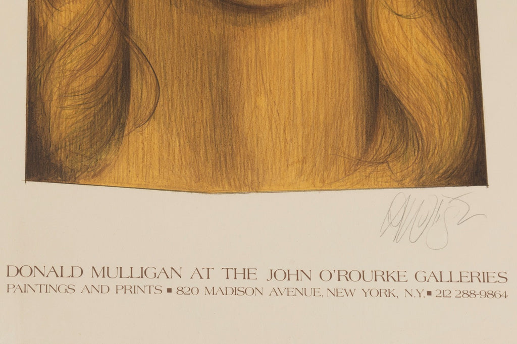A modern lithographic exhibition poster created for Donald Mulligan's exhibition at the John O'Rourke Galleries, 820 Madison Avenue, New York. The composition features a serene, stylized portrait of a woman rendered in warm golden and brown tones. Hand-signed in pencil lower right. From a private collection. Dimensions: 29.5"h x 21.5"w (unframed). In very good vintage condition.