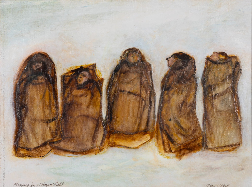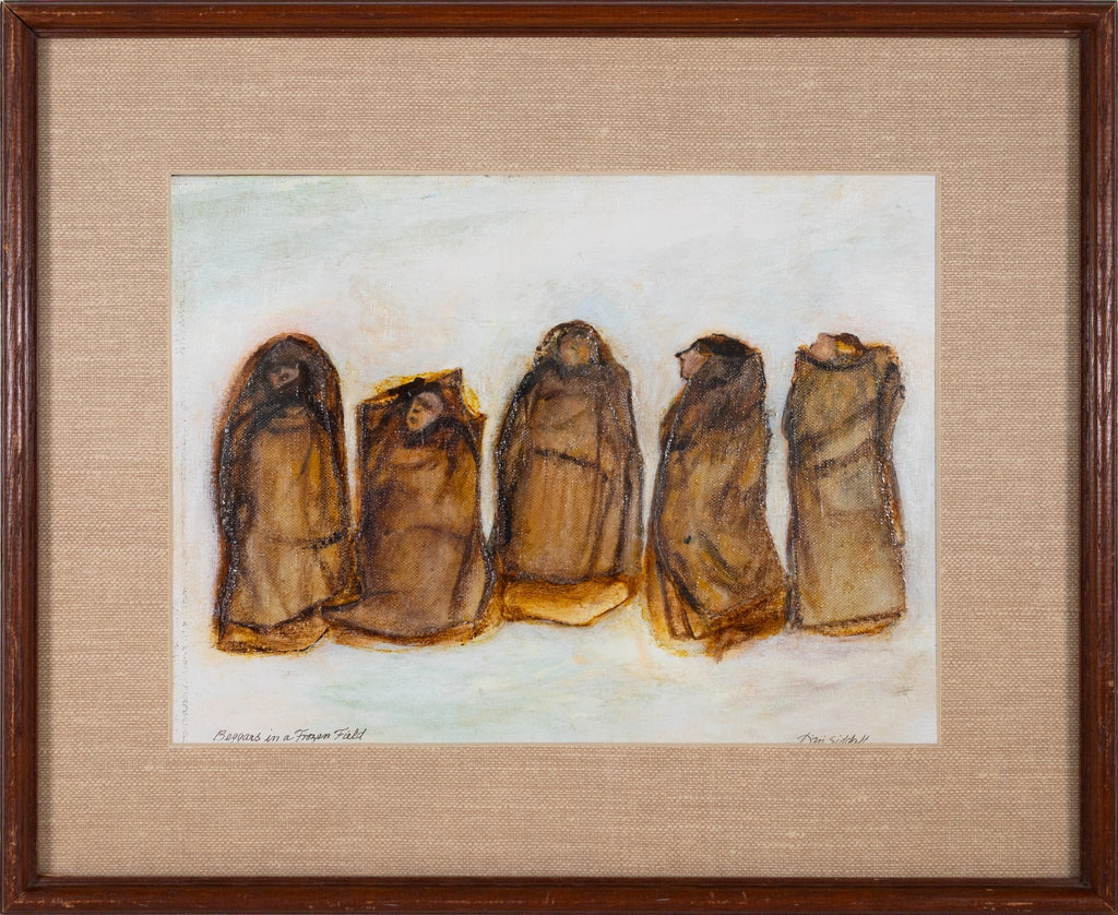 A poignant and expressive modernist figurative painting on paper by Dorothy Siddall, "Beggars in a Frozen Field" captures a solemn lineup of cloaked figures rendered in warm earth tones against a stark, icy backdrop. Created circa 1960s, the work exemplifies Siddall's signature emotional depth and painterly restraint, using simplified forms and subtle textures to evoke human vulnerability and collective endurance. Signed by the artist in the lower right and titled in pencil along the lower left, this work blends elements of social realism and abstraction. It stands as a powerful example of mid-century narrative modernism.