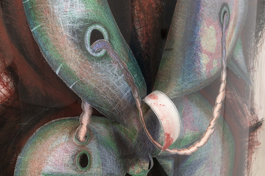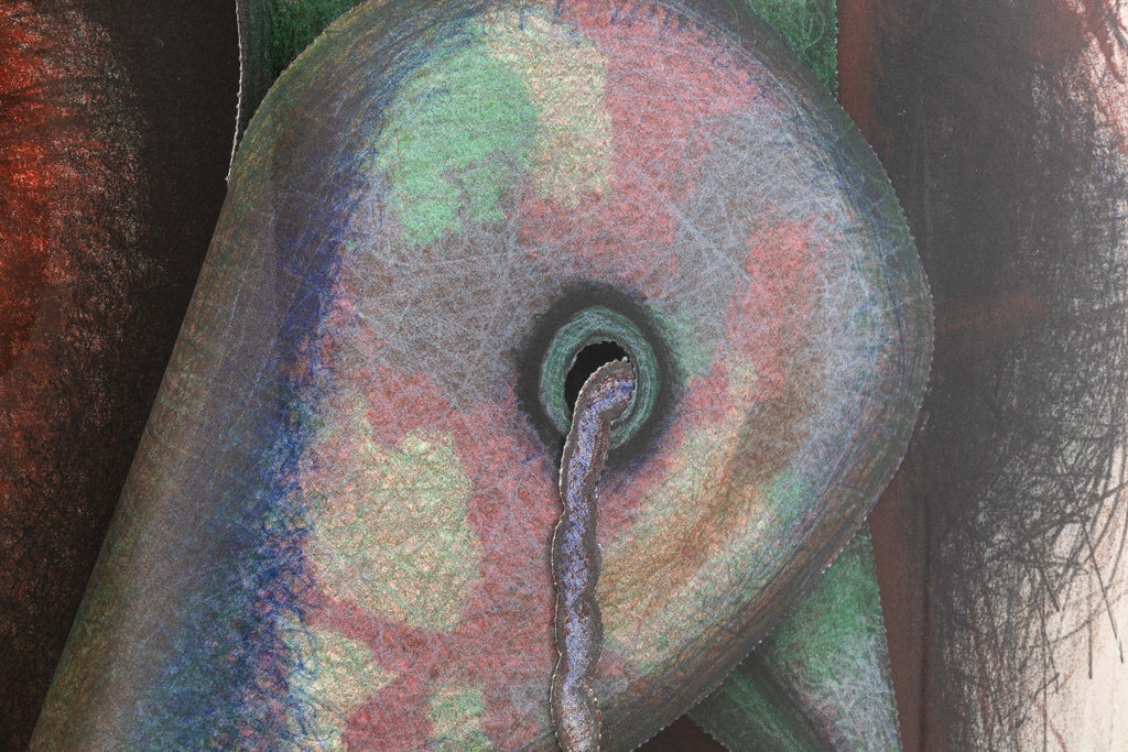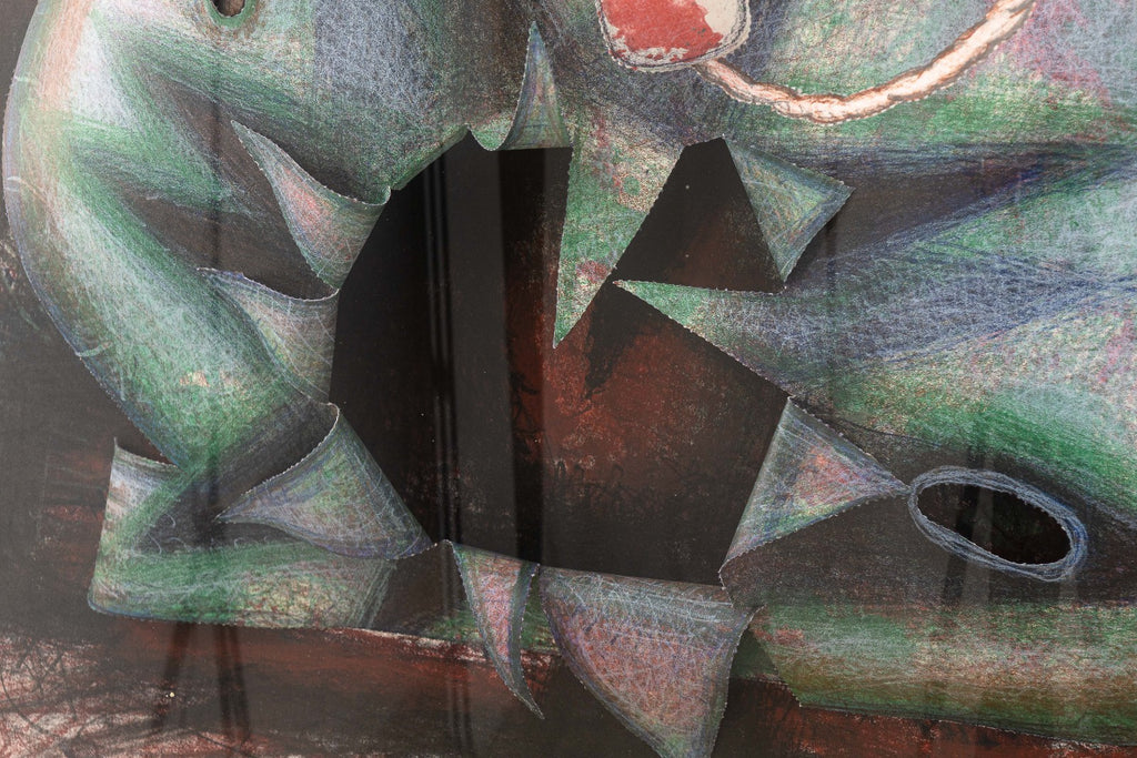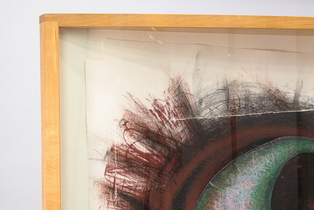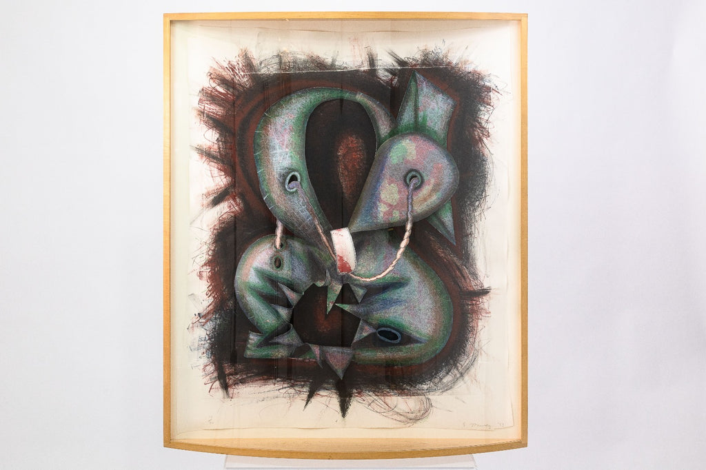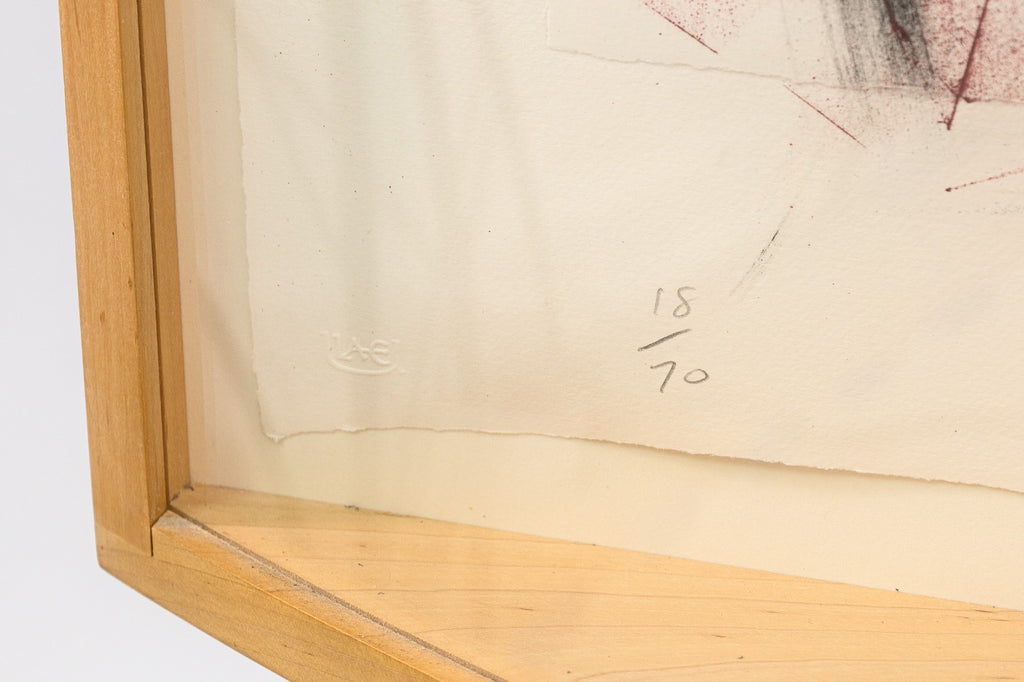 A lithograph on cut and raised paper titled “Shoe String” by Elizabeth Murray. Hand signed in pencil on the lower right with an annotation of 18/70 on the lower left. Published and printed by Universal Limited Art Editions (ULAE), West Islip, New York, 1993. This work exemplifies Murray’s exploration of shaped formats and dimensional surface. The composition features biomorphic, interlocking forms rendered in layered color with energetic, gestural marks surrounding the central imagery. Murray’s prints from this period reflect her continued investigation of fragmentation, abstraction, and object-based imagery, making this work representative of her mature graphic practice.Provenance: From the personal collection of Stephen Kasle, son of Detroit art dealer Gertrude Kasle, founder of the Gertrude Kasle Gallery, which played a significant role in the development of Detroit’s modern and avant-garde art scene during the 1960s and 1970s.Dimensions: 43.75”h x 36.5”w x 6.5”d (framed). Very good overall condition. Full condition report available upon request.Elizabeth Murray (1940–2007) was a leading figure in postwar American painting, known for expanding the language of abstraction through shaped canvases and dynamic, cartoon-inflected forms. She received a BFA from the School of the Art Institute of Chicago and an MFA from Mills College. Murray represented the United States at the 41st Venice Biennale in 1984 and was the subject of a major mid-career retrospective organized by The Museum of Modern Art, New York, in 2006—the first retrospective at MoMA dedicated to a living female artist. She was awarded a MacArthur Foundation Fellowship in 1999 and was elected to the American Academy of Arts and Letters. Her work is held in major museum collections worldwide, including The Museum of Modern Art, the Whitney Museum of American Art, and the Art Institute of Chicago.