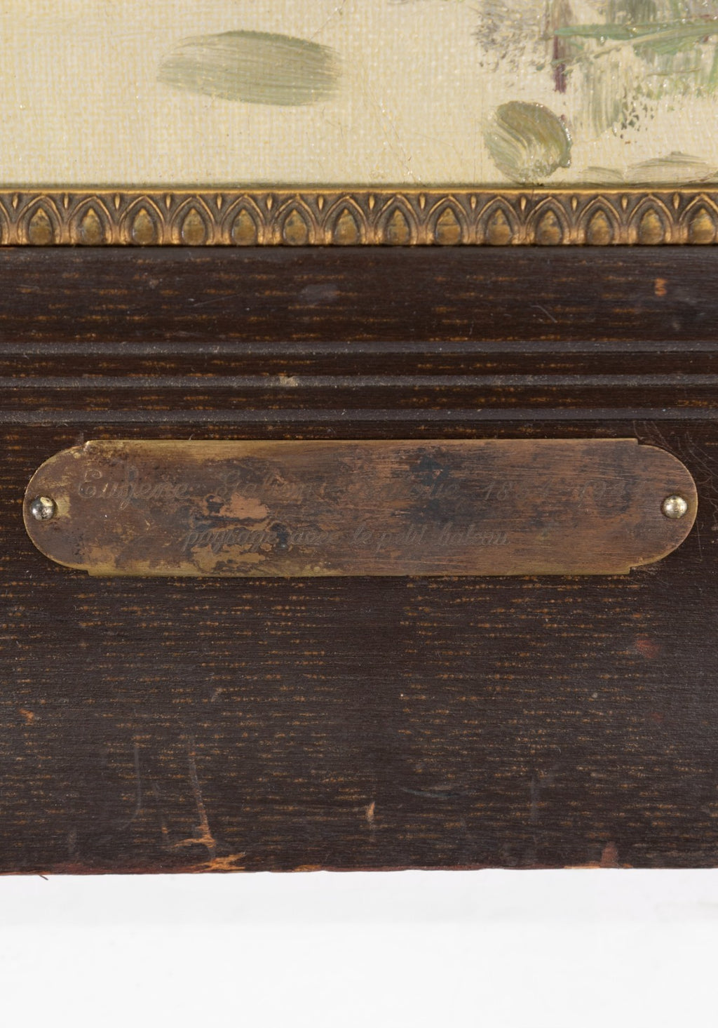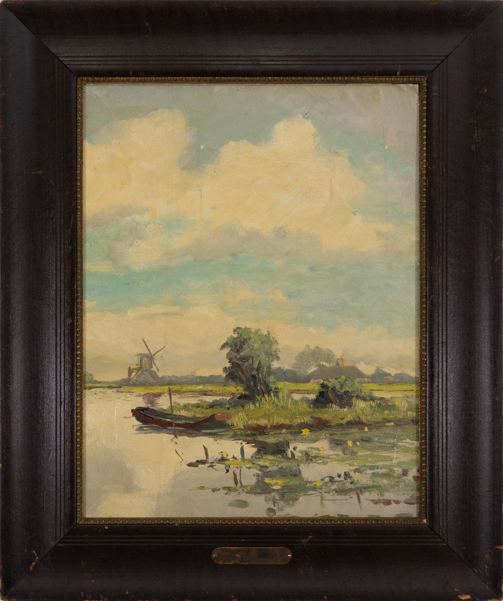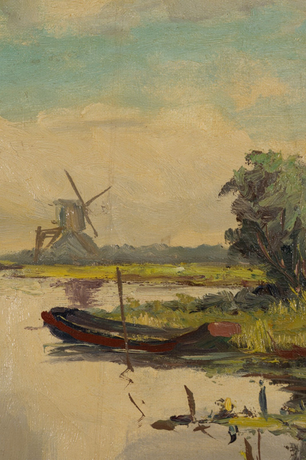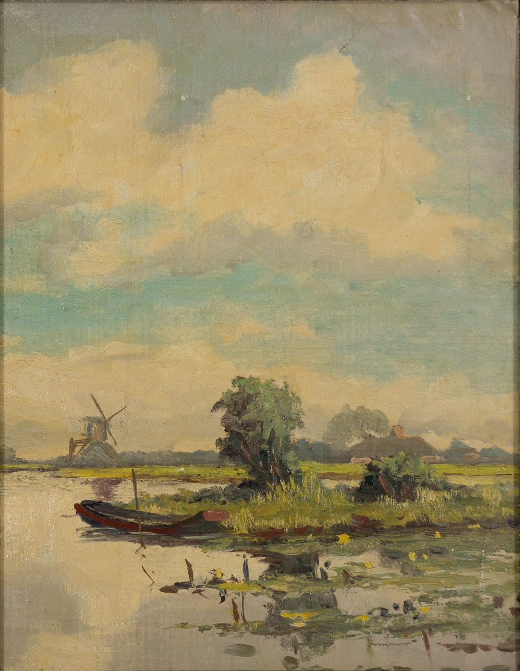 An Impressionist oil on panel titled "Paysage avec le Petit Bateau (Landscape with the Little Boat)" attributed to Eugene Galien-Laloue. The composition captures a tranquil rural scene rendered with delicate brushwork and luminous color. A small rowboat drifts gently on a sunlit canal surrounded by lush greenery, while a windmill and scattered trees populate the peaceful countryside beyond. Painted in Galien-Laloue's signature plein air style, the work reflects his mastery of light, atmosphere, and naturalistic detail. The painting exemplifies the artist's enduring appeal and the timeless beauty of French pastoral landscapes.