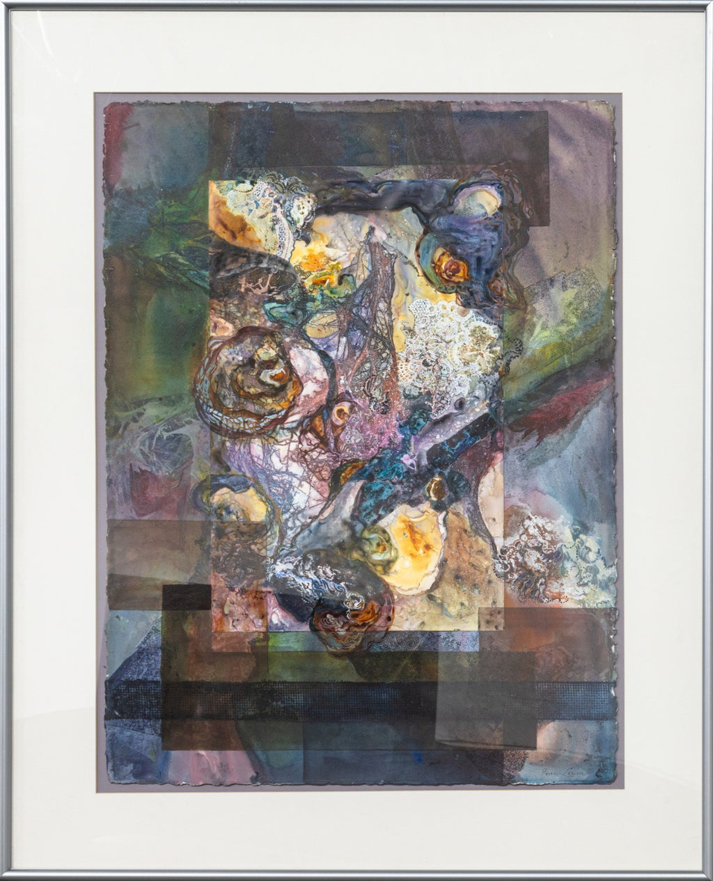 The composition unfolds in richly layered pigments and organic forms that evoke the impression of a floral bouquet rendered through abstraction. Levin’s characteristic technique—combining fluid washes, dynamic textures, and spontaneous movement—imbues the piece with a sense of depth and vitality. The interplay of jewel-toned hues and translucent overlays highlights her experimental approach and mastery of color harmony.