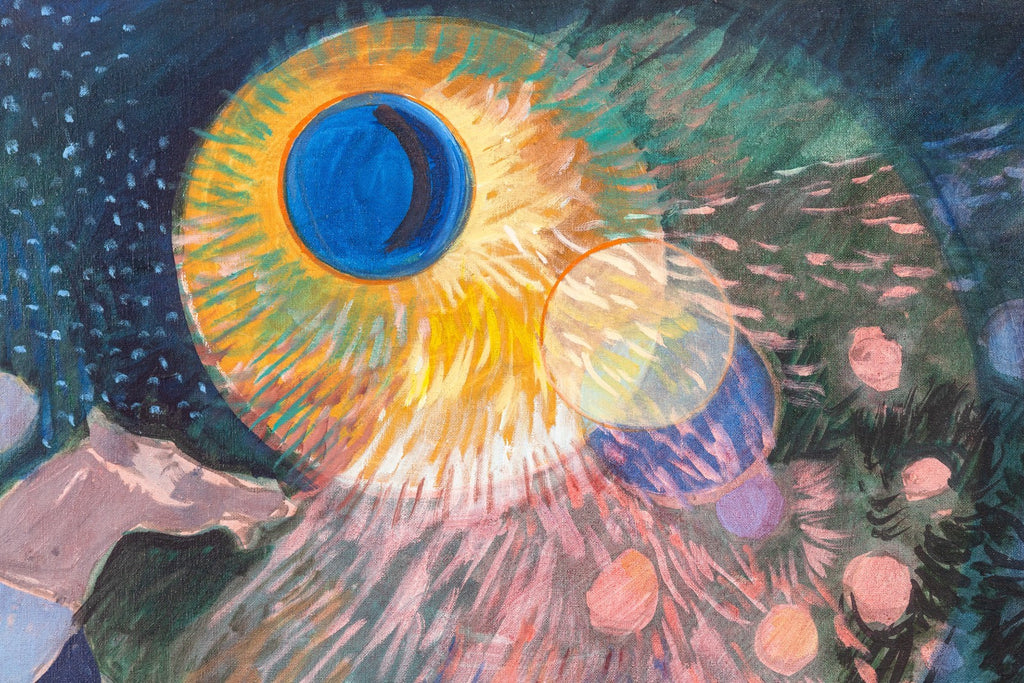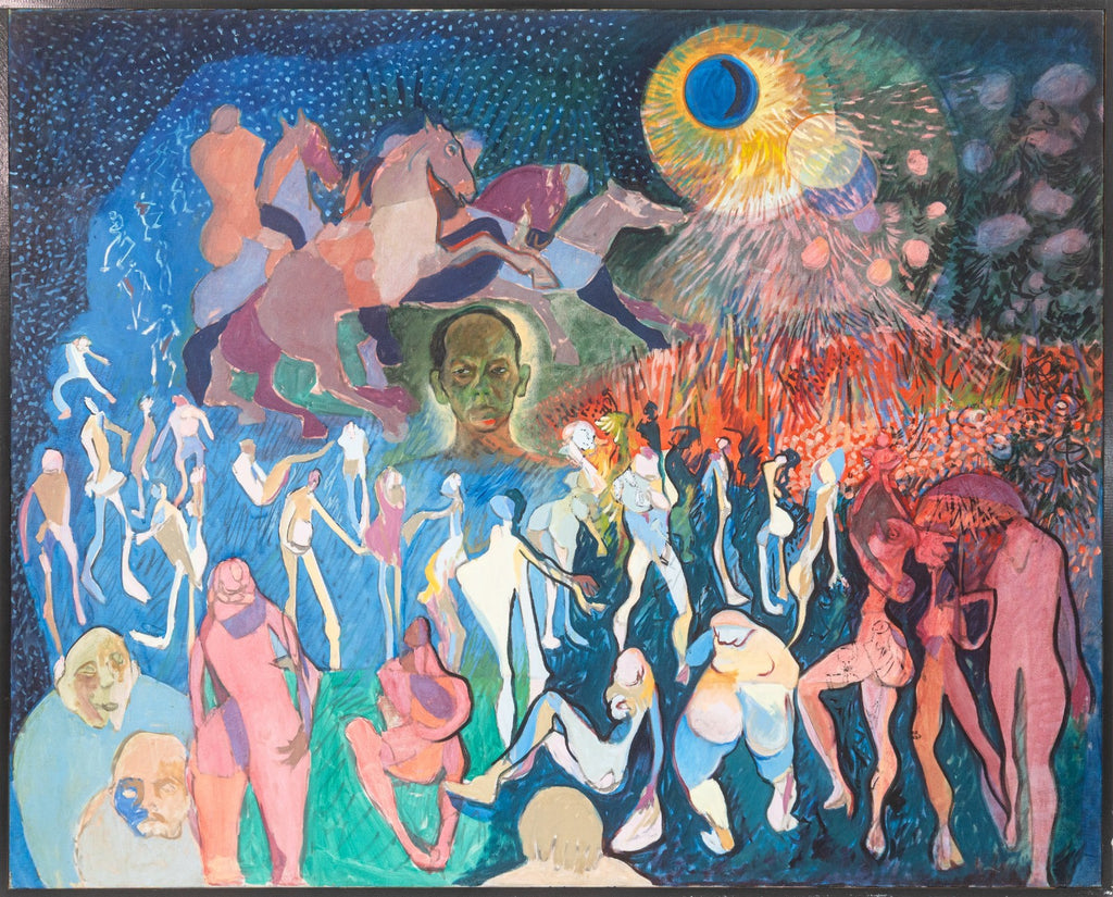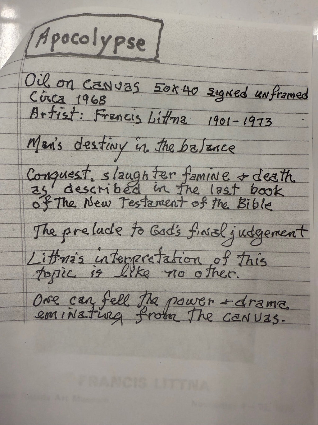 A modern oil on canvas titled "Apocalypse" by Michigan artist Francis Littna. Signed, titled, and dated on verso. The painting delivers a vivid and deeply personal vision of the cataclysmic events described in the Book of Revelation. The work portrays man's destiny hanging in the balance, with the Four Horsemen - symbols of conquest, slaughter, famine, and death - charging through the scene beneath an ominous, eclipsed sun. Figures in varying states of anguish and transcendence populate the foreground, their elongated, contorted forms rendered in dynamic, jewel-like colors. Explosions of light, fire, and cosmic energy heighten the drama, evoking the prelude to God's final judgement. This monumental oil captures Littna?s singular approach to religious surrealism, merging modernist abstraction with intense narrative imagery to convey an overwhelming sense of power, mystery, and awe.