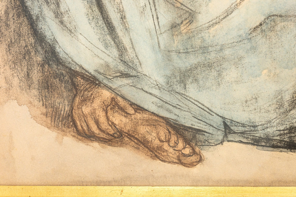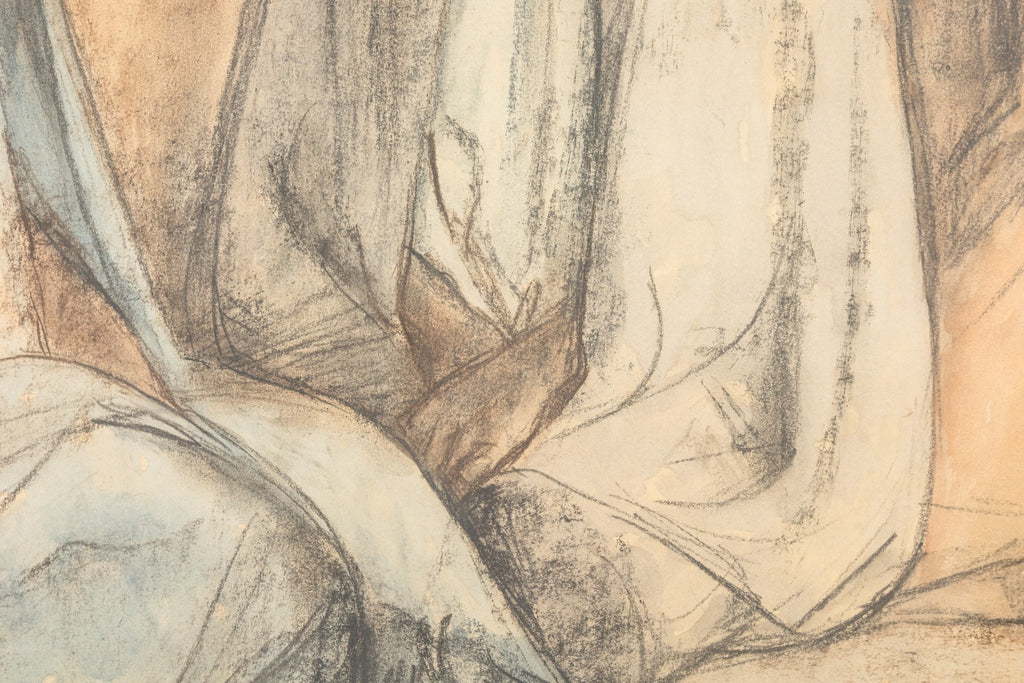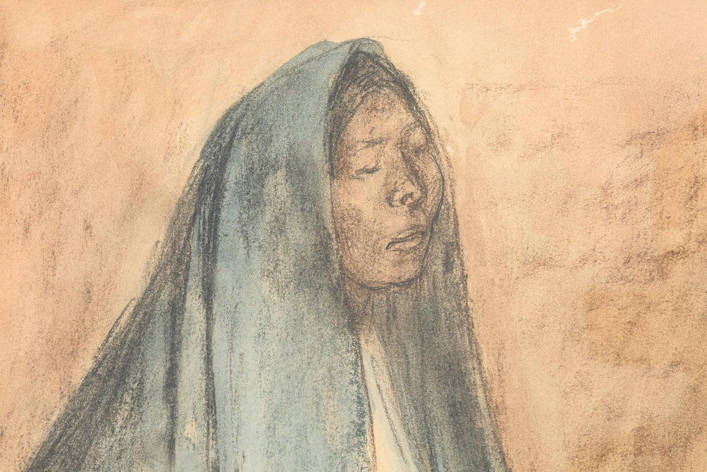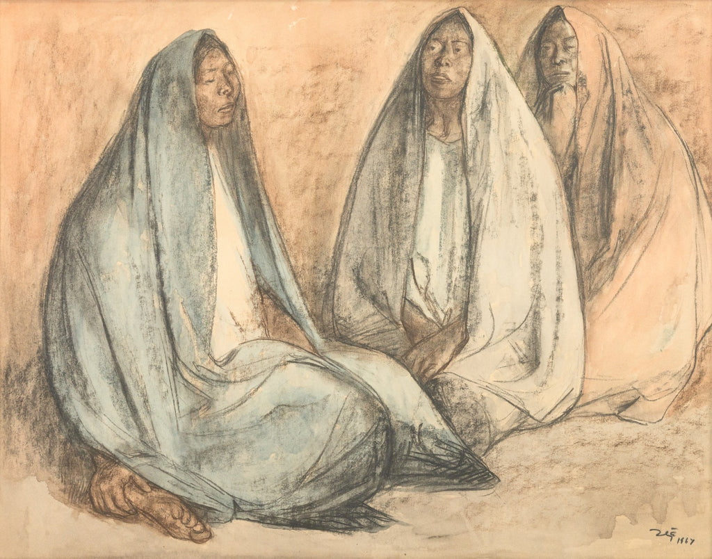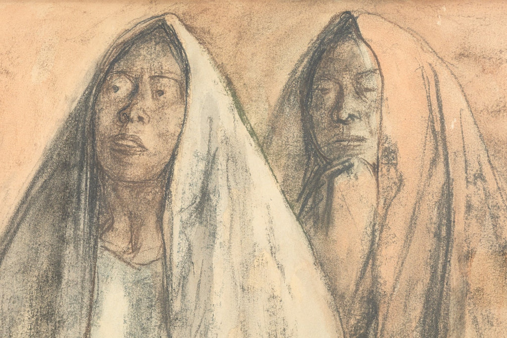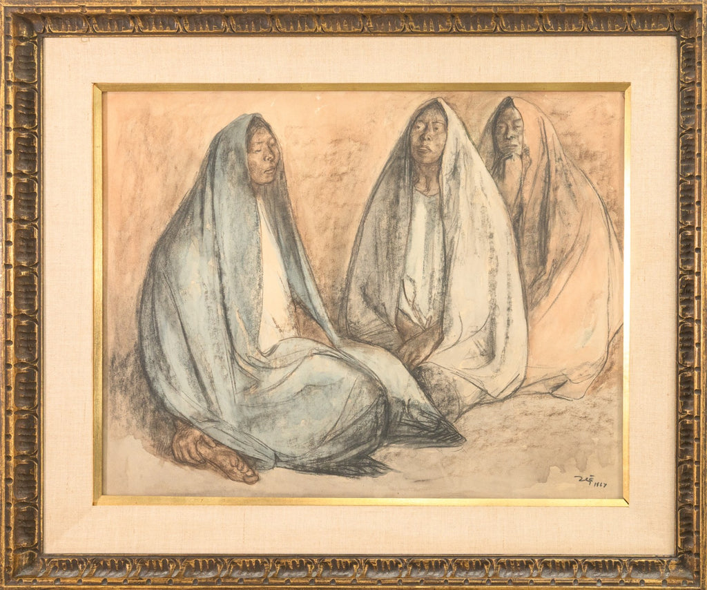 This evocative pastel drawing by renowned Mexican-Costa Rican artist Francisco Zuniga features three seated women, cloaked in flowing shawls, rendered in soft earth tones and pale blues. Circa 1970s. With expressive contours and grounded dignity, Zuniga captures the quiet strength and timeless presence of Indigenous women - a recurring subject in his celebrated body of work. Signed and framed, this intimate composition reflects the artist's deep humanism and mastery of form through a blend of modernist sensibility and classical drawing. From a private collection. Dimensions: 27.75"h x 33.5"w x 2"d (framed). In very good condition. Full condition reports available upon request.