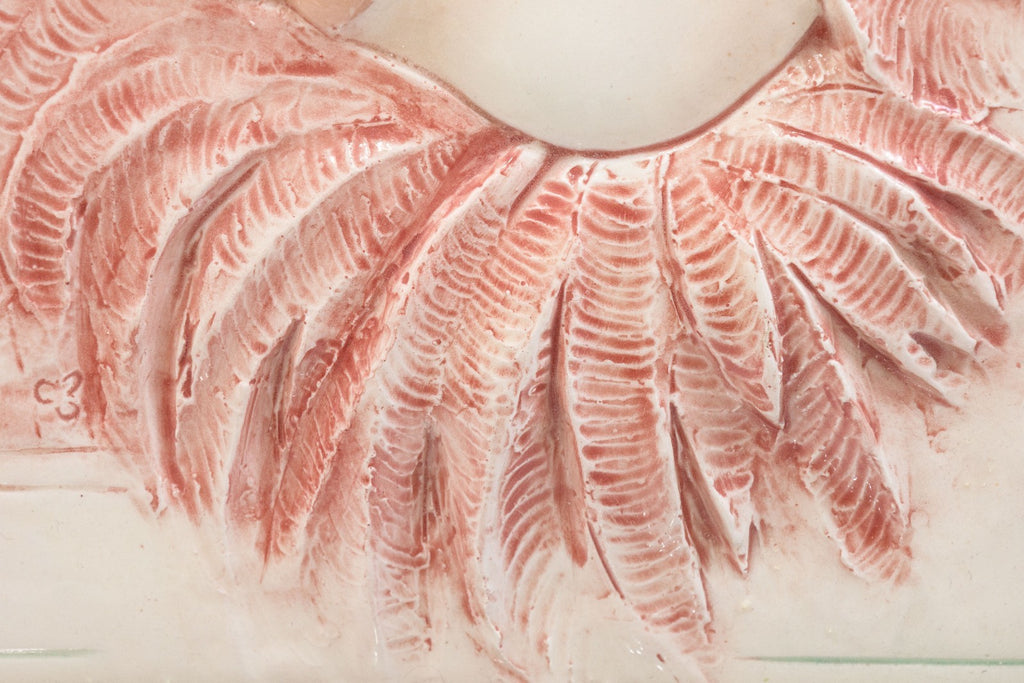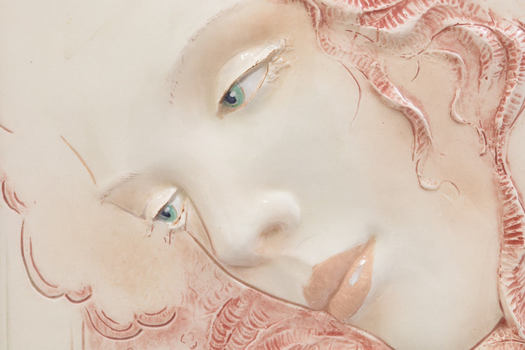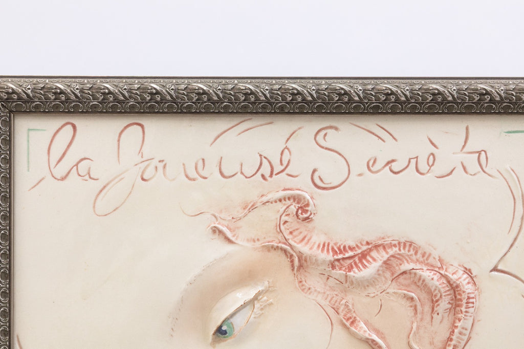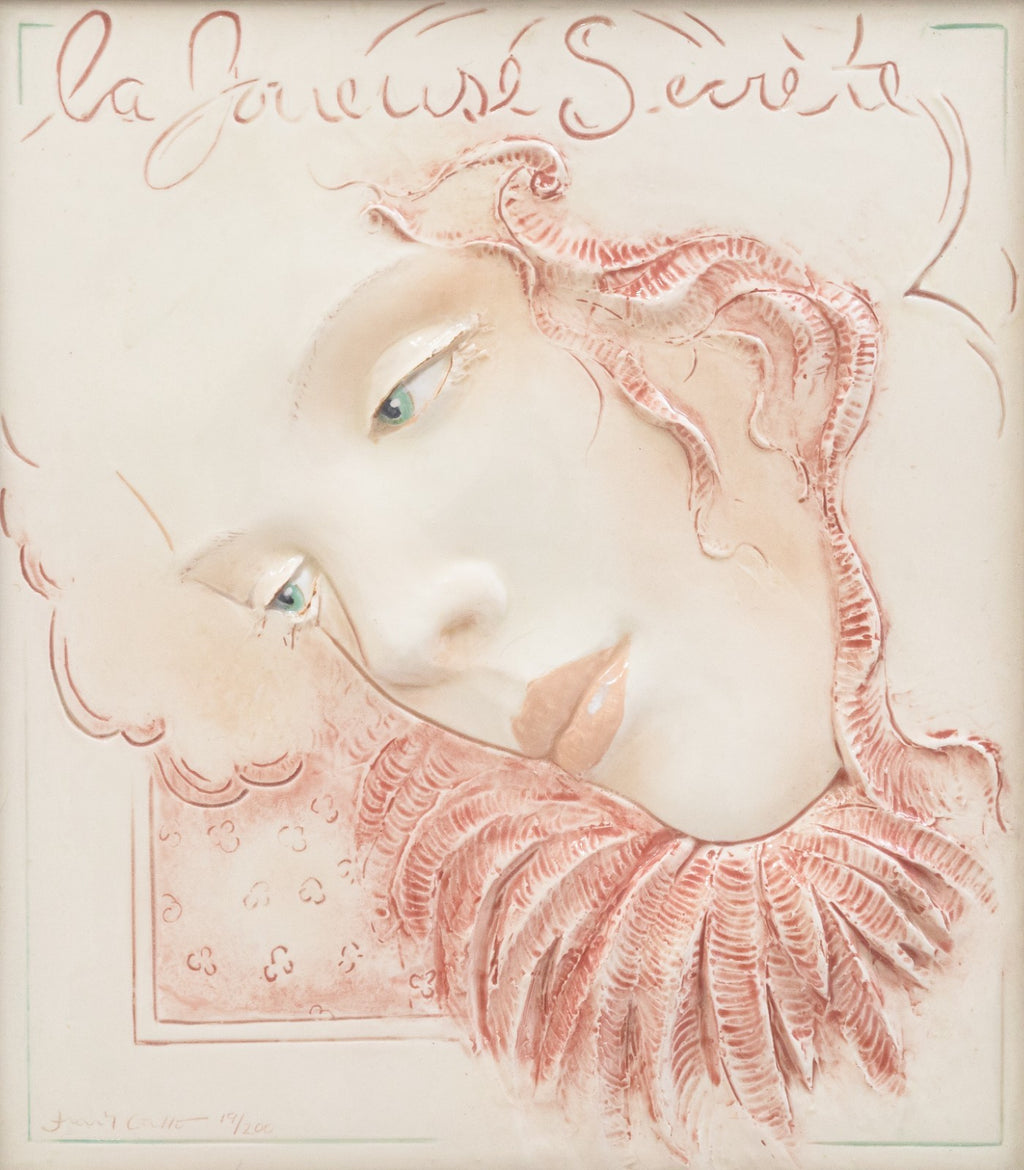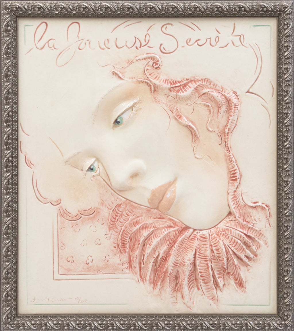 A figurative ceramic tile titled "La Jousese Secret" by Frank Gallo. Circa 1980s. Signed on the lower left with an annotation of 19/200. The composition features a softly modeled female visage rendered in low relief, with delicate facial features and a contemplative expression emerging from a textured, flowing collar-like motif. Subtle blush and earth-toned glazes enhance the sense of depth and intimacy, while hand-drawn accents and the title inscribed above lend a poetic, narrative quality. This work reflects Gallo’s mastery of ceramic as both a pictorial and sculptural medium. Dimensions: 28.25"h x 16.25"w x 1"d (framed). In very good condition.