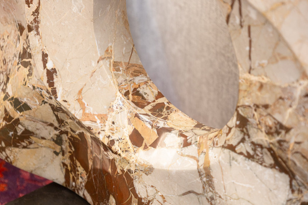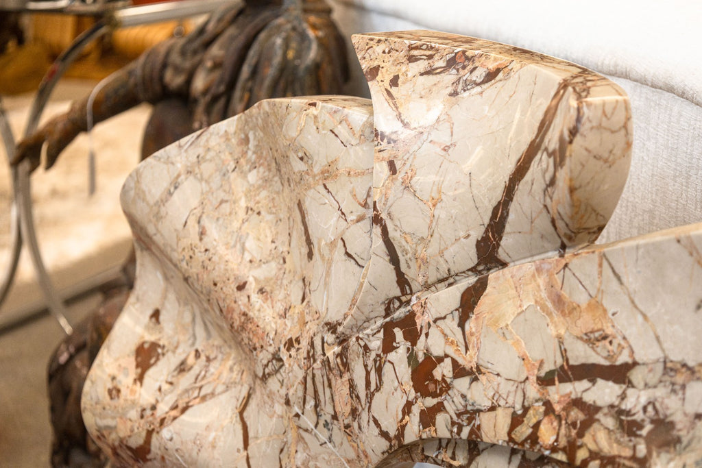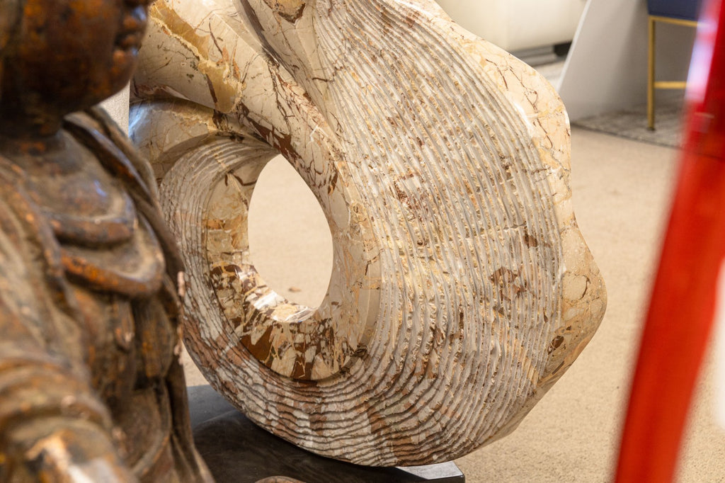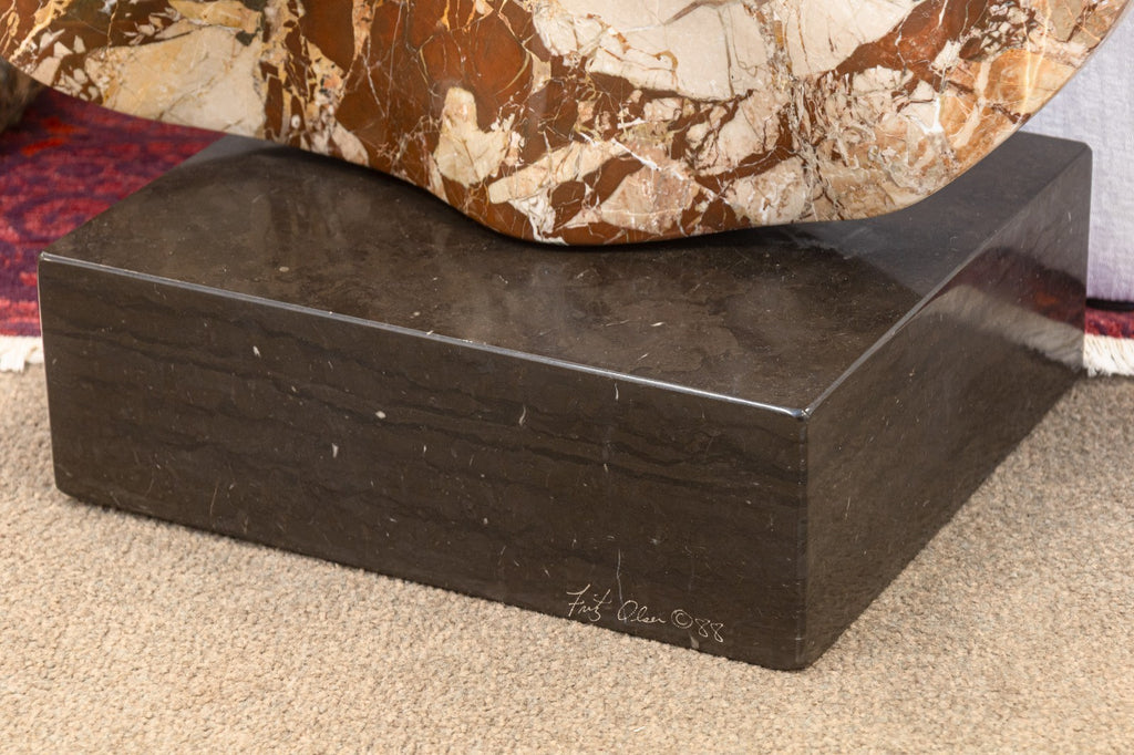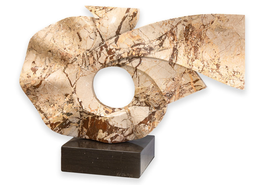 This dynamic work exemplifies Olsen’s mastery of form, featuring sinuous, interlocking curves that evoke movement and organic growth. Carved from richly veined marble in warm neutral tones of beige, cream, and brown, the sculpture balances solidity with a sense of motion and openness, anchored by a circular void at its center. Resting on a contrasting dark marble base, the piece captures Olsen’s refined approach to contemporary abstraction and his deep connection to natural materials.
