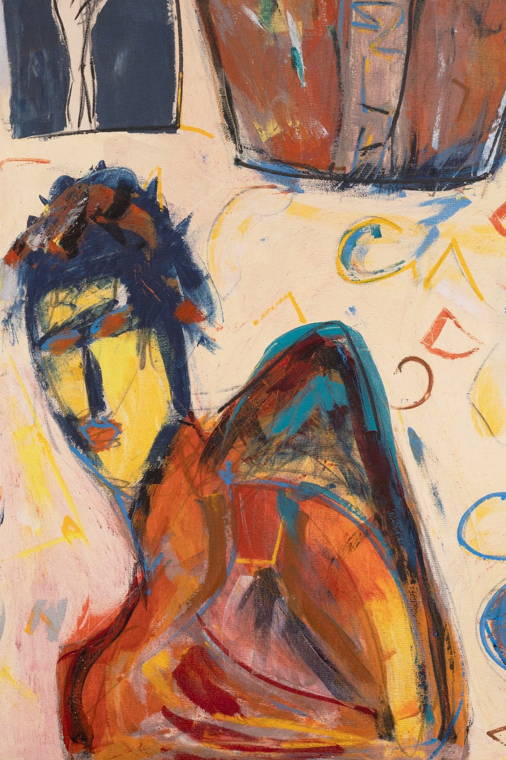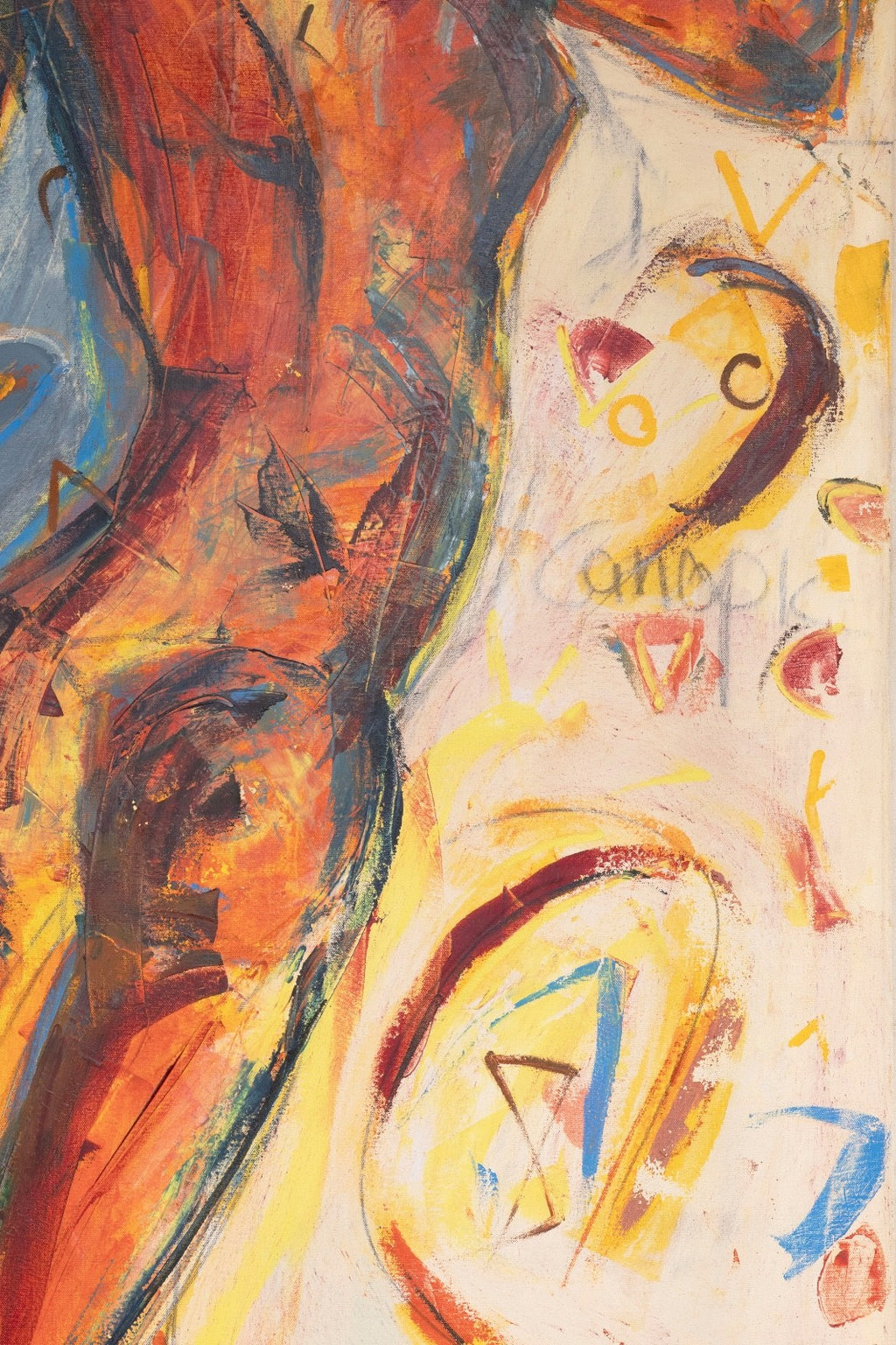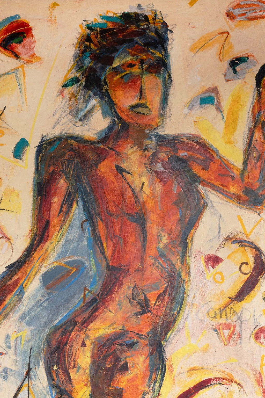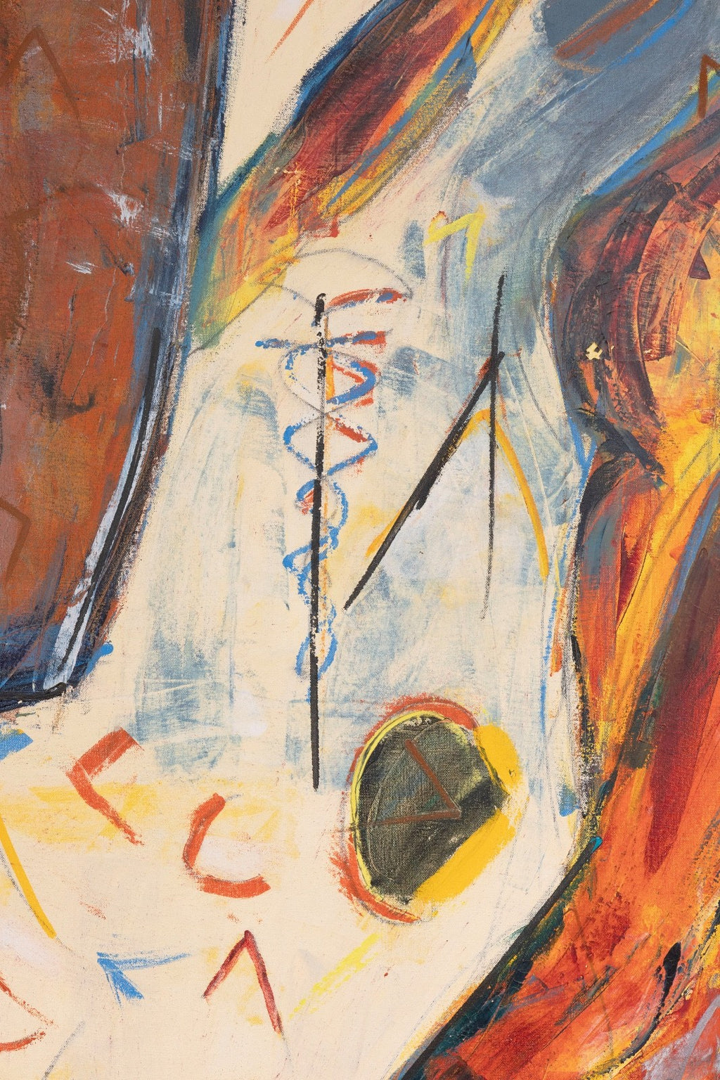 An expressive figurative abstract oil painting on canvas titled "Canopic" by Hermann Lederle. Signed, titled, and dated 1985 on the verso. The composition features fragmented human figures rendered in dynamic, painterly strokes, interwoven with graphic marks, abstract symbols, and earthy, saturated tones. A prominent canopic-inspired vessel anchors the scene, suggesting themes of ritual, memory, and the human form as both physical and symbolic presence. The work reflects Lederle’s interest in mythic references and emotional intensity, characteristic of late 20th-century figurative abstraction. A compelling and visually charged piece that captures movement, narrative, and raw expression. From a private collection. Dimensions: 84"h x 66"w x 1.25"d (stretched, unframed). In very good condition.