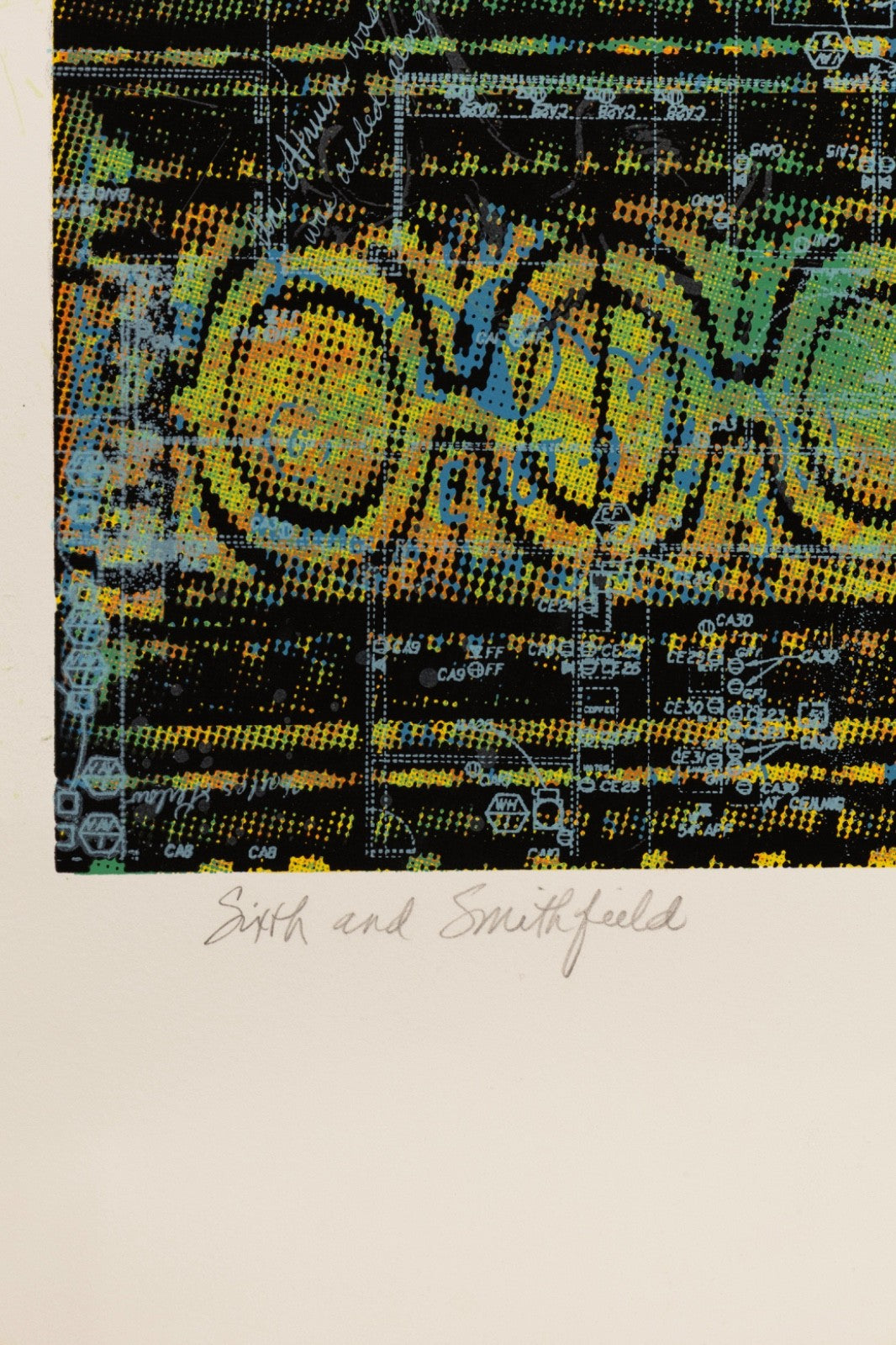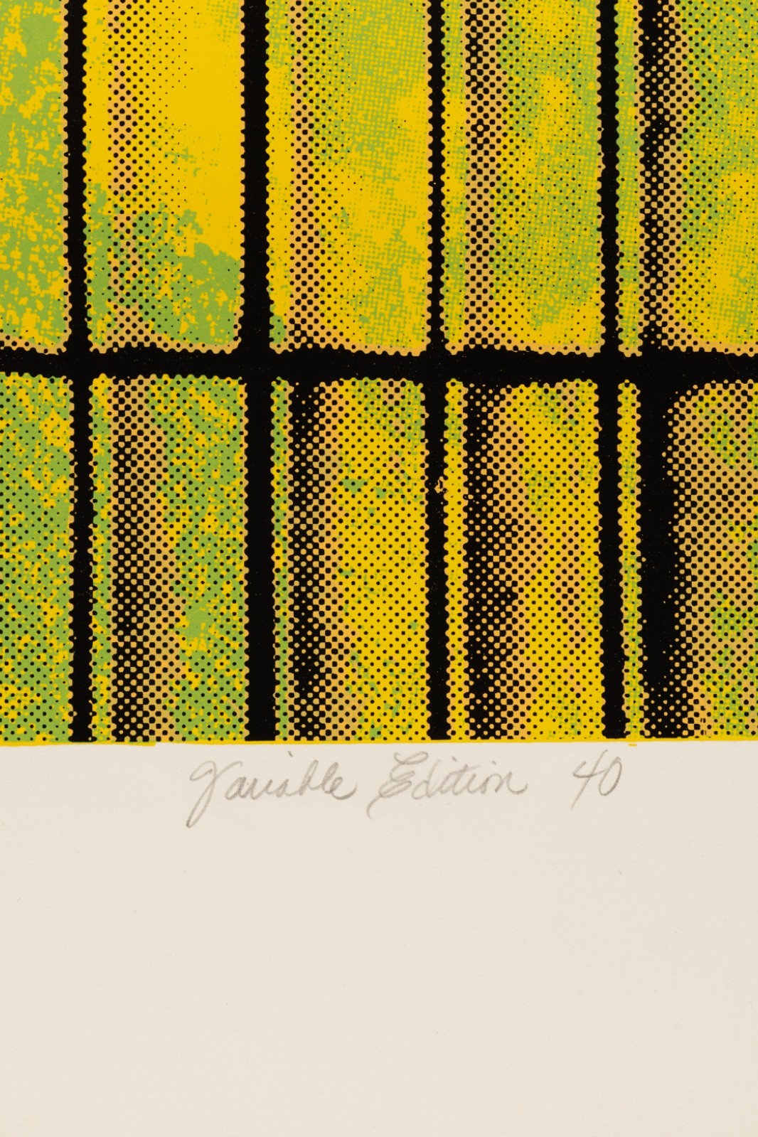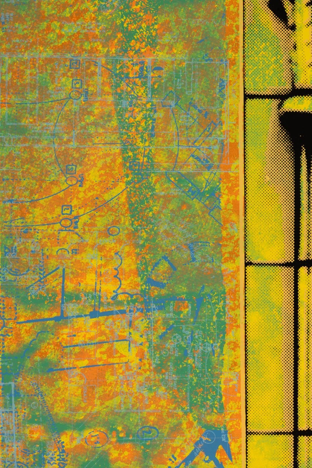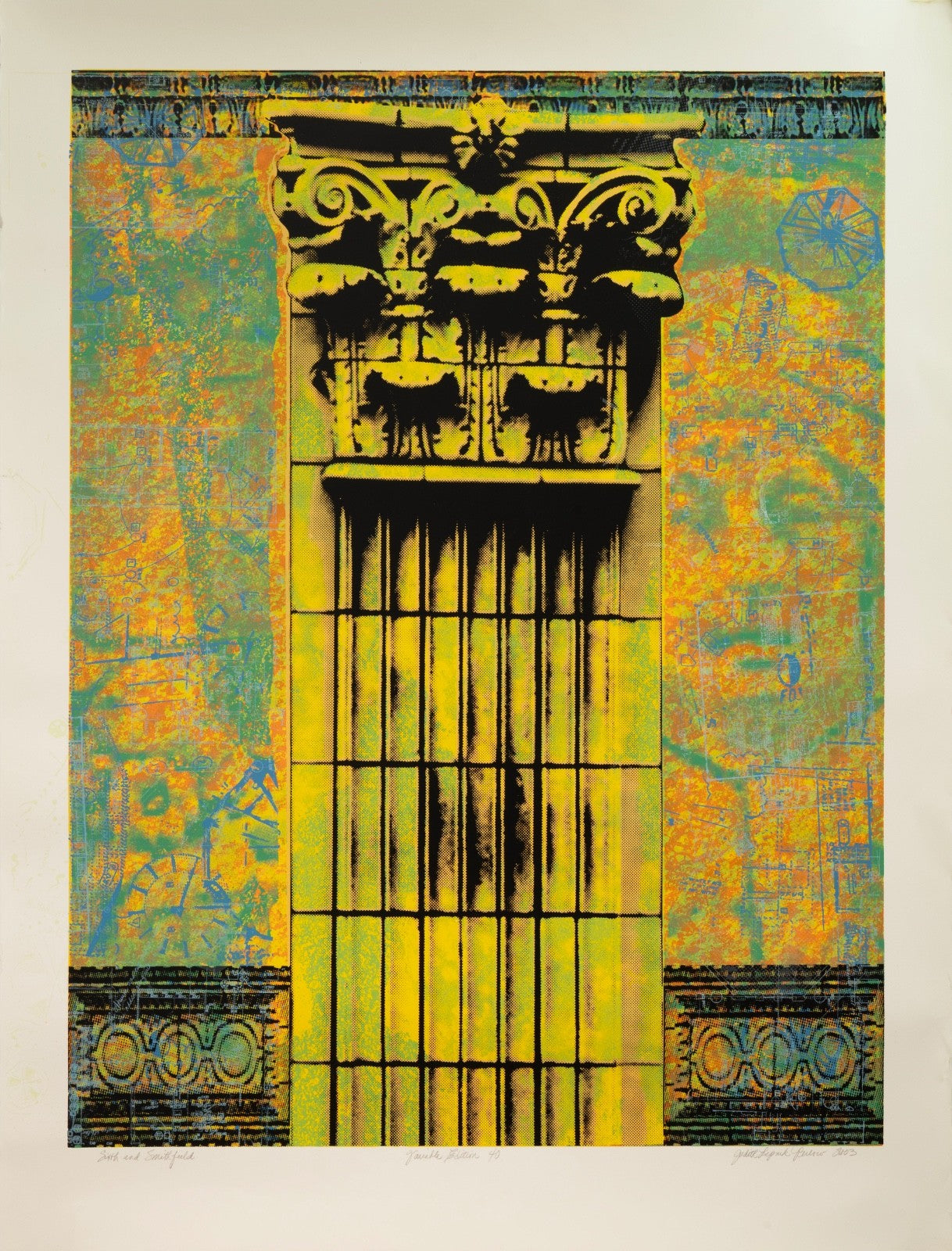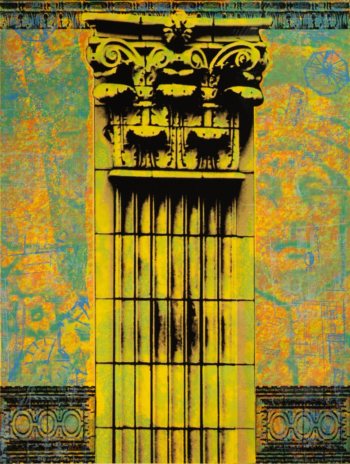 A color serigraph depicting a classical column rendered in yellow tones against a layered blue and gold ground with schematic, blueprint-like line work. The composition incorporates halftone patterning and geometric overlays, juxtaposing architectural form with contemporary graphic elements. Signed and dated in pencil lower right; annotated “Variable Edition” lower left. This work is part of Perlow’s Column Series, which examines historic architectural motifs through a modern printmaking process.