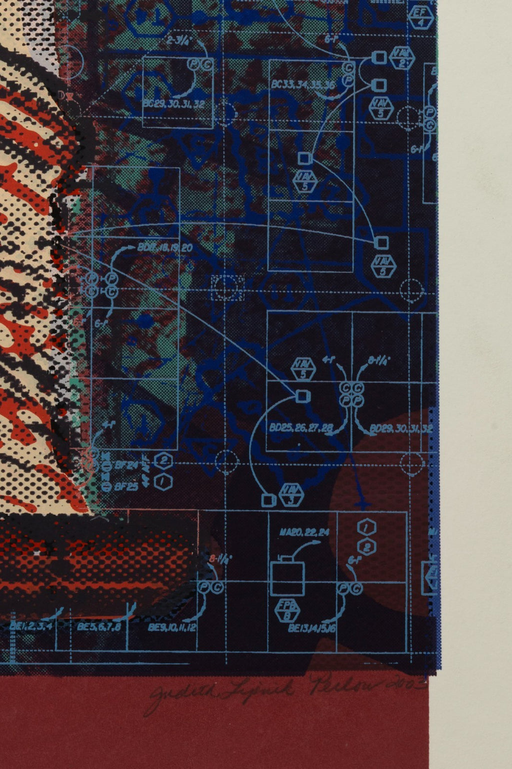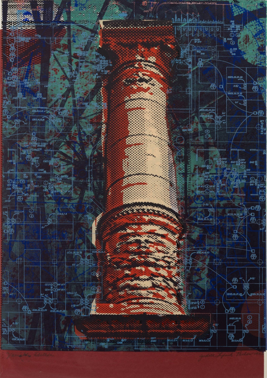 A color serigraph depicting a classical column rendered in red and cream tones against a layered blue and green ground with schematic, blueprint-like line work. The composition incorporates halftone patterning and geometric overlays, juxtaposing architectural form with contemporary graphic elements. Signed and dated in pencil lower right; annotated “Variable Edition” lower left. This work is part of Perlow’s Column Series, which examines historic architectural motifs through a modern printmaking process. Provenance: From a private collection. Dimensions: 28.5”h x 22”w (unframed). Overall very good condition. The sheet appears clean and well preserved. Full condition reports available upon request.