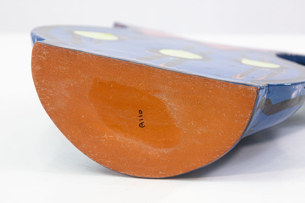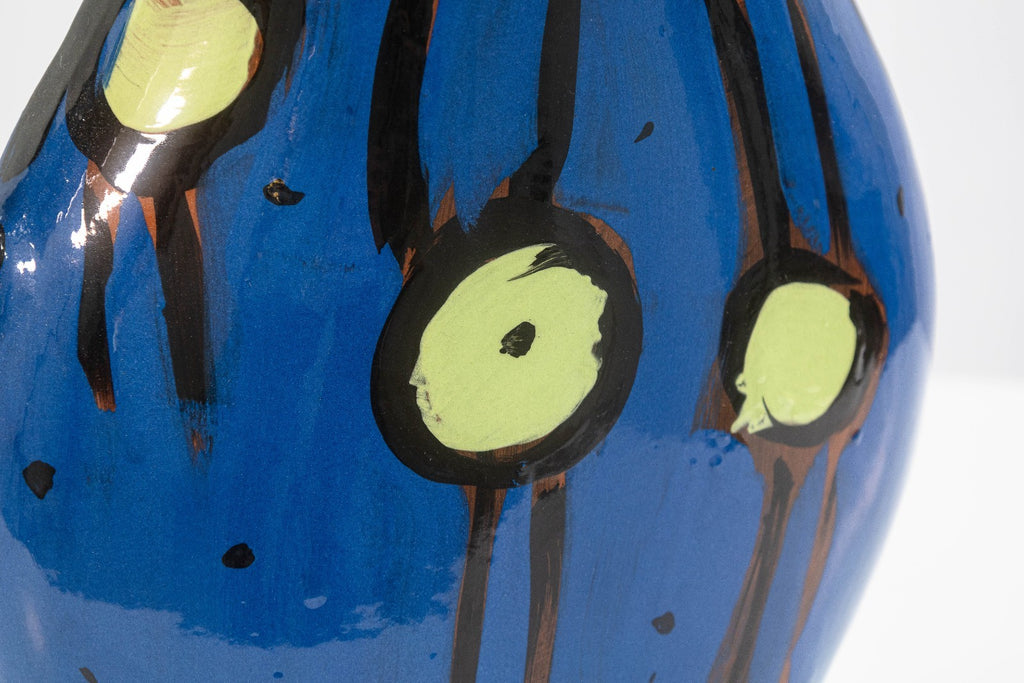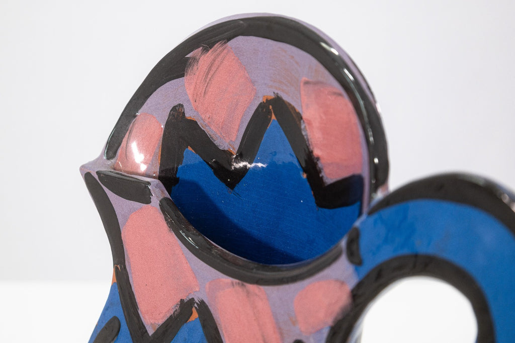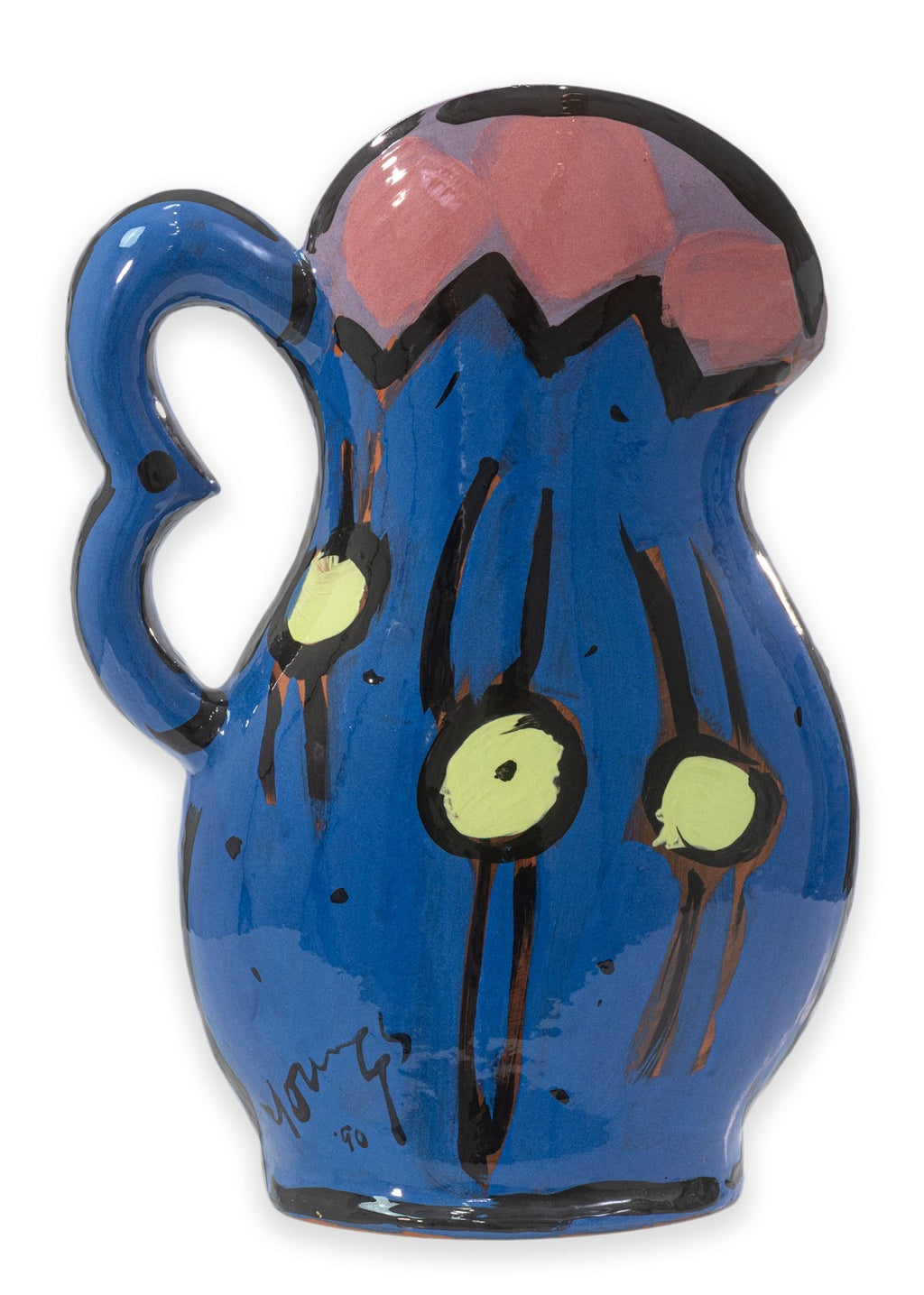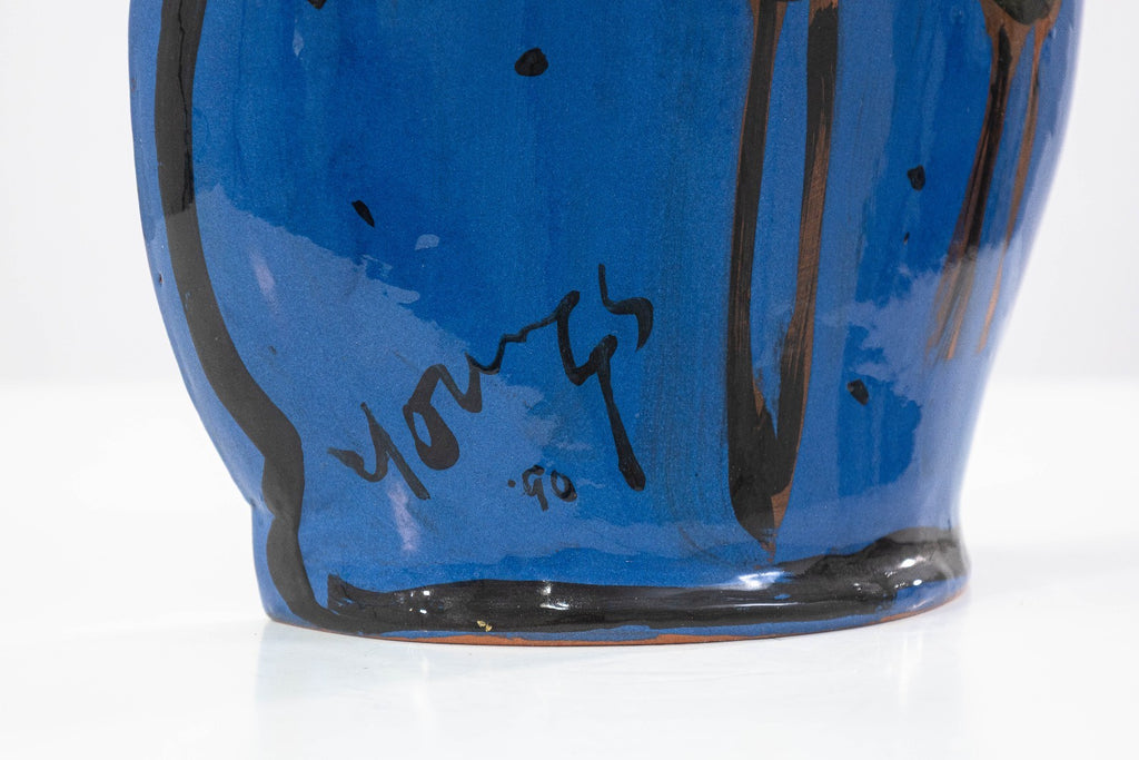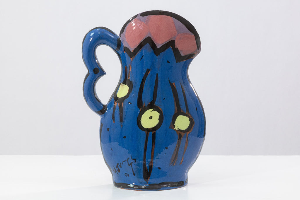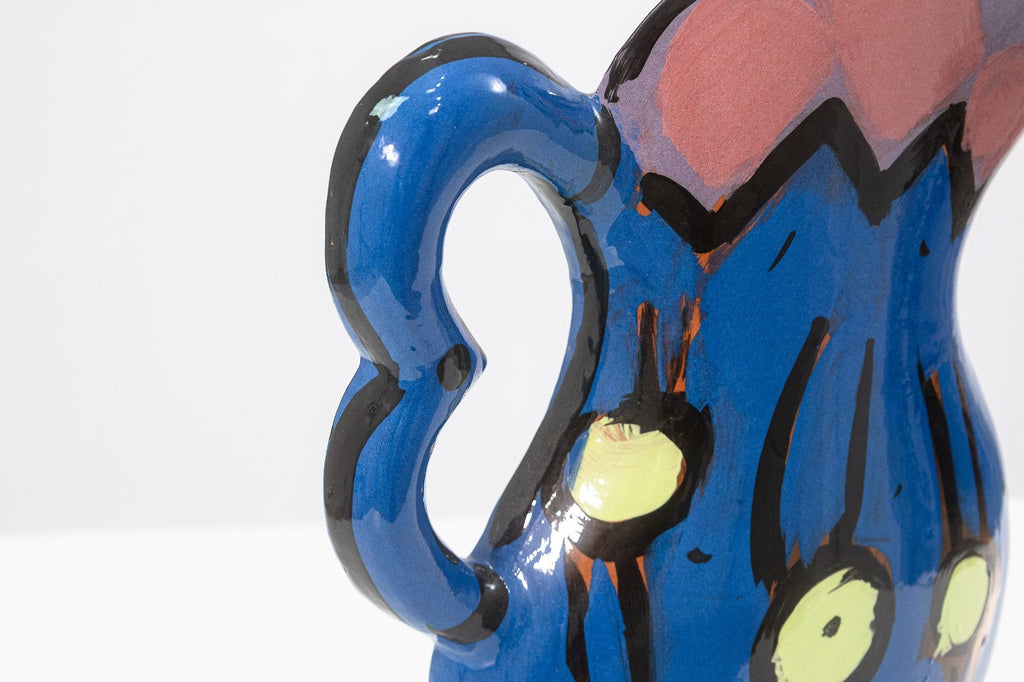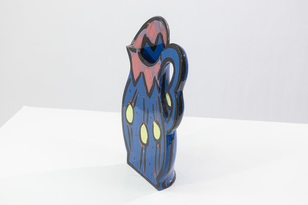 A glazed ceramic flat-form pitcher vase with applied handle and narrow profile by Kathryn Youngs. Signed and dated 1990 on the side. The surface is hand-painted in polychrome with abstract floral and gestural motifs in blue, pink, green, and black. The piece features a glossy glaze and painterly decoration consistent with postmodern studio pottery of the late 20th century. Provenance: From a private collection. Dimensions: 16.75”h x 12.5”w x 3.75”d. Overall very good condition. Full condition reports available upon request. Kathryn Youngs is an American ceramic artist associated with late 20th-century postmodern studio pottery. Working primarily in hand-built and wheel-thrown forms, she is known for functional vessels such as pitchers and vases finished with bold, hand-painted surfaces. Her work often features expressive brushwork, simplified floral and abstract motifs, and strong color contrasts reflective of postmodern design influences. Active during the 1980s and 1990s, Youngs’ ceramics have circulated through galleries and regional exhibitions, and her signed works are recognized within the studio pottery market for their painterly surface treatment and decorative character.