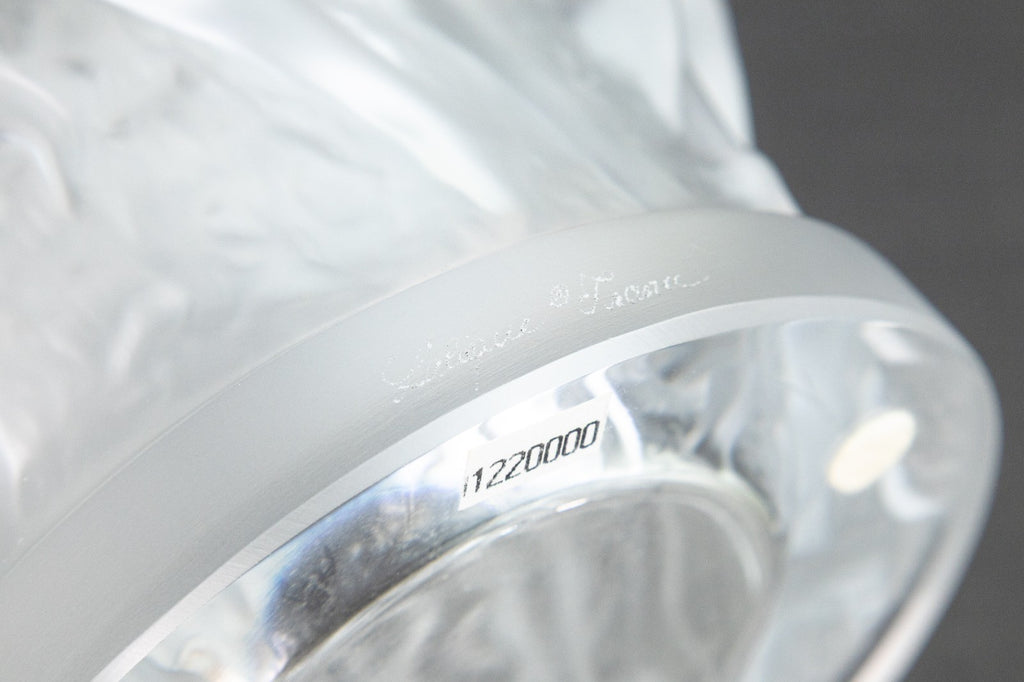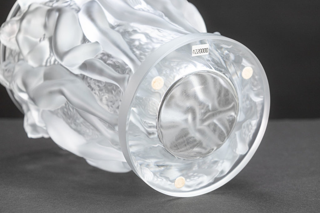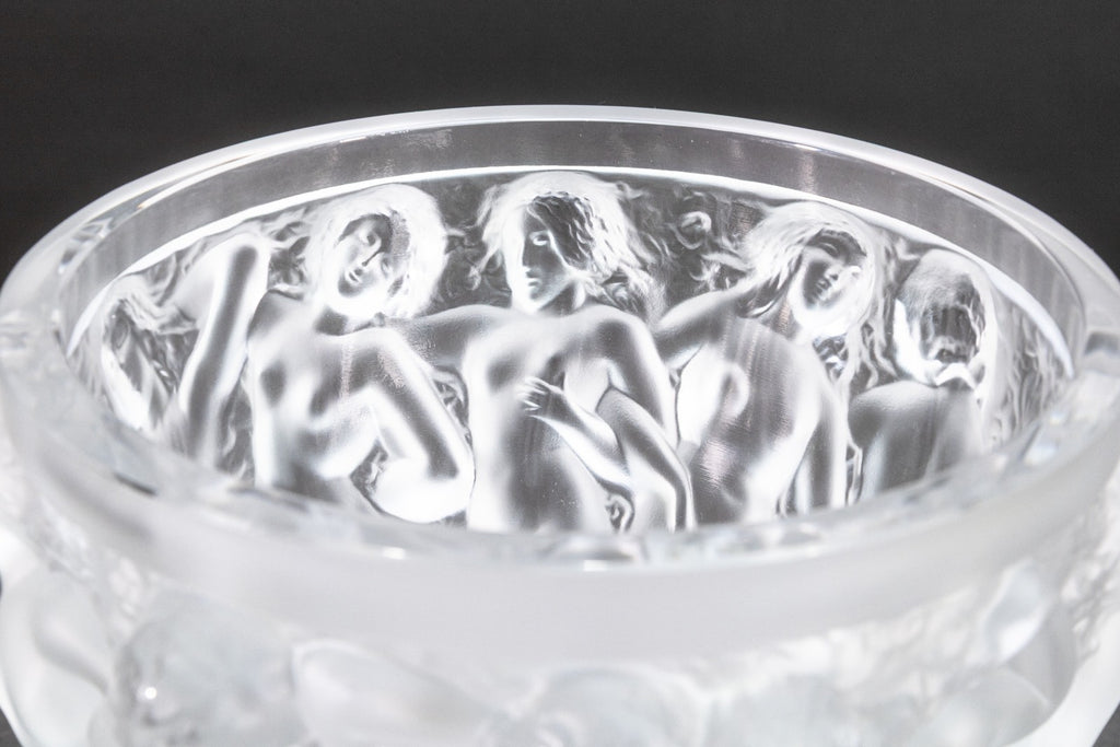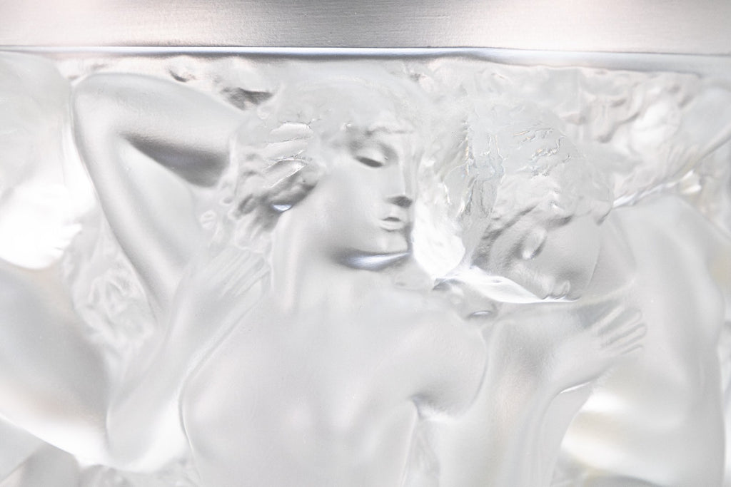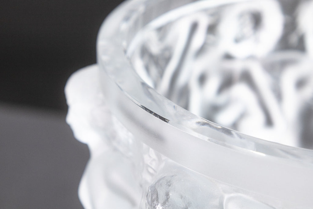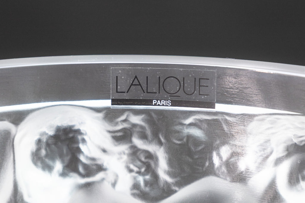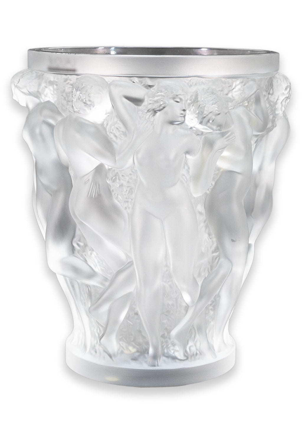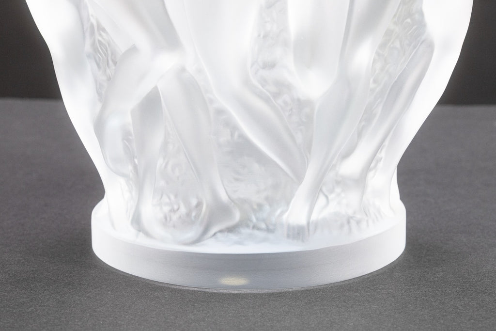One of Laliques most iconic creations, the "Bacchantes" vase was first introduced in 1927 and remains a masterpiece of Art Deco design. Signed Lalique France. Executed in richly frosted crystal, the vase features a continuous relief of nude female figures - the bacchantes of classical mythology - captured in graceful, fluid motion. The sculptural quality of the work reflects Rene Lalique's mastery in transforming glass into a medium of sensuality and timeless elegance. This exceptional example embodies the luxurious artistry and technical innovation that defined Lalique's contribution to 20th-century decorative arts. From a private collection. Dimensions: 9.5"h x 8.5"diameter x 5"diameter base. In very good vintage condition. Full condition reports are available upon request.