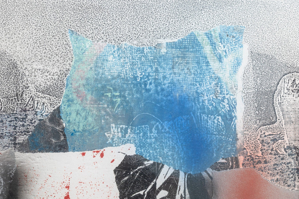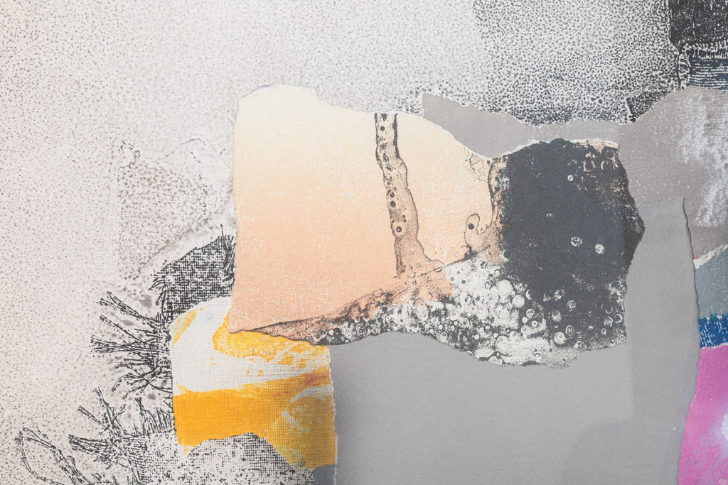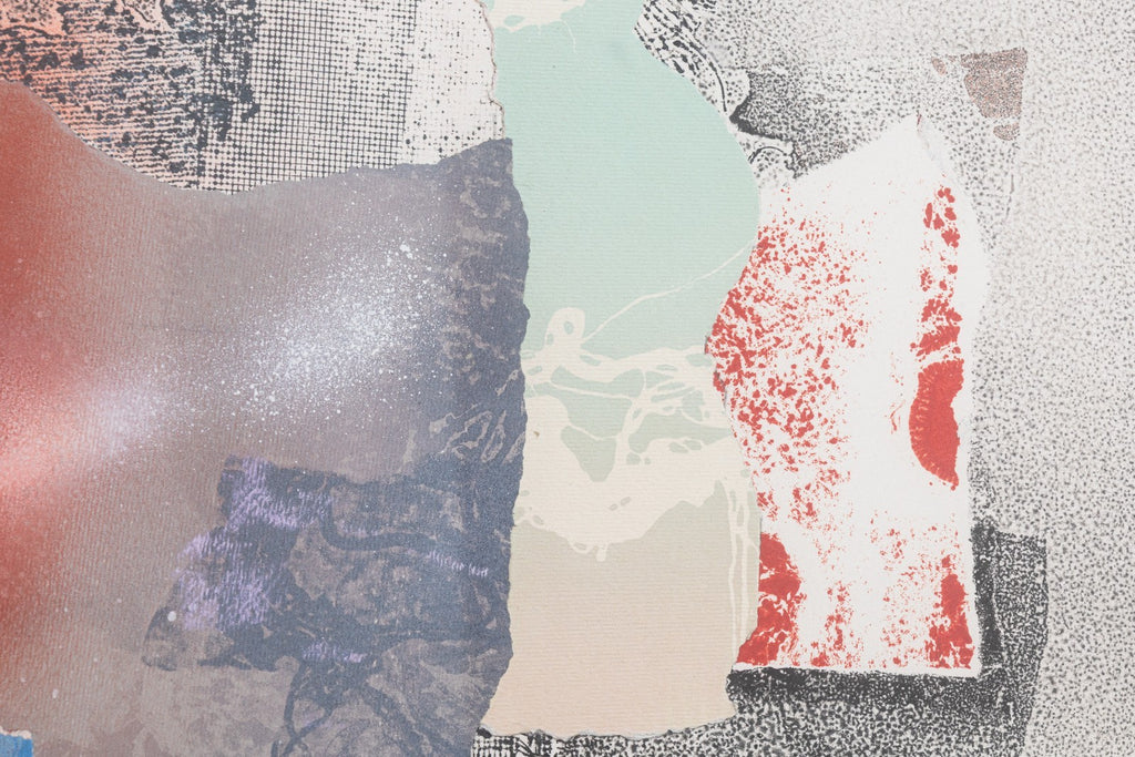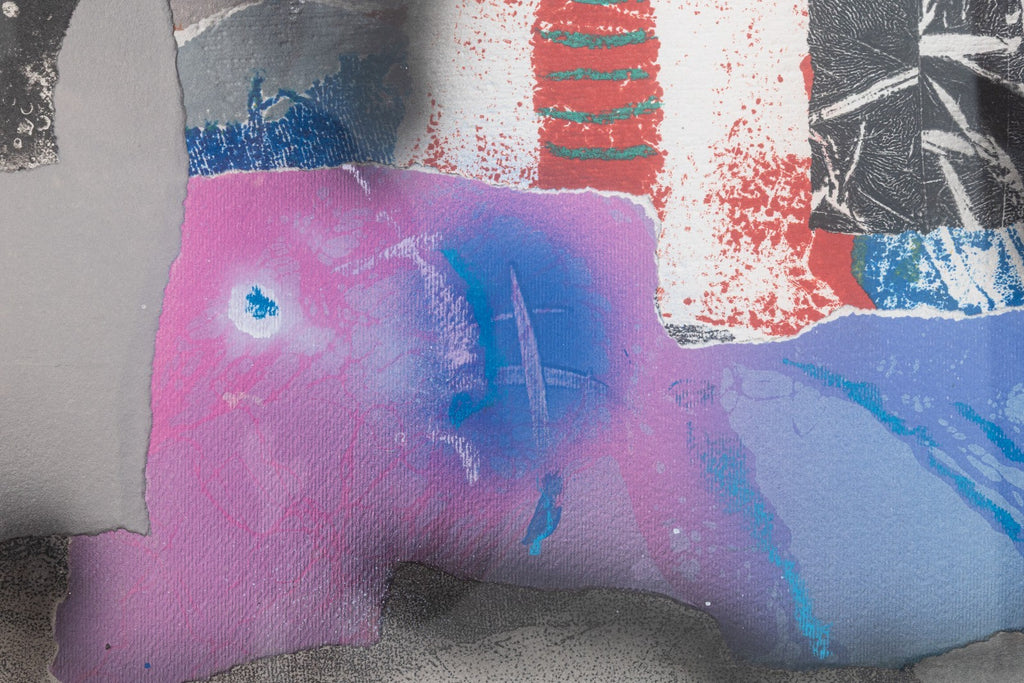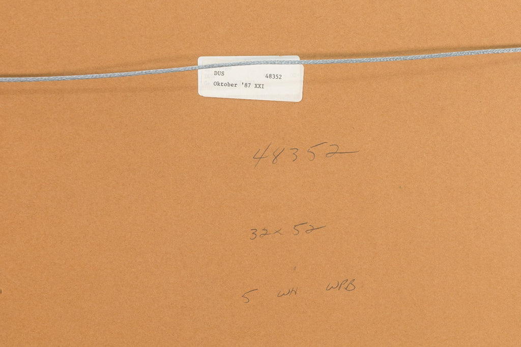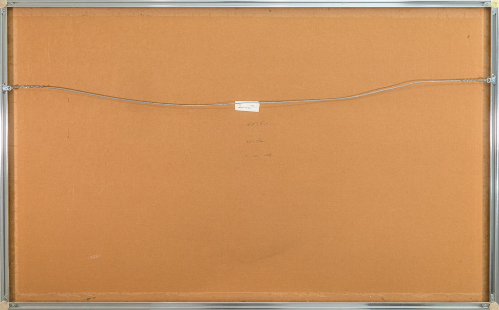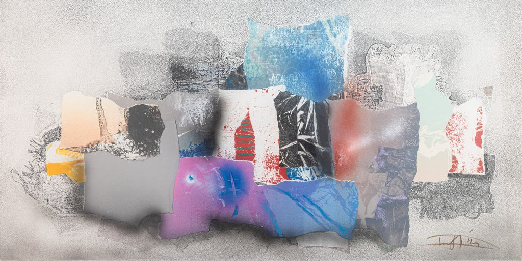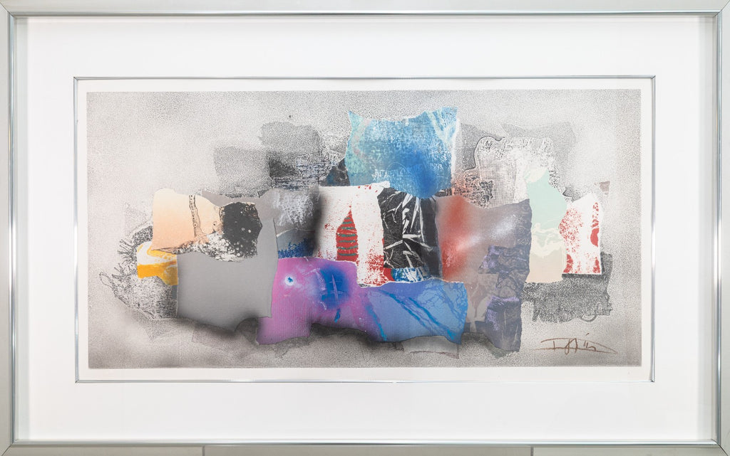 A vibrant modern abstract composition by Hungarian-American artist Laszlo Dus's, executed as a unique monotype on paper, circa 1980. Hand signed lower right. This work features layered textures, painterly passages, and a striking interplay of vivid color fields against a subtle monochrome background, reflecting Dus's hallmark fusion of abstraction and structural design. This artwork exemplifies Dus's contributions to postmodern abstraction and experimental printmaking. From a private collection. Dimensions: 33.5"h x 53"w x 2"d (framed). In very good vintage condition.